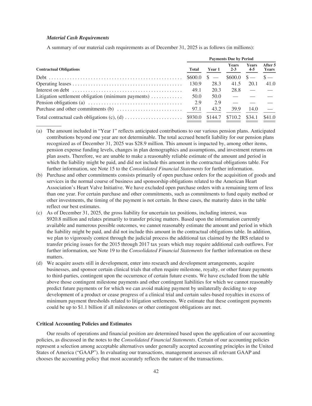 Material Cash Requirements A summary of our material cash requirements as of December 31, 2025 is as follows (in millions): Payments Due by Period Contractual Obligations Total Year 1 Years 2-3 Years 4-5 After 5 Years Debt . . . . . . . . . . . . . . . . . . . . . . . . . . . . . . . . . . . . . . . . . . . . . . . . . . . $600.0 $ — $600.0 $ — $ — Operating leases . . . . . . . . . . . . . . . . . . . . . . . . . . . . . . . . . . . . . . . . . . 130.9 28.3 41.5 20.1 41.0 Interest on debt . . . . . . . . . . . . . . . . . . . . . . . . . . . . . . . . . . . . . . . . . . 49.1 20.3 28.8 — — Litigation settlement obligation (minimum payments) . . . . . . . . . . . . 50.0 50.0 — — — Pension obligations (a) . . . . . . . . . . . . . . . . . . . . . . . . . . . . . . . . . . . . 2.9 2.9 — — — Purchase and other commitments (b) . . . . . . . . . . . . . . . . . . . . . . . . . 97.1 43.2 39.9 14.0 — Total contractual cash obligations (c), (d) . . . . . . . . . . . . . . . . . . . . . . $930.0 $144.7 $710.2 $34.1 $41.0 (a) The amount included in “Year 1” reflects anticipated contributions to our various pension plans. Anticipated contributions beyond one year are not determinable. The total accrued benefit liability for our pension plans recognized as of December 31, 2025 was $28.9 million. This amount is impacted by, among other items, pension expense funding levels, changes in plan demographics and assumptions, and investment returns on plan assets. Therefore, we are unable to make a reasonably reliable estimate of the amount and period in which the liability might be paid, and did not include this amount in the contractual obligations table. For further information, see Note 15 to the Consolidated Financial Statements for further information. (b) Purchase and other commitments consists primarily of open purchase orders for the acquisition of goods and services in the normal course of business and sponsorship obligations related to the American Heart Association’s Heart Valve Initiative. We have excluded open purchase orders with a remaining term of less than one year. For certain purchase and other commitments, such as commitments to fund equity method or other investments, the timing of the payment is not certain. In these cases, the maturity dates in the table reflect our best estimates. (c) As of December 31, 2025, the gross liability for uncertain tax positions, including interest, was $920.8 million and relates primarily to transfer pricing matters. Based upon the information currently available and numerous possible outcomes, we cannot reasonably estimate the amount and period in which the liability might be paid, and did not include this amount in the contractual obligations table. In addition, we plan to vigorously contest through the judicial process the additional tax claimed by the IRS related to transfer pricing issues for the 2015 through 2017 tax years which may require additional cash outflows. For further information, see Note 19 to the Consolidated Financial Statements for further information on these matters. (d) We acquire assets still in development, enter into research and development arrangements, acquire businesses, and sponsor certain clinical trials that often require milestone, royalty, or other future payments to third-parties, contingent upon the occurrence of certain future events. We have excluded from the table above those contingent milestone payments and other contingent liabilities for which we cannot reasonably predict future payments or for which we can avoid making payment by unilaterally deciding to stop development of a product or cease progress of a clinical trial and certain sales-based royalties in excess of minimum payment thresholds related to litigation settlements. We estimate that these contingent payments could be up to $1.1 billion if all milestones or other contingent obligations are met. Critical Accounting Policies and Estimates Our results of operations and financial position are determined based upon the application of our accounting policies, as discussed in the notes to the Consolidated Financial Statements. Certain of our accounting policies represent a selection among acceptable alternatives under generally accepted accounting principles in the United States of America (“GAAP”). In evaluating our transactions, management assesses all relevant GAAP and chooses the accounting policy that most accurately reflects the nature of the transactions. 42