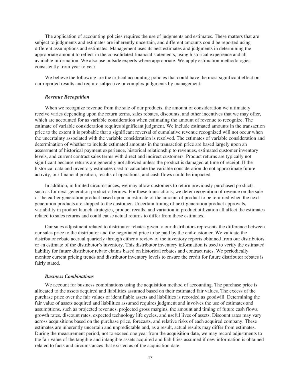 The application of accounting policies requires the use of judgments and estimates. These matters that are subject to judgments and estimates are inherently uncertain, and different amounts could be reported using different assumptions and estimates. Management uses its best estimates and judgments in determining the appropriate amount to reflect in the consolidated financial statements, using historical experience and all available information. We also use outside experts where appropriate. We apply estimation methodologies consistently from year to year. We believe the following are the critical accounting policies that could have the most significant effect on our reported results and require subjective or complex judgments by management. Revenue Recognition When we recognize revenue from the sale of our products, the amount of consideration we ultimately receive varies depending upon the return terms, sales rebates, discounts, and other incentives that we may offer, which are accounted for as variable consideration when estimating the amount of revenue to recognize. The estimate of variable consideration requires significant judgment. We include estimated amounts in the transaction price to the extent it is probable that a significant reversal of cumulative revenue recognized will not occur when the uncertainty associated with the variable consideration is resolved. The estimates of variable consideration and determination of whether to include estimated amounts in the transaction price are based largely upon an assessment of historical payment experience, historical relationship to revenues, estimated customer inventory levels, and current contract sales terms with direct and indirect customers. Product returns are typically not significant because returns are generally not allowed unless the product is damaged at time of receipt. If the historical data and inventory estimates used to calculate the variable consideration do not approximate future activity, our financial position, results of operations, and cash flows could be impacted. In addition, in limited circumstances, we may allow customers to return previously purchased products, such as for next-generation product offerings. For these transactions, we defer recognition of revenue on the sale of the earlier generation product based upon an estimate of the amount of product to be returned when the next- generation products are shipped to the customer. Uncertain timing of next-generation product approvals, variability in product launch strategies, product recalls, and variation in product utilization all affect the estimates related to sales returns and could cause actual returns to differ from these estimates. Our sales adjustment related to distributor rebates given to our distributors represents the difference between our sales price to the distributor and the negotiated price to be paid by the end-customer. We validate the distributor rebate accrual quarterly through either a review of the inventory reports obtained from our distributors or an estimate of the distributor’s inventory. This distributor inventory information is used to verify the estimated liability for future distributor rebate claims based on historical rebates and contract rates. We periodically monitor current pricing trends and distributor inventory levels to ensure the credit for future distributor rebates is fairly stated. Business Combinations We account for business combinations using the acquisition method of accounting. The purchase price is allocated to the assets acquired and liabilities assumed based on their estimated fair values. The excess of the purchase price over the fair values of identifiable assets and liabilities is recorded as goodwill. Determining the fair value of assets acquired and liabilities assumed requires judgment and involves the use of estimates and assumptions, such as projected revenues, projected gross margins, the amount and timing of future cash flows, growth rates, discount rates, expected technology life cycles, and useful lives of assets. Discount rates may vary across acquisitions based on the purchase price, forecasts, and relative risks of each acquired company. These estimates are inherently uncertain and unpredictable and, as a result, actual results may differ from estimates. During the measurement period, not to exceed one year from the acquisition date, we may record adjustments to the fair value of the tangible and intangible assets acquired and liabilities assumed if new information is obtained related to facts and circumstances that existed as of the acquisition date. 43