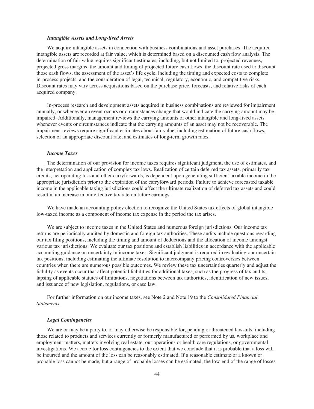 Intangible Assets and Long-lived Assets We acquire intangible assets in connection with business combinations and asset purchases. The acquired intangible assets are recorded at fair value, which is determined based on a discounted cash flow analysis. The determination of fair value requires significant estimates, including, but not limited to, projected revenues, projected gross margins, the amount and timing of projected future cash flows, the discount rate used to discount those cash flows, the assessment of the asset’s life cycle, including the timing and expected costs to complete in-process projects, and the consideration of legal, technical, regulatory, economic, and competitive risks. Discount rates may vary across acquisitions based on the purchase price, forecasts, and relative risks of each acquired company. In-process research and development assets acquired in business combinations are reviewed for impairment annually, or whenever an event occurs or circumstances change that would indicate the carrying amount may be impaired. Additionally, management reviews the carrying amounts of other intangible and long-lived assets whenever events or circumstances indicate that the carrying amounts of an asset may not be recoverable. The impairment reviews require significant estimates about fair value, including estimation of future cash flows, selection of an appropriate discount rate, and estimates of long-term growth rates. Income Taxes The determination of our provision for income taxes requires significant judgment, the use of estimates, and the interpretation and application of complex tax laws. Realization of certain deferred tax assets, primarily tax credits, net operating loss and other carryforwards, is dependent upon generating sufficient taxable income in the appropriate jurisdiction prior to the expiration of the carryforward periods. Failure to achieve forecasted taxable income in the applicable taxing jurisdictions could affect the ultimate realization of deferred tax assets and could result in an increase in our effective tax rate on future earnings. We have made an accounting policy election to recognize the United States tax effects of global intangible low-taxed income as a component of income tax expense in the period the tax arises. We are subject to income taxes in the United States and numerous foreign jurisdictions. Our income tax returns are periodically audited by domestic and foreign tax authorities. These audits include questions regarding our tax filing positions, including the timing and amount of deductions and the allocation of income amongst various tax jurisdictions. We evaluate our tax positions and establish liabilities in accordance with the applicable accounting guidance on uncertainty in income taxes. Significant judgment is required in evaluating our uncertain tax positions, including estimating the ultimate resolution to intercompany pricing controversies between countries when there are numerous possible outcomes. We review these tax uncertainties quarterly and adjust the liability as events occur that affect potential liabilities for additional taxes, such as the progress of tax audits, lapsing of applicable statutes of limitations, negotiations between tax authorities, identification of new issues, and issuance of new legislation, regulations, or case law. For further information on our income taxes, see Note 2 and Note 19 to the Consolidated Financial Statements. Legal Contingencies We are or may be a party to, or may otherwise be responsible for, pending or threatened lawsuits, including those related to products and services currently or formerly manufactured or performed by us, workplace and employment matters, matters involving real estate, our operations or health care regulations, or governmental investigations. We accrue for loss contingencies to the extent that we conclude that it is probable that a loss will be incurred and the amount of the loss can be reasonably estimated. If a reasonable estimate of a known or probable loss cannot be made, but a range of probable losses can be estimated, the low-end of the range of losses 44