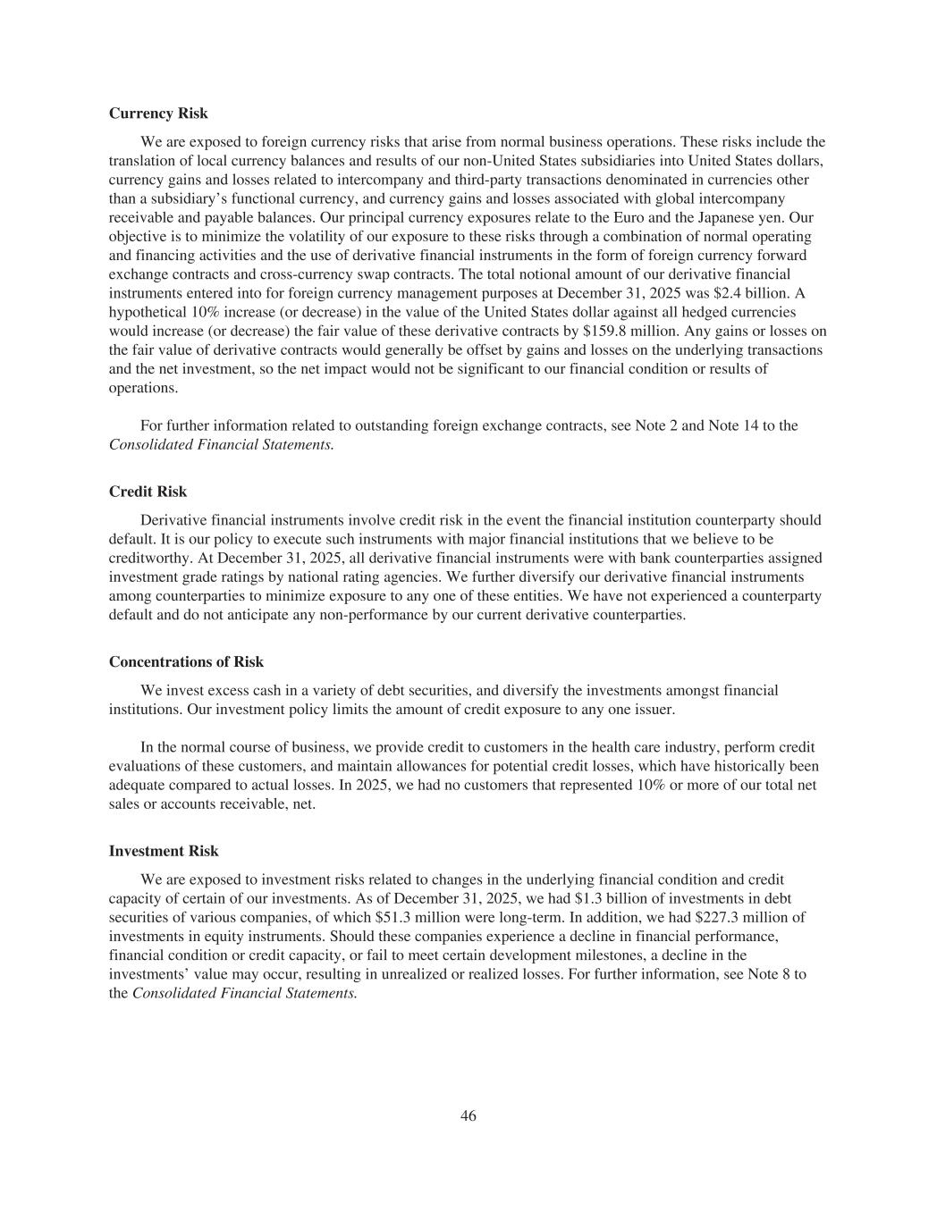Currency Risk We are exposed to foreign currency risks that arise from normal business operations. These risks include the translation of local currency balances and results of our non-United States subsidiaries into United States dollars, currency gains and losses related to intercompany and third-party transactions denominated in currencies other than a subsidiary’s functional currency, and currency gains and losses associated with global intercompany receivable and payable balances. Our principal currency exposures relate to the Euro and the Japanese yen. Our objective is to minimize the volatility of our exposure to these risks through a combination of normal operating and financing activities and the use of derivative financial instruments in the form of foreign currency forward exchange contracts and cross-currency swap contracts. The total notional amount of our derivative financial instruments entered into for foreign currency management purposes at December 31, 2025 was $2.4 billion. A hypothetical 10% increase (or decrease) in the value of the United States dollar against all hedged currencies would increase (or decrease) the fair value of these derivative contracts by $159.8 million. Any gains or losses on the fair value of derivative contracts would generally be offset by gains and losses on the underlying transactions and the net investment, so the net impact would not be significant to our financial condition or results of operations. For further information related to outstanding foreign exchange contracts, see Note 2 and Note 14 to the Consolidated Financial Statements. Credit Risk Derivative financial instruments involve credit risk in the event the financial institution counterparty should default. It is our policy to execute such instruments with major financial institutions that we believe to be creditworthy. At December 31, 2025, all derivative financial instruments were with bank counterparties assigned investment grade ratings by national rating agencies. We further diversify our derivative financial instruments among counterparties to minimize exposure to any one of these entities. We have not experienced a counterparty default and do not anticipate any non-performance by our current derivative counterparties. Concentrations of Risk We invest excess cash in a variety of debt securities, and diversify the investments amongst financial institutions. Our investment policy limits the amount of credit exposure to any one issuer. In the normal course of business, we provide credit to customers in the health care industry, perform credit evaluations of these customers, and maintain allowances for potential credit losses, which have historically been adequate compared to actual losses. In 2025, we had no customers that represented 10% or more of our total net sales or accounts receivable, net. Investment Risk We are exposed to investment risks related to changes in the underlying financial condition and credit capacity of certain of our investments. As of December 31, 2025, we had $1.3 billion of investments in debt securities of various companies, of which $51.3 million were long-term. In addition, we had $227.3 million of investments in equity instruments. Should these companies experience a decline in financial performance, financial condition or credit capacity, or fail to meet certain development milestones, a decline in the investments’ value may occur, resulting in unrealized or realized losses. For further information, see Note 8 to the Consolidated Financial Statements. 46