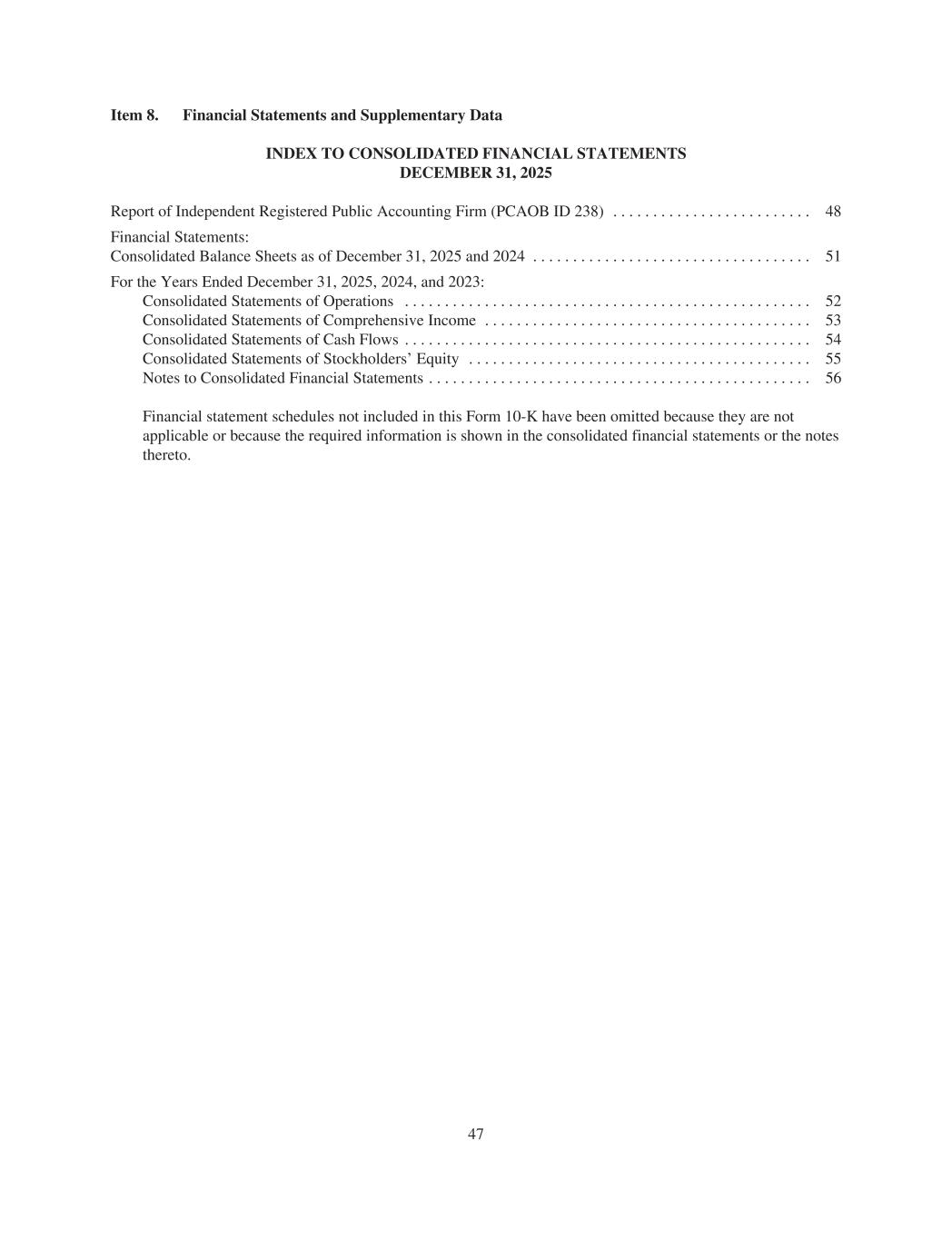 Item 8. Financial Statements and Supplementary Data INDEX TO CONSOLIDATED FINANCIAL STATEMENTS DECEMBER 31, 2025 Report of Independent Registered Public Accounting Firm (PCAOB ID 238) . . . . . . . . . . . . . . . . . . . . . . . . . 48 Financial Statements: Consolidated Balance Sheets as of December 31, 2025 and 2024 . . . . . . . . . . . . . . . . . . . . . . . . . . . . . . . . . . . 51 For the Years Ended December 31, 2025, 2024, and 2023: Consolidated Statements of Operations . . . . . . . . . . . . . . . . . . . . . . . . . . . . . . . . . . . . . . . . . . . . . . . . . . . 52 Consolidated Statements of Comprehensive Income . . . . . . . . . . . . . . . . . . . . . . . . . . . . . . . . . . . . . . . . . 53 Consolidated Statements of Cash Flows . . . . . . . . . . . . . . . . . . . . . . . . . . . . . . . . . . . . . . . . . . . . . . . . . . . 54 Consolidated Statements of Stockholders’ Equity . . . . . . . . . . . . . . . . . . . . . . . . . . . . . . . . . . . . . . . . . . . 55 Notes to Consolidated Financial Statements . . . . . . . . . . . . . . . . . . . . . . . . . . . . . . . . . . . . . . . . . . . . . . . . 56 Financial statement schedules not included in this Form 10-K have been omitted because they are not applicable or because the required information is shown in the consolidated financial statements or the notes thereto. 47