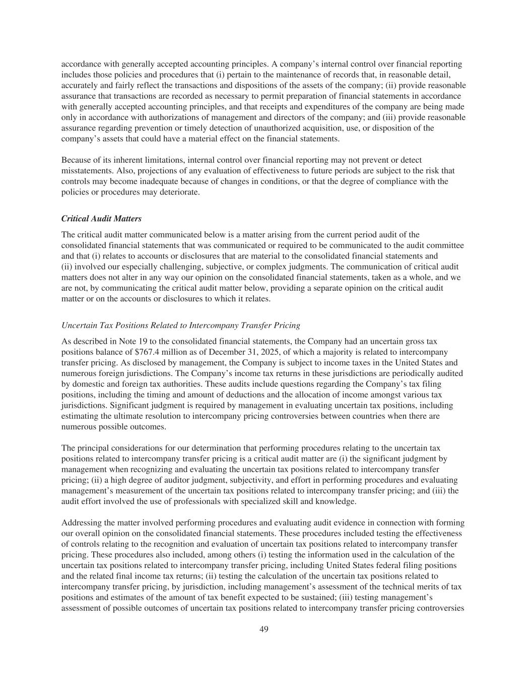accordance with generally accepted accounting principles. A company’s internal control over financial reporting includes those policies and procedures that (i) pertain to the maintenance of records that, in reasonable detail, accurately and fairly reflect the transactions and dispositions of the assets of the company; (ii) provide reasonable assurance that transactions are recorded as necessary to permit preparation of financial statements in accordance with generally accepted accounting principles, and that receipts and expenditures of the company are being made only in accordance with authorizations of management and directors of the company; and (iii) provide reasonable assurance regarding prevention or timely detection of unauthorized acquisition, use, or disposition of the company’s assets that could have a material effect on the financial statements. Because of its inherent limitations, internal control over financial reporting may not prevent or detect misstatements. Also, projections of any evaluation of effectiveness to future periods are subject to the risk that controls may become inadequate because of changes in conditions, or that the degree of compliance with the policies or procedures may deteriorate. Critical Audit Matters The critical audit matter communicated below is a matter arising from the current period audit of the consolidated financial statements that was communicated or required to be communicated to the audit committee and that (i) relates to accounts or disclosures that are material to the consolidated financial statements and (ii) involved our especially challenging, subjective, or complex judgments. The communication of critical audit matters does not alter in any way our opinion on the consolidated financial statements, taken as a whole, and we are not, by communicating the critical audit matter below, providing a separate opinion on the critical audit matter or on the accounts or disclosures to which it relates. Uncertain Tax Positions Related to Intercompany Transfer Pricing As described in Note 19 to the consolidated financial statements, the Company had an uncertain gross tax positions balance of $767.4 million as of December 31, 2025, of which a majority is related to intercompany transfer pricing. As disclosed by management, the Company is subject to income taxes in the United States and numerous foreign jurisdictions. The Company’s income tax returns in these jurisdictions are periodically audited by domestic and foreign tax authorities. These audits include questions regarding the Company’s tax filing positions, including the timing and amount of deductions and the allocation of income amongst various tax jurisdictions. Significant judgment is required by management in evaluating uncertain tax positions, including estimating the ultimate resolution to intercompany pricing controversies between countries when there are numerous possible outcomes. The principal considerations for our determination that performing procedures relating to the uncertain tax positions related to intercompany transfer pricing is a critical audit matter are (i) the significant judgment by management when recognizing and evaluating the uncertain tax positions related to intercompany transfer pricing; (ii) a high degree of auditor judgment, subjectivity, and effort in performing procedures and evaluating management’s measurement of the uncertain tax positions related to intercompany transfer pricing; and (iii) the audit effort involved the use of professionals with specialized skill and knowledge. Addressing the matter involved performing procedures and evaluating audit evidence in connection with forming our overall opinion on the consolidated financial statements. These procedures included testing the effectiveness of controls relating to the recognition and evaluation of uncertain tax positions related to intercompany transfer pricing. These procedures also included, among others (i) testing the information used in the calculation of the uncertain tax positions related to intercompany transfer pricing, including United States federal filing positions and the related final income tax returns; (ii) testing the calculation of the uncertain tax positions related to intercompany transfer pricing, by jurisdiction, including management’s assessment of the technical merits of tax positions and estimates of the amount of tax benefit expected to be sustained; (iii) testing management’s assessment of possible outcomes of uncertain tax positions related to intercompany transfer pricing controversies 49