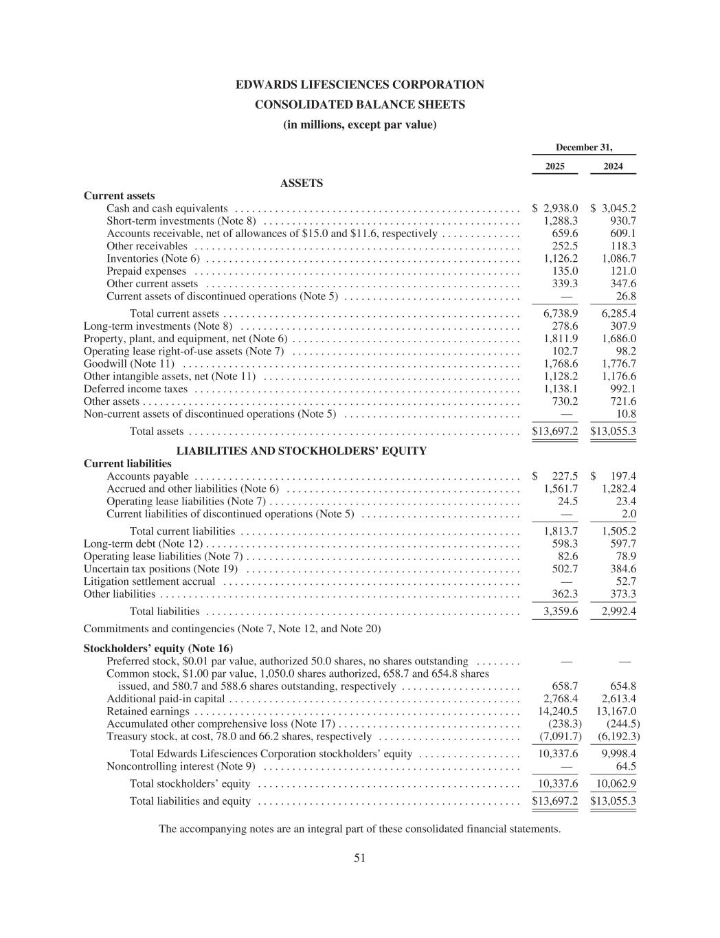 EDWARDS LIFESCIENCES CORPORATION CONSOLIDATED BALANCE SHEETS (in millions, except par value) December 31, 2025 2024 ASSETS Current assets Cash and cash equivalents . . . . . . . . . . . . . . . . . . . . . . . . . . . . . . . . . . . . . . . . . . . . . . . . . . $ 2,938.0 $ 3,045.2 Short-term investments (Note 8) . . . . . . . . . . . . . . . . . . . . . . . . . . . . . . . . . . . . . . . . . . . . . 1,288.3 930.7 Accounts receivable, net of allowances of $15.0 and $11.6, respectively . . . . . . . . . . . . . . 659.6 609.1 Other receivables . . . . . . . . . . . . . . . . . . . . . . . . . . . . . . . . . . . . . . . . . . . . . . . . . . . . . . . . . 252.5 118.3 Inventories (Note 6) . . . . . . . . . . . . . . . . . . . . . . . . . . . . . . . . . . . . . . . . . . . . . . . . . . . . . . . 1,126.2 1,086.7 Prepaid expenses . . . . . . . . . . . . . . . . . . . . . . . . . . . . . . . . . . . . . . . . . . . . . . . . . . . . . . . . . 135.0 121.0 Other current assets . . . . . . . . . . . . . . . . . . . . . . . . . . . . . . . . . . . . . . . . . . . . . . . . . . . . . . . 339.3 347.6 Current assets of discontinued operations (Note 5) . . . . . . . . . . . . . . . . . . . . . . . . . . . . . . . — 26.8 Total current assets . . . . . . . . . . . . . . . . . . . . . . . . . . . . . . . . . . . . . . . . . . . . . . . . . . . . 6,738.9 6,285.4 Long-term investments (Note 8) . . . . . . . . . . . . . . . . . . . . . . . . . . . . . . . . . . . . . . . . . . . . . . . . . 278.6 307.9 Property, plant, and equipment, net (Note 6) . . . . . . . . . . . . . . . . . . . . . . . . . . . . . . . . . . . . . . . . 1,811.9 1,686.0 Operating lease right-of-use assets (Note 7) . . . . . . . . . . . . . . . . . . . . . . . . . . . . . . . . . . . . . . . . 102.7 98.2 Goodwill (Note 11) . . . . . . . . . . . . . . . . . . . . . . . . . . . . . . . . . . . . . . . . . . . . . . . . . . . . . . . . . . . 1,768.6 1,776.7 Other intangible assets, net (Note 11) . . . . . . . . . . . . . . . . . . . . . . . . . . . . . . . . . . . . . . . . . . . . . 1,128.2 1,176.6 Deferred income taxes . . . . . . . . . . . . . . . . . . . . . . . . . . . . . . . . . . . . . . . . . . . . . . . . . . . . . . . . . 1,138.1 992.1 Other assets . . . . . . . . . . . . . . . . . . . . . . . . . . . . . . . . . . . . . . . . . . . . . . . . . . . . . . . . . . . . . . . . . . 730.2 721.6 Non-current assets of discontinued operations (Note 5) . . . . . . . . . . . . . . . . . . . . . . . . . . . . . . . — 10.8 Total assets . . . . . . . . . . . . . . . . . . . . . . . . . . . . . . . . . . . . . . . . . . . . . . . . . . . . . . . . . . $13,697.2 $13,055.3 LIABILITIES AND STOCKHOLDERS’ EQUITY Current liabilities Accounts payable . . . . . . . . . . . . . . . . . . . . . . . . . . . . . . . . . . . . . . . . . . . . . . . . . . . . . . . . . $ 227.5 $ 197.4 Accrued and other liabilities (Note 6) . . . . . . . . . . . . . . . . . . . . . . . . . . . . . . . . . . . . . . . . . 1,561.7 1,282.4 Operating lease liabilities (Note 7) . . . . . . . . . . . . . . . . . . . . . . . . . . . . . . . . . . . . . . . . . . . . 24.5 23.4 Current liabilities of discontinued operations (Note 5) . . . . . . . . . . . . . . . . . . . . . . . . . . . . — 2.0 Total current liabilities . . . . . . . . . . . . . . . . . . . . . . . . . . . . . . . . . . . . . . . . . . . . . . . . . 1,813.7 1,505.2 Long-term debt (Note 12) . . . . . . . . . . . . . . . . . . . . . . . . . . . . . . . . . . . . . . . . . . . . . . . . . . . . . . . 598.3 597.7 Operating lease liabilities (Note 7) . . . . . . . . . . . . . . . . . . . . . . . . . . . . . . . . . . . . . . . . . . . . . . . . 82.6 78.9 Uncertain tax positions (Note 19) . . . . . . . . . . . . . . . . . . . . . . . . . . . . . . . . . . . . . . . . . . . . . . . . 502.7 384.6 Litigation settlement accrual . . . . . . . . . . . . . . . . . . . . . . . . . . . . . . . . . . . . . . . . . . . . . . . . . . . . — 52.7 Other liabilities . . . . . . . . . . . . . . . . . . . . . . . . . . . . . . . . . . . . . . . . . . . . . . . . . . . . . . . . . . . . . . . 362.3 373.3 Total liabilities . . . . . . . . . . . . . . . . . . . . . . . . . . . . . . . . . . . . . . . . . . . . . . . . . . . . . . . 3,359.6 2,992.4 Commitments and contingencies (Note 7, Note 12, and Note 20) Stockholders’ equity (Note 16) Preferred stock, $0.01 par value, authorized 50.0 shares, no shares outstanding . . . . . . . . — — Common stock, $1.00 par value, 1,050.0 shares authorized, 658.7 and 654.8 shares issued, and 580.7 and 588.6 shares outstanding, respectively . . . . . . . . . . . . . . . . . . . . . 658.7 654.8 Additional paid-in capital . . . . . . . . . . . . . . . . . . . . . . . . . . . . . . . . . . . . . . . . . . . . . . . . . . . 2,768.4 2,613.4 Retained earnings . . . . . . . . . . . . . . . . . . . . . . . . . . . . . . . . . . . . . . . . . . . . . . . . . . . . . . . . . 14,240.5 13,167.0 Accumulated other comprehensive loss (Note 17) . . . . . . . . . . . . . . . . . . . . . . . . . . . . . . . . (238.3) (244.5) Treasury stock, at cost, 78.0 and 66.2 shares, respectively . . . . . . . . . . . . . . . . . . . . . . . . . (7,091.7) (6,192.3) Total Edwards Lifesciences Corporation stockholders’ equity . . . . . . . . . . . . . . . . . . 10,337.6 9,998.4 Noncontrolling interest (Note 9) . . . . . . . . . . . . . . . . . . . . . . . . . . . . . . . . . . . . . . . . . . . . . — 64.5 Total stockholders’ equity . . . . . . . . . . . . . . . . . . . . . . . . . . . . . . . . . . . . . . . . . . . . . . 10,337.6 10,062.9 Total liabilities and equity . . . . . . . . . . . . . . . . . . . . . . . . . . . . . . . . . . . . . . . . . . . . . . $13,697.2 $13,055.3 The accompanying notes are an integral part of these consolidated financial statements. 51