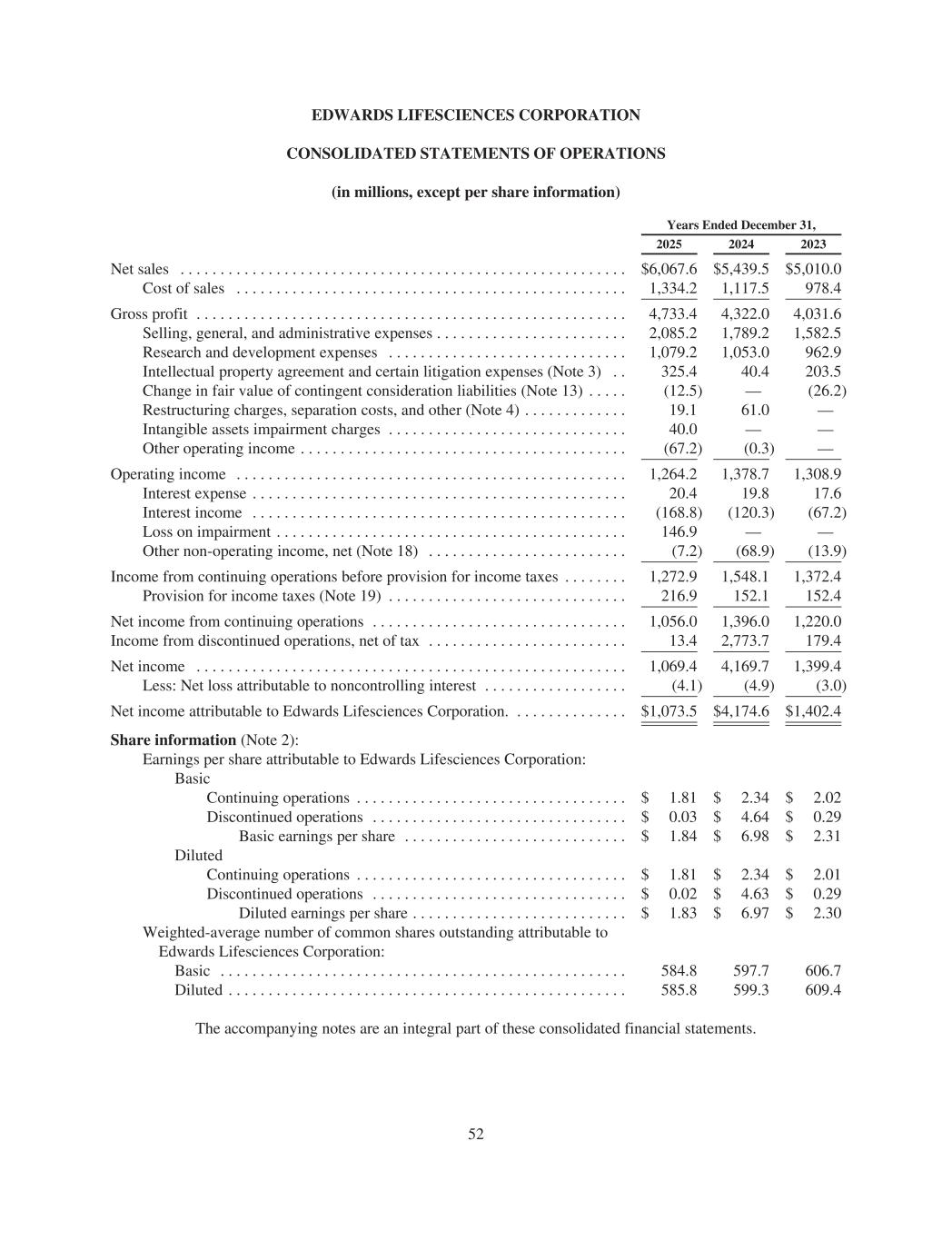 EDWARDS LIFESCIENCES CORPORATION CONSOLIDATED STATEMENTS OF OPERATIONS (in millions, except per share information) Years Ended December 31, 2025 2024 2023 Net sales . . . . . . . . . . . . . . . . . . . . . . . . . . . . . . . . . . . . . . . . . . . . . . . . . . . . . . . . $6,067.6 $5,439.5 $5,010.0 Cost of sales . . . . . . . . . . . . . . . . . . . . . . . . . . . . . . . . . . . . . . . . . . . . . . . . . 1,334.2 1,117.5 978.4 Gross profit . . . . . . . . . . . . . . . . . . . . . . . . . . . . . . . . . . . . . . . . . . . . . . . . . . . . . . 4,733.4 4,322.0 4,031.6 Selling, general, and administrative expenses . . . . . . . . . . . . . . . . . . . . . . . . 2,085.2 1,789.2 1,582.5 Research and development expenses . . . . . . . . . . . . . . . . . . . . . . . . . . . . . . 1,079.2 1,053.0 962.9 Intellectual property agreement and certain litigation expenses (Note 3) . . 325.4 40.4 203.5 Change in fair value of contingent consideration liabilities (Note 13) . . . . . (12.5) — (26.2) Restructuring charges, separation costs, and other (Note 4) . . . . . . . . . . . . . 19.1 61.0 — Intangible assets impairment charges . . . . . . . . . . . . . . . . . . . . . . . . . . . . . . 40.0 — — Other operating income . . . . . . . . . . . . . . . . . . . . . . . . . . . . . . . . . . . . . . . . . (67.2) (0.3) — Operating income . . . . . . . . . . . . . . . . . . . . . . . . . . . . . . . . . . . . . . . . . . . . . . . . . 1,264.2 1,378.7 1,308.9 Interest expense . . . . . . . . . . . . . . . . . . . . . . . . . . . . . . . . . . . . . . . . . . . . . . . 20.4 19.8 17.6 Interest income . . . . . . . . . . . . . . . . . . . . . . . . . . . . . . . . . . . . . . . . . . . . . . . (168.8) (120.3) (67.2) Loss on impairment . . . . . . . . . . . . . . . . . . . . . . . . . . . . . . . . . . . . . . . . . . . . 146.9 — — Other non-operating income, net (Note 18) . . . . . . . . . . . . . . . . . . . . . . . . . (7.2) (68.9) (13.9) Income from continuing operations before provision for income taxes . . . . . . . . 1,272.9 1,548.1 1,372.4 Provision for income taxes (Note 19) . . . . . . . . . . . . . . . . . . . . . . . . . . . . . . 216.9 152.1 152.4 Net income from continuing operations . . . . . . . . . . . . . . . . . . . . . . . . . . . . . . . . 1,056.0 1,396.0 1,220.0 Income from discontinued operations, net of tax . . . . . . . . . . . . . . . . . . . . . . . . . 13.4 2,773.7 179.4 Net income . . . . . . . . . . . . . . . . . . . . . . . . . . . . . . . . . . . . . . . . . . . . . . . . . . . . . . 1,069.4 4,169.7 1,399.4 Less: Net loss attributable to noncontrolling interest . . . . . . . . . . . . . . . . . . (4.1) (4.9) (3.0) Net income attributable to Edwards Lifesciences Corporation. . . . . . . . . . . . . . . $1,073.5 $4,174.6 $1,402.4 Share information (Note 2): Earnings per share attributable to Edwards Lifesciences Corporation: Basic Continuing operations . . . . . . . . . . . . . . . . . . . . . . . . . . . . . . . . . . $ 1.81 $ 2.34 $ 2.02 Discontinued operations . . . . . . . . . . . . . . . . . . . . . . . . . . . . . . . . $ 0.03 $ 4.64 $ 0.29 Basic earnings per share . . . . . . . . . . . . . . . . . . . . . . . . . . . . $ 1.84 $ 6.98 $ 2.31 Diluted Continuing operations . . . . . . . . . . . . . . . . . . . . . . . . . . . . . . . . . . $ 1.81 $ 2.34 $ 2.01 Discontinued operations . . . . . . . . . . . . . . . . . . . . . . . . . . . . . . . . $ 0.02 $ 4.63 $ 0.29 Diluted earnings per share . . . . . . . . . . . . . . . . . . . . . . . . . . . $ 1.83 $ 6.97 $ 2.30 Weighted-average number of common shares outstanding attributable to Edwards Lifesciences Corporation: Basic . . . . . . . . . . . . . . . . . . . . . . . . . . . . . . . . . . . . . . . . . . . . . . . . . . . 584.8 597.7 606.7 Diluted . . . . . . . . . . . . . . . . . . . . . . . . . . . . . . . . . . . . . . . . . . . . . . . . . . 585.8 599.3 609.4 The accompanying notes are an integral part of these consolidated financial statements. 52