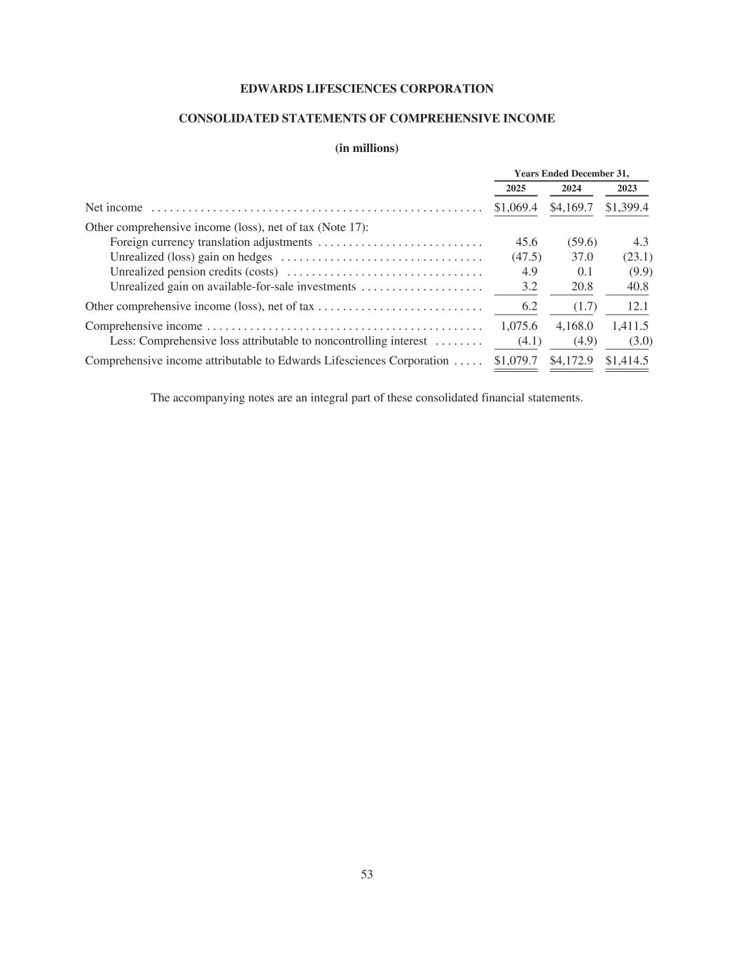 EDWARDS LIFESCIENCES CORPORATION CONSOLIDATED STATEMENTS OF COMPREHENSIVE INCOME (in millions) Years Ended December 31, 2025 2024 2023 Net income . . . . . . . . . . . . . . . . . . . . . . . . . . . . . . . . . . . . . . . . . . . . . . . . . . . . . . $1,069.4 $4,169.7 $1,399.4 Other comprehensive income (loss), net of tax (Note 17): Foreign currency translation adjustments . . . . . . . . . . . . . . . . . . . . . . . . . . . 45.6 (59.6) 4.3 Unrealized (loss) gain on hedges . . . . . . . . . . . . . . . . . . . . . . . . . . . . . . . . . (47.5) 37.0 (23.1) Unrealized pension credits (costs) . . . . . . . . . . . . . . . . . . . . . . . . . . . . . . . . 4.9 0.1 (9.9) Unrealized gain on available-for-sale investments . . . . . . . . . . . . . . . . . . . . 3.2 20.8 40.8 Other comprehensive income (loss), net of tax . . . . . . . . . . . . . . . . . . . . . . . . . . . 6.2 (1.7) 12.1 Comprehensive income . . . . . . . . . . . . . . . . . . . . . . . . . . . . . . . . . . . . . . . . . . . . . 1,075.6 4,168.0 1,411.5 Less: Comprehensive loss attributable to noncontrolling interest . . . . . . . . (4.1) (4.9) (3.0) Comprehensive income attributable to Edwards Lifesciences Corporation . . . . . $1,079.7 $4,172.9 $1,414.5 The accompanying notes are an integral part of these consolidated financial statements. 53