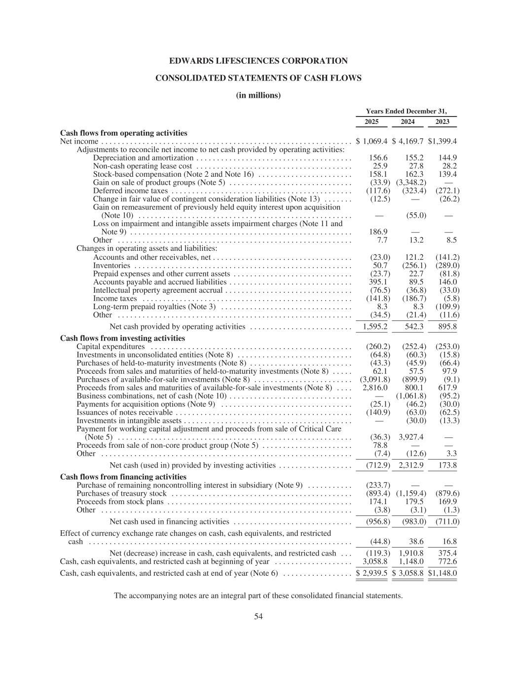 EDWARDS LIFESCIENCES CORPORATION CONSOLIDATED STATEMENTS OF CASH FLOWS (in millions) Years Ended December 31, 2025 2024 2023 Cash flows from operating activities Net income . . . . . . . . . . . . . . . . . . . . . . . . . . . . . . . . . . . . . . . . . . . . . . . . . . . . . . . . . . . . . $ 1,069.4 $ 4,169.7 $1,399.4 Adjustments to reconcile net income to net cash provided by operating activities: Depreciation and amortization . . . . . . . . . . . . . . . . . . . . . . . . . . . . . . . . . . . . . . 156.6 155.2 144.9 Non-cash operating lease cost . . . . . . . . . . . . . . . . . . . . . . . . . . . . . . . . . . . . . . 25.9 27.8 28.2 Stock-based compensation (Note 2 and Note 16) . . . . . . . . . . . . . . . . . . . . . . . 158.1 162.3 139.4 Gain on sale of product groups (Note 5) . . . . . . . . . . . . . . . . . . . . . . . . . . . . . . (33.9) (3,348.2) — Deferred income taxes . . . . . . . . . . . . . . . . . . . . . . . . . . . . . . . . . . . . . . . . . . . . (117.6) (323.4) (272.1) Change in fair value of contingent consideration liabilities (Note 13) . . . . . . . (12.5) — (26.2) Gain on remeasurement of previously held equity interest upon acquisition (Note 10) . . . . . . . . . . . . . . . . . . . . . . . . . . . . . . . . . . . . . . . . . . . . . . . . . . . . — (55.0) — Loss on impairment and intangible assets impairment charges (Note 11 and Note 9) . . . . . . . . . . . . . . . . . . . . . . . . . . . . . . . . . . . . . . . . . . . . . . . . . . . . . . 186.9 — — Other . . . . . . . . . . . . . . . . . . . . . . . . . . . . . . . . . . . . . . . . . . . . . . . . . . . . . . . . . 7.7 13.2 8.5 Changes in operating assets and liabilities: Accounts and other receivables, net . . . . . . . . . . . . . . . . . . . . . . . . . . . . . . . . . . (23.0) 121.2 (141.2) Inventories . . . . . . . . . . . . . . . . . . . . . . . . . . . . . . . . . . . . . . . . . . . . . . . . . . . . . 50.7 (256.1) (289.0) Prepaid expenses and other current assets . . . . . . . . . . . . . . . . . . . . . . . . . . . . . (23.7) 22.7 (81.8) Accounts payable and accrued liabilities . . . . . . . . . . . . . . . . . . . . . . . . . . . . . . 395.1 89.5 146.0 Intellectual property agreement accrual . . . . . . . . . . . . . . . . . . . . . . . . . . . . . . . (76.5) (36.8) (33.0) Income taxes . . . . . . . . . . . . . . . . . . . . . . . . . . . . . . . . . . . . . . . . . . . . . . . . . . . (141.8) (186.7) (5.8) Long-term prepaid royalties (Note 3) . . . . . . . . . . . . . . . . . . . . . . . . . . . . . . . . 8.3 8.3 (109.9) Other . . . . . . . . . . . . . . . . . . . . . . . . . . . . . . . . . . . . . . . . . . . . . . . . . . . . . . . . . (34.5) (21.4) (11.6) Net cash provided by operating activities . . . . . . . . . . . . . . . . . . . . . . . . . 1,595.2 542.3 895.8 Cash flows from investing activities Capital expenditures . . . . . . . . . . . . . . . . . . . . . . . . . . . . . . . . . . . . . . . . . . . . . . . . . (260.2) (252.4) (253.0) Investments in unconsolidated entities (Note 8) . . . . . . . . . . . . . . . . . . . . . . . . . . . . (64.8) (60.3) (15.8) Purchases of held-to-maturity investments (Note 8) . . . . . . . . . . . . . . . . . . . . . . . . . (43.3) (45.9) (66.4) Proceeds from sales and maturities of held-to-maturity investments (Note 8) . . . . . 62.1 57.5 97.9 Purchases of available-for-sale investments (Note 8) . . . . . . . . . . . . . . . . . . . . . . . . (3,091.8) (899.9) (9.1) Proceeds from sales and maturities of available-for-sale investments (Note 8) . . . . 2,816.0 800.1 617.9 Business combinations, net of cash (Note 10) . . . . . . . . . . . . . . . . . . . . . . . . . . . . . . — (1,061.8) (95.2) Payments for acquisition options (Note 9) . . . . . . . . . . . . . . . . . . . . . . . . . . . . . . . . (25.1) (46.2) (30.0) Issuances of notes receivable . . . . . . . . . . . . . . . . . . . . . . . . . . . . . . . . . . . . . . . . . . . (140.9) (63.0) (62.5) Investments in intangible assets . . . . . . . . . . . . . . . . . . . . . . . . . . . . . . . . . . . . . . . . . — (30.0) (13.3) Payment for working capital adjustment and proceeds from sale of Critical Care (Note 5) . . . . . . . . . . . . . . . . . . . . . . . . . . . . . . . . . . . . . . . . . . . . . . . . . . . . . . . . . (36.3) 3,927.4 — Proceeds from sale of non-core product group (Note 5) . . . . . . . . . . . . . . . . . . . . . . 78.8 — — Other . . . . . . . . . . . . . . . . . . . . . . . . . . . . . . . . . . . . . . . . . . . . . . . . . . . . . . . . . . . . . (7.4) (12.6) 3.3 Net cash (used in) provided by investing activities . . . . . . . . . . . . . . . . . . (712.9) 2,312.9 173.8 Cash flows from financing activities Purchase of remaining noncontrolling interest in subsidiary (Note 9) . . . . . . . . . . . (233.7) — — Purchases of treasury stock . . . . . . . . . . . . . . . . . . . . . . . . . . . . . . . . . . . . . . . . . . . . (893.4) (1,159.4) (879.6) Proceeds from stock plans . . . . . . . . . . . . . . . . . . . . . . . . . . . . . . . . . . . . . . . . . . . . . 174.1 179.5 169.9 Other . . . . . . . . . . . . . . . . . . . . . . . . . . . . . . . . . . . . . . . . . . . . . . . . . . . . . . . . . . . . . (3.8) (3.1) (1.3) Net cash used in financing activities . . . . . . . . . . . . . . . . . . . . . . . . . . . . . (956.8) (983.0) (711.0) Effect of currency exchange rate changes on cash, cash equivalents, and restricted cash . . . . . . . . . . . . . . . . . . . . . . . . . . . . . . . . . . . . . . . . . . . . . . . . . . . . . . . . . . . . . . . . (44.8) 38.6 16.8 Net (decrease) increase in cash, cash equivalents, and restricted cash . . . (119.3) 1,910.8 375.4 Cash, cash equivalents, and restricted cash at beginning of year . . . . . . . . . . . . . . . . . . . 3,058.8 1,148.0 772.6 Cash, cash equivalents, and restricted cash at end of year (Note 6) . . . . . . . . . . . . . . . . . $ 2,939.5 $ 3,058.8 $1,148.0 The accompanying notes
