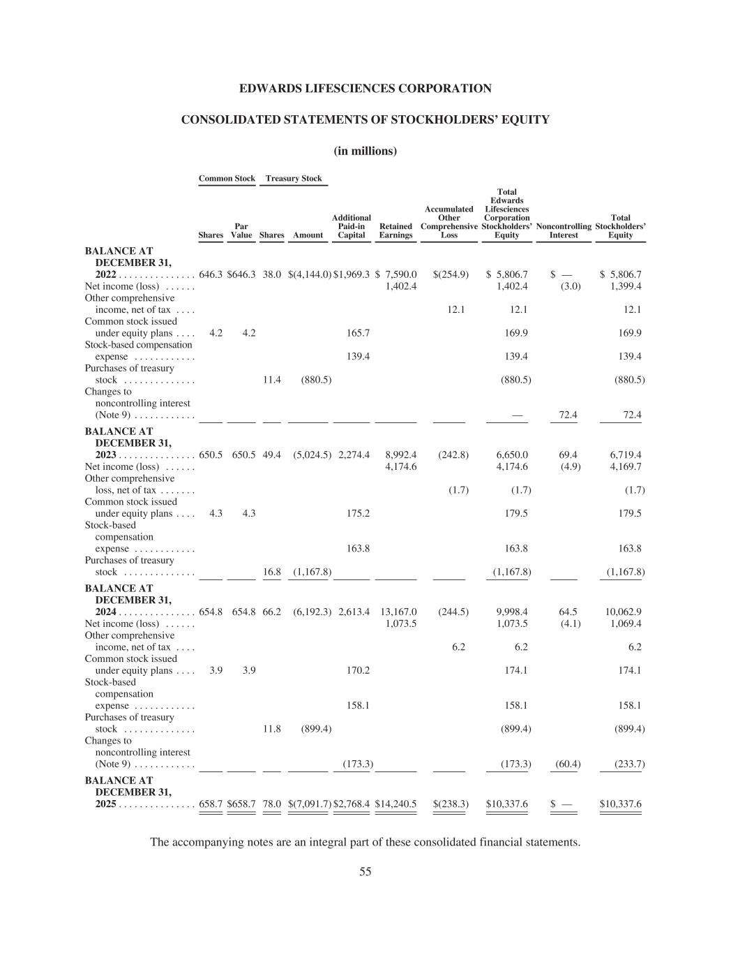 EDWARDS LIFESCIENCES CORPORATION CONSOLIDATED STATEMENTS OF STOCKHOLDERS’ EQUITY (in millions) Common Stock Treasury Stock Shares Par Value Shares Amount Additional Paid-in Capital Retained Earnings Accumulated Other Comprehensive Loss Total Edwards Lifesciences Corporation Stockholders’ Equity Noncontrolling Interest Total Stockholders’ Equity BALANCE AT DECEMBER 31, 2022 . . . . . . . . . . . . . . . 646.3 $646.3 38.0 $(4,144.0) $1,969.3 $ 7,590.0 $(254.9) $ 5,806.7 $ — $ 5,806.7 Net income (loss) . . . . . . 1,402.4 1,402.4 (3.0) 1,399.4 Other comprehensive income, net of tax . . . . 12.1 12.1 12.1 Common stock issued under equity plans . . . . 4.2 4.2 165.7 169.9 169.9 Stock-based compensation expense . . . . . . . . . . . . 139.4 139.4 139.4 Purchases of treasury stock . . . . . . . . . . . . . . 11.4 (880.5) (880.5) (880.5) Changes to noncontrolling interest (Note 9) . . . . . . . . . . . . — 72.4 72.4 BALANCE AT DECEMBER 31, 2023 . . . . . . . . . . . . . . . 650.5 650.5 49.4 (5,024.5) 2,274.4 8,992.4 (242.8) 6,650.0 69.4 6,719.4 Net income (loss) . . . . . . 4,174.6 4,174.6 (4.9) 4,169.7 Other comprehensive loss, net of tax . . . . . . . (1.7) (1.7) (1.7) Common stock issued under equity plans . . . . 4.3 4.3 175.2 179.5 179.5 Stock-based compensation expense . . . . . . . . . . . . 163.8 163.8 163.8 Purchases of treasury stock . . . . . . . . . . . . . . 16.8 (1,167.8) (1,167.8) (1,167.8) BALANCE AT DECEMBER 31, 2024 . . . . . . . . . . . . . . . 654.8 654.8 66.2 (6,192.3) 2,613.4 13,167.0 (244.5) 9,998.4 64.5 10,062.9 Net income (loss) . . . . . . 1,073.5 1,073.5 (4.1) 1,069.4 Other comprehensive income, net of tax . . . . 6.2 6.2 6.2 Common stock issued under equity plans . . . . 3.9 3.9 170.2 174.1 174.1 Stock-based compensation expense . . . . . . . . . . . . 158.1 158.1 158.1 Purchases of treasury stock . . . . . . . . . . . . . . 11.8 (899.4) (899.4) (899.4) Changes to noncontrolling interest (Note 9) . . . . . . . . . . . . (173.3) (173.3) (60.4) (233.7) BALANCE AT DECEMBER 31, 2025 . . . . . . . . . . . . . . . 658.7 $658.7 78.0 $(7,091.7) $2,768.4 $14,240.5 $(238.3) $10,337.6 $ — $10,337.6 The accompanying notes are an integral part of these consolidated financial statements. 55