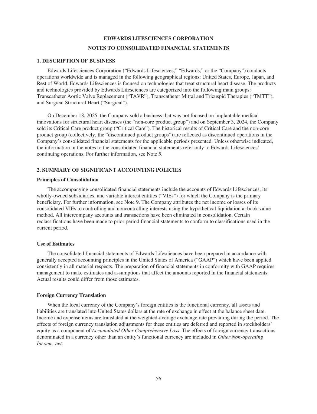 EDWARDS LIFESCIENCES CORPORATION NOTES TO CONSOLIDATED FINANCIAL STATEMENTS 1. DESCRIPTION OF BUSINESS Edwards Lifesciences Corporation (“Edwards Lifesciences,” “Edwards,” or the “Company”) conducts operations worldwide and is managed in the following geographical regions: United States, Europe, Japan, and Rest of World. Edwards Lifesciences is focused on technologies that treat structural heart disease. The products and technologies provided by Edwards Lifesciences are categorized into the following main groups: Transcatheter Aortic Valve Replacement (“TAVR”), Transcatheter Mitral and Tricuspid Therapies (“TMTT”), and Surgical Structural Heart (“Surgical”). On December 18, 2025, the Company sold a business that was not focused on implantable medical innovations for structural heart diseases (the “non-core product group”) and on September 3, 2024, the Company sold its Critical Care product group (“Critical Care”). The historical results of Critical Care and the non-core product group (collectively, the “discontinued product groups”) are reflected as discontinued operations in the Company’s consolidated financial statements for the applicable periods presented. Unless otherwise indicated, the information in the notes to the consolidated financial statements refer only to Edwards Lifesciences’ continuing operations. For further information, see Note 5. 2. SUMMARY OF SIGNIFICANT ACCOUNTING POLICIES Principles of Consolidation The accompanying consolidated financial statements include the accounts of Edwards Lifesciences, its wholly-owned subsidiaries, and variable interest entities (“VIEs”) for which the Company is the primary beneficiary. For further information, see Note 9. The Company attributes the net income or losses of its consolidated VIEs to controlling and noncontrolling interests using the hypothetical liquidation at book value method. All intercompany accounts and transactions have been eliminated in consolidation. Certain reclassifications have been made to prior period financial statements to conform to classifications used in the current period. Use of Estimates The consolidated financial statements of Edwards Lifesciences have been prepared in accordance with generally accepted accounting principles in the United States of America (“GAAP”) which have been applied consistently in all material respects. The preparation of financial statements in conformity with GAAP requires management to make estimates and assumptions that affect the amounts reported in the financial statements. Actual results could differ from those estimates. Foreign Currency Translation When the local currency of the Company’s foreign entities is the functional currency, all assets and liabilities are translated into United States dollars at the rate of exchange in effect at the balance sheet date. Income and expense items are translated at the weighted-average exchange rate prevailing during the period. The effects of foreign currency translation adjustments for these entities are deferred and reported in stockholders’ equity as a component of Accumulated Other Comprehensive Loss. The effects of foreign currency transactions denominated in a currency other than an entity’s functional currency are included in Other Non-operating Income, net. 56