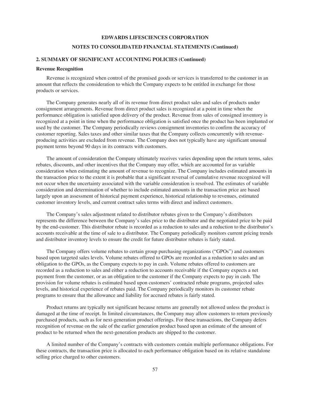 EDWARDS LIFESCIENCES CORPORATION NOTES TO CONSOLIDATED FINANCIAL STATEMENTS (Continued) 2. SUMMARY OF SIGNIFICANT ACCOUNTING POLICIES (Continued) Revenue Recognition Revenue is recognized when control of the promised goods or services is transferred to the customer in an amount that reflects the consideration to which the Company expects to be entitled in exchange for those products or services. The Company generates nearly all of its revenue from direct product sales and sales of products under consignment arrangements. Revenue from direct product sales is recognized at a point in time when the performance obligation is satisfied upon delivery of the product. Revenue from sales of consigned inventory is recognized at a point in time when the performance obligation is satisfied once the product has been implanted or used by the customer. The Company periodically reviews consignment inventories to confirm the accuracy of customer reporting. Sales taxes and other similar taxes that the Company collects concurrently with revenue- producing activities are excluded from revenue. The Company does not typically have any significant unusual payment terms beyond 90 days in its contracts with customers. The amount of consideration the Company ultimately receives varies depending upon the return terms, sales rebates, discounts, and other incentives that the Company may offer, which are accounted for as variable consideration when estimating the amount of revenue to recognize. The Company includes estimated amounts in the transaction price to the extent it is probable that a significant reversal of cumulative revenue recognized will not occur when the uncertainty associated with the variable consideration is resolved. The estimates of variable consideration and determination of whether to include estimated amounts in the transaction price are based largely upon an assessment of historical payment experience, historical relationship to revenues, estimated customer inventory levels, and current contract sales terms with direct and indirect customers. The Company’s sales adjustment related to distributor rebates given to the Company’s distributors represents the difference between the Company’s sales price to the distributor and the negotiated price to be paid by the end-customer. This distributor rebate is recorded as a reduction to sales and a reduction to the distributor’s accounts receivable at the time of sale to a distributor. The Company periodically monitors current pricing trends and distributor inventory levels to ensure the credit for future distributor rebates is fairly stated. The Company offers volume rebates to certain group purchasing organizations (“GPOs”) and customers based upon targeted sales levels. Volume rebates offered to GPOs are recorded as a reduction to sales and an obligation to the GPOs, as the Company expects to pay in cash. Volume rebates offered to customers are recorded as a reduction to sales and either a reduction to accounts receivable if the Company expects a net payment from the customer, or as an obligation to the customer if the Company expects to pay in cash. The provision for volume rebates is estimated based upon customers’ contracted rebate programs, projected sales levels, and historical experience of rebates paid. The Company periodically monitors its customer rebate programs to ensure that the allowance and liability for accrued rebates is fairly stated. Product returns are typically not significant because returns are generally not allowed unless the product is damaged at the time of receipt. In limited circumstances, the Company may allow customers to return previously purchased products, such as for next-generation product offerings. For these transactions, the Company defers recognition of revenue on the sale of the earlier generation product based upon an estimate of the amount of product to be returned when the next-generation products are shipped to the customer. A limited number of the Company’s contracts with customers contain multiple performance obligations. For these contracts, the transaction price is allocated to each performance obligation based on its relative standalone selling price charged to other customers. 57