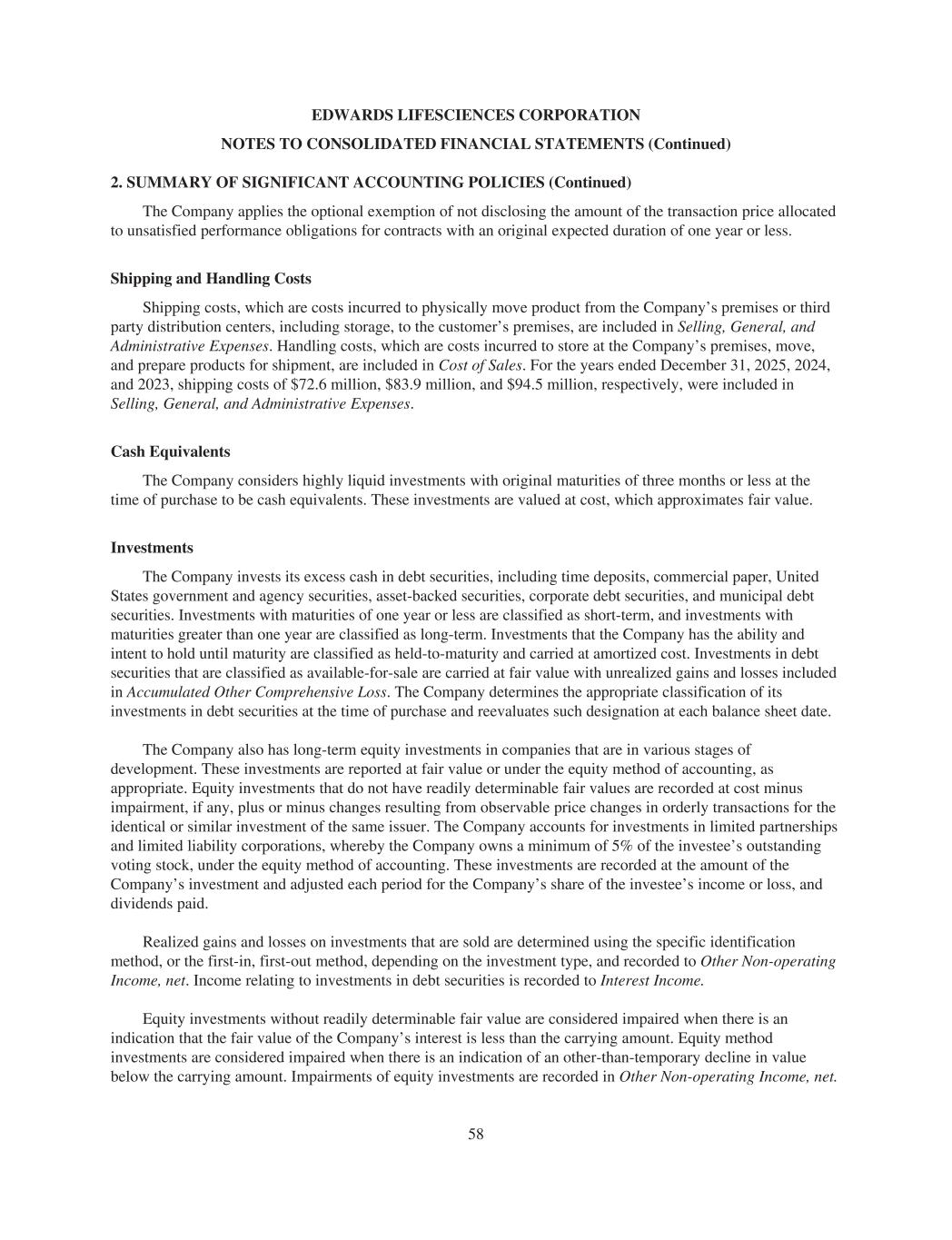 EDWARDS LIFESCIENCES CORPORATION NOTES TO CONSOLIDATED FINANCIAL STATEMENTS (Continued) 2. SUMMARY OF SIGNIFICANT ACCOUNTING POLICIES (Continued) The Company applies the optional exemption of not disclosing the amount of the transaction price allocated to unsatisfied performance obligations for contracts with an original expected duration of one year or less. Shipping and Handling Costs Shipping costs, which are costs incurred to physically move product from the Company’s premises or third party distribution centers, including storage, to the customer’s premises, are included in Selling, General, and Administrative Expenses. Handling costs, which are costs incurred to store at the Company’s premises, move, and prepare products for shipment, are included in Cost of Sales. For the years ended December 31, 2025, 2024, and 2023, shipping costs of $72.6 million, $83.9 million, and $94.5 million, respectively, were included in Selling, General, and Administrative Expenses. Cash Equivalents The Company considers highly liquid investments with original maturities of three months or less at the time of purchase to be cash equivalents. These investments are valued at cost, which approximates fair value. Investments The Company invests its excess cash in debt securities, including time deposits, commercial paper, United States government and agency securities, asset-backed securities, corporate debt securities, and municipal debt securities. Investments with maturities of one year or less are classified as short-term, and investments with maturities greater than one year are classified as long-term. Investments that the Company has the ability and intent to hold until maturity are classified as held-to-maturity and carried at amortized cost. Investments in debt securities that are classified as available-for-sale are carried at fair value with unrealized gains and losses included in Accumulated Other Comprehensive Loss. The Company determines the appropriate classification of its investments in debt securities at the time of purchase and reevaluates such designation at each balance sheet date. The Company also has long-term equity investments in companies that are in various stages of development. These investments are reported at fair value or under the equity method of accounting, as appropriate. Equity investments that do not have readily determinable fair values are recorded at cost minus impairment, if any, plus or minus changes resulting from observable price changes in orderly transactions for the identical or similar investment of the same issuer. The Company accounts for investments in limited partnerships and limited liability corporations, whereby the Company owns a minimum of 5% of the investee’s outstanding voting stock, under the equity method of accounting. These investments are recorded at the amount of the Company’s investment and adjusted each period for the Company’s share of the investee’s income or loss, and dividends paid. Realized gains and losses on investments that are sold are determined using the specific identification method, or the first-in, first-out method, depending on the investment type, and recorded to Other Non-operating Income, net. Income relating to investments in debt securities is recorded to Interest Income. Equity investments without readily determinable fair value are considered impaired when there is an indication that the fair value of the Company’s interest is less than the carrying amount. Equity method investments are considered impaired when there is an indication of an other-than-temporary decline in value below the carrying amount. Impairments of equity investments are recorded in Other Non-operating Income, net. 58