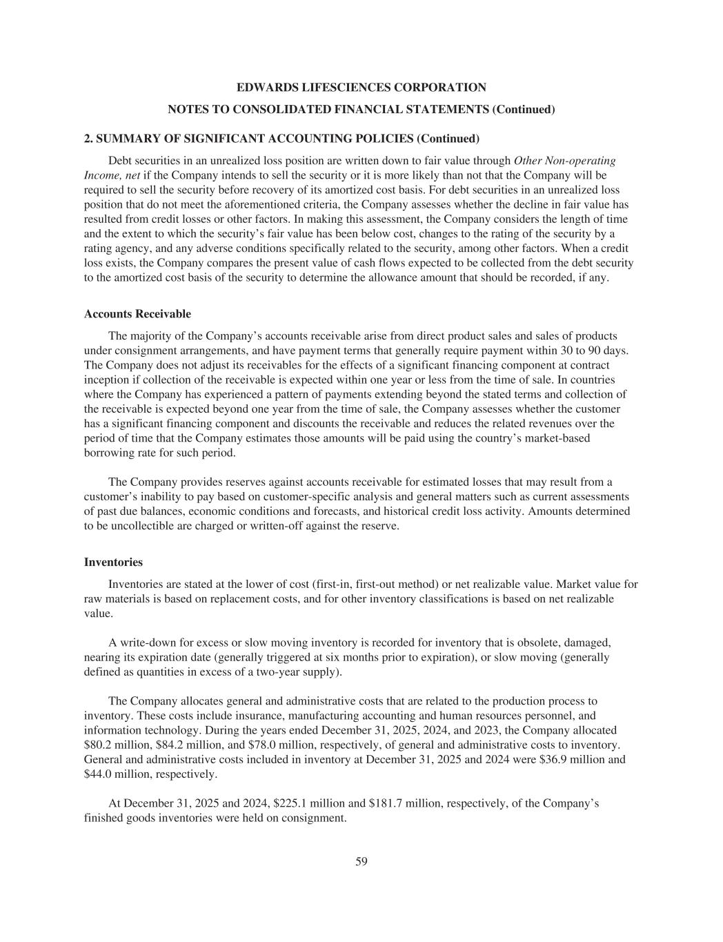 EDWARDS LIFESCIENCES CORPORATION NOTES TO CONSOLIDATED FINANCIAL STATEMENTS (Continued) 2. SUMMARY OF SIGNIFICANT ACCOUNTING POLICIES (Continued) Debt securities in an unrealized loss position are written down to fair value through Other Non-operating Income, net if the Company intends to sell the security or it is more likely than not that the Company will be required to sell the security before recovery of its amortized cost basis. For debt securities in an unrealized loss position that do not meet the aforementioned criteria, the Company assesses whether the decline in fair value has resulted from credit losses or other factors. In making this assessment, the Company considers the length of time and the extent to which the security’s fair value has been below cost, changes to the rating of the security by a rating agency, and any adverse conditions specifically related to the security, among other factors. When a credit loss exists, the Company compares the present value of cash flows expected to be collected from the debt security to the amortized cost basis of the security to determine the allowance amount that should be recorded, if any. Accounts Receivable The majority of the Company’s accounts receivable arise from direct product sales and sales of products under consignment arrangements, and have payment terms that generally require payment within 30 to 90 days. The Company does not adjust its receivables for the effects of a significant financing component at contract inception if collection of the receivable is expected within one year or less from the time of sale. In countries where the Company has experienced a pattern of payments extending beyond the stated terms and collection of the receivable is expected beyond one year from the time of sale, the Company assesses whether the customer has a significant financing component and discounts the receivable and reduces the related revenues over the period of time that the Company estimates those amounts will be paid using the country’s market-based borrowing rate for such period. The Company provides reserves against accounts receivable for estimated losses that may result from a customer’s inability to pay based on customer-specific analysis and general matters such as current assessments of past due balances, economic conditions and forecasts, and historical credit loss activity. Amounts determined to be uncollectible are charged or written-off against the reserve. Inventories Inventories are stated at the lower of cost (first-in, first-out method) or net realizable value. Market value for raw materials is based on replacement costs, and for other inventory classifications is based on net realizable value. A write-down for excess or slow moving inventory is recorded for inventory that is obsolete, damaged, nearing its expiration date (generally triggered at six months prior to expiration), or slow moving (generally defined as quantities in excess of a two-year supply). The Company allocates general and administrative costs that are related to the production process to inventory. These costs include insurance, manufacturing accounting and human resources personnel, and information technology. During the years ended December 31, 2025, 2024, and 2023, the Company allocated $80.2 million, $84.2 million, and $78.0 million, respectively, of general and administrative costs to inventory. General and administrative costs included in inventory at December 31, 2025 and 2024 were $36.9 million and $44.0 million, respectively. At December 31, 2025 and 2024, $225.1 million and $181.7 million, respectively, of the Company’s finished goods inventories were held on consignment. 59