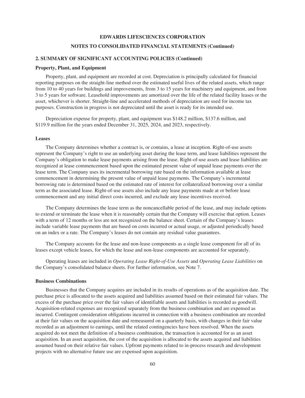 EDWARDS LIFESCIENCES CORPORATION NOTES TO CONSOLIDATED FINANCIAL STATEMENTS (Continued) 2. SUMMARY OF SIGNIFICANT ACCOUNTING POLICIES (Continued) Property, Plant, and Equipment Property, plant, and equipment are recorded at cost. Depreciation is principally calculated for financial reporting purposes on the straight-line method over the estimated useful lives of the related assets, which range from 10 to 40 years for buildings and improvements, from 3 to 15 years for machinery and equipment, and from 3 to 5 years for software. Leasehold improvements are amortized over the life of the related facility leases or the asset, whichever is shorter. Straight-line and accelerated methods of depreciation are used for income tax purposes. Construction in progress is not depreciated until the asset is ready for its intended use. Depreciation expense for property, plant, and equipment was $148.2 million, $137.6 million, and $119.9 million for the years ended December 31, 2025, 2024, and 2023, respectively. Leases The Company determines whether a contract is, or contains, a lease at inception. Right-of-use assets represent the Company’s right to use an underlying asset during the lease term, and lease liabilities represent the Company’s obligation to make lease payments arising from the lease. Right-of-use assets and lease liabilities are recognized at lease commencement based upon the estimated present value of unpaid lease payments over the lease term. The Company uses its incremental borrowing rate based on the information available at lease commencement in determining the present value of unpaid lease payments. The Company’s incremental borrowing rate is determined based on the estimated rate of interest for collateralized borrowing over a similar term as the associated lease. Right-of-use assets also include any lease payments made at or before lease commencement and any initial direct costs incurred, and exclude any lease incentives received. The Company determines the lease term as the noncancellable period of the lease, and may include options to extend or terminate the lease when it is reasonably certain that the Company will exercise that option. Leases with a term of 12 months or less are not recognized on the balance sheet. Certain of the Company’s leases include variable lease payments that are based on costs incurred or actual usage, or adjusted periodically based on an index or a rate. The Company’s leases do not contain any residual value guarantees. The Company accounts for the lease and non-lease components as a single lease component for all of its leases except vehicle leases, for which the lease and non-lease components are accounted for separately. Operating leases are included in Operating Lease Right-of-Use Assets and Operating Lease Liabilities on the Company’s consolidated balance sheets. For further information, see Note 7. Business Combinations Businesses that the Company acquires are included in its results of operations as of the acquisition date. The purchase price is allocated to the assets acquired and liabilities assumed based on their estimated fair values. The excess of the purchase price over the fair values of identifiable assets and liabilities is recorded as goodwill. Acquisition-related expenses are recognized separately from the business combination and are expensed as incurred. Contingent consideration obligations incurred in connection with a business combination are recorded at their fair values on the acquisition date and remeasured on a quarterly basis, with changes in their fair value recorded as an adjustment to earnings, until the related contingencies have been resolved. When the assets acquired do not meet the definition of a business combination, the transaction is accounted for as an asset acquisition. In an asset acquisition, the cost of the acquisition is allocated to the assets acquired and liabilities assumed based on their relative fair values. Upfront payments related to in-process research and development projects with no alternative future use are expensed upon acquisition. 60