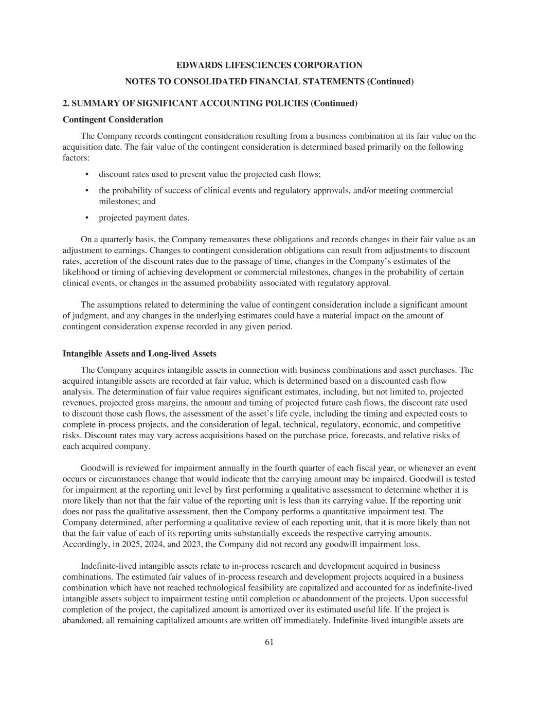EDWARDS LIFESCIENCES CORPORATION NOTES TO CONSOLIDATED FINANCIAL STATEMENTS (Continued) 2. SUMMARY OF SIGNIFICANT ACCOUNTING POLICIES (Continued) Contingent Consideration The Company records contingent consideration resulting from a business combination at its fair value on the acquisition date. The fair value of the contingent consideration is determined based primarily on the following factors: • discount rates used to present value the projected cash flows; • the probability of success of clinical events and regulatory approvals, and/or meeting commercial milestones; and • projected payment dates. On a quarterly basis, the Company remeasures these obligations and records changes in their fair value as an adjustment to earnings. Changes to contingent consideration obligations can result from adjustments to discount rates, accretion of the discount rates due to the passage of time, changes in the Company’s estimates of the likelihood or timing of achieving development or commercial milestones, changes in the probability of certain clinical events, or changes in the assumed probability associated with regulatory approval. The assumptions related to determining the value of contingent consideration include a significant amount of judgment, and any changes in the underlying estimates could have a material impact on the amount of contingent consideration expense recorded in any given period. Intangible Assets and Long-lived Assets The Company acquires intangible assets in connection with business combinations and asset purchases. The acquired intangible assets are recorded at fair value, which is determined based on a discounted cash flow analysis. The determination of fair value requires significant estimates, including, but not limited to, projected revenues, projected gross margins, the amount and timing of projected future cash flows, the discount rate used to discount those cash flows, the assessment of the asset’s life cycle, including the timing and expected costs to complete in-process projects, and the consideration of legal, technical, regulatory, economic, and competitive risks. Discount rates may vary across acquisitions based on the purchase price, forecasts, and relative risks of each acquired company. Goodwill is reviewed for impairment annually in the fourth quarter of each fiscal year, or whenever an event occurs or circumstances change that would indicate that the carrying amount may be impaired. Goodwill is tested for impairment at the reporting unit level by first performing a qualitative assessment to determine whether it is more likely than not that the fair value of the reporting unit is less than its carrying value. If the reporting unit does not pass the qualitative assessment, then the Company performs a quantitative impairment test. The Company determined, after performing a qualitative review of each reporting unit, that it is more likely than not that the fair value of each of its reporting units substantially exceeds the respective carrying amounts. Accordingly, in 2025, 2024, and 2023, the Company did not record any goodwill impairment loss. Indefinite-lived intangible assets relate to in-process research and development acquired in business combinations. The estimated fair values of in-process research and development projects acquired in a business combination which have not reached technological feasibility are capitalized and accounted for as indefinite-lived intangible assets subject to impairment testing until completion or abandonment of the projects. Upon successful completion of the project, the capitalized amount is amortized over its estimated useful life. If the project is abandoned, all remaining capitalized amounts are written off immediately. Indefinite-lived intangible assets are 61