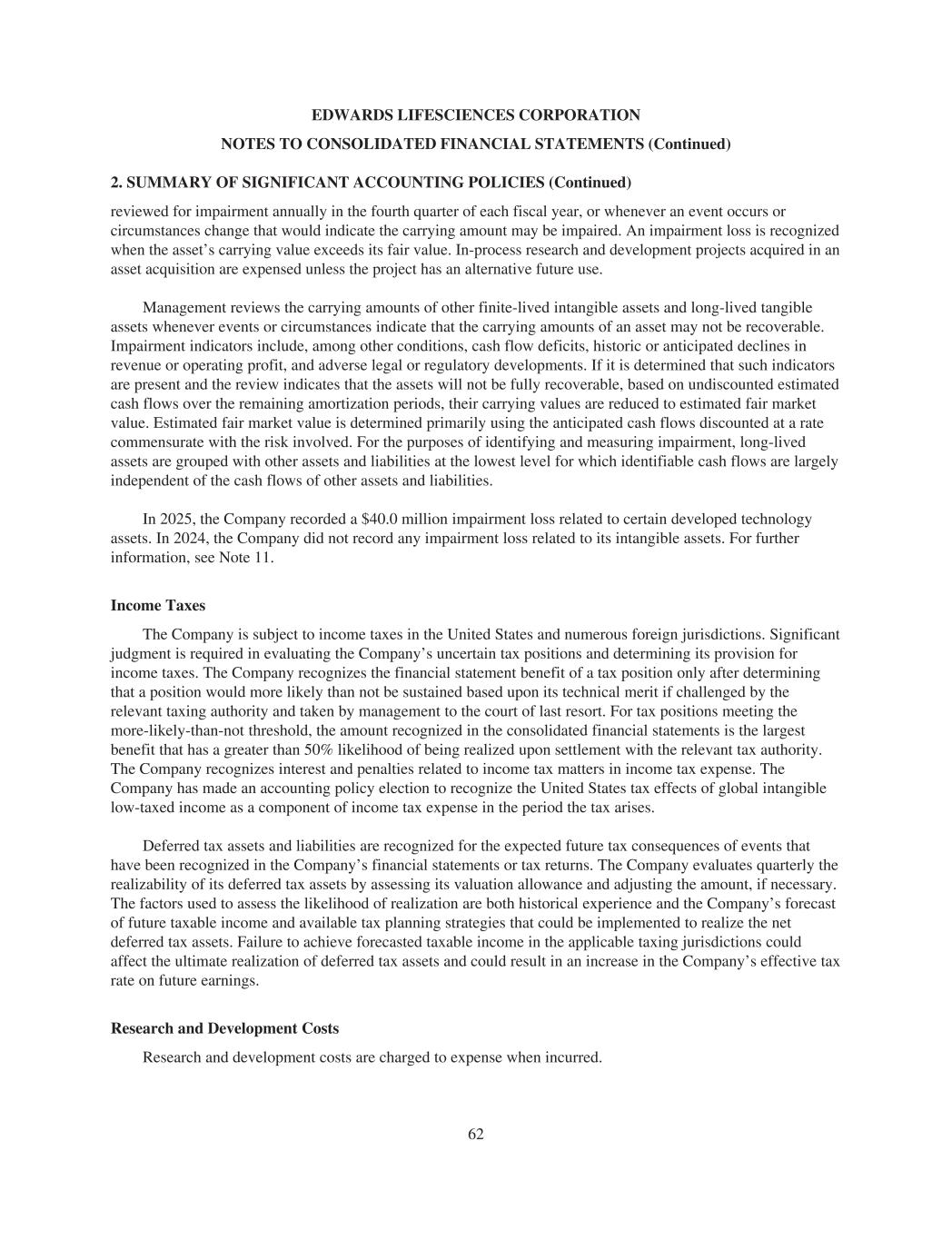 EDWARDS LIFESCIENCES CORPORATION NOTES TO CONSOLIDATED FINANCIAL STATEMENTS (Continued) 2. SUMMARY OF SIGNIFICANT ACCOUNTING POLICIES (Continued) reviewed for impairment annually in the fourth quarter of each fiscal year, or whenever an event occurs or circumstances change that would indicate the carrying amount may be impaired. An impairment loss is recognized when the asset’s carrying value exceeds its fair value. In-process research and development projects acquired in an asset acquisition are expensed unless the project has an alternative future use. Management reviews the carrying amounts of other finite-lived intangible assets and long-lived tangible assets whenever events or circumstances indicate that the carrying amounts of an asset may not be recoverable. Impairment indicators include, among other conditions, cash flow deficits, historic or anticipated declines in revenue or operating profit, and adverse legal or regulatory developments. If it is determined that such indicators are present and the review indicates that the assets will not be fully recoverable, based on undiscounted estimated cash flows over the remaining amortization periods, their carrying values are reduced to estimated fair market value. Estimated fair market value is determined primarily using the anticipated cash flows discounted at a rate commensurate with the risk involved. For the purposes of identifying and measuring impairment, long-lived assets are grouped with other assets and liabilities at the lowest level for which identifiable cash flows are largely independent of the cash flows of other assets and liabilities. In 2025, the Company recorded a $40.0 million impairment loss related to certain developed technology assets. In 2024, the Company did not record any impairment loss related to its intangible assets. For further information, see Note 11. Income Taxes The Company is subject to income taxes in the United States and numerous foreign jurisdictions. Significant judgment is required in evaluating the Company’s uncertain tax positions and determining its provision for income taxes. The Company recognizes the financial statement benefit of a tax position only after determining that a position would more likely than not be sustained based upon its technical merit if challenged by the relevant taxing authority and taken by management to the court of last resort. For tax positions meeting the more-likely-than-not threshold, the amount recognized in the consolidated financial statements is the largest benefit that has a greater than 50% likelihood of being realized upon settlement with the relevant tax authority. The Company recognizes interest and penalties related to income tax matters in income tax expense. The Company has made an accounting policy election to recognize the United States tax effects of global intangible low-taxed income as a component of income tax expense in the period the tax arises. Deferred tax assets and liabilities are recognized for the expected future tax consequences of events that have been recognized in the Company’s financial statements or tax returns. The Company evaluates quarterly the realizability of its deferred tax assets by assessing its valuation allowance and adjusting the amount, if necessary. The factors used to assess the likelihood of realization are both historical experience and the Company’s forecast of future taxable income and available tax planning strategies that could be implemented to realize the net deferred tax assets. Failure to achieve forecasted taxable income in the applicable taxing jurisdictions could affect the ultimate realization of deferred tax assets and could result in an increase in the Company’s effective tax rate on future earnings. Research and Development Costs Research and development costs are charged to expense when incurred. 62