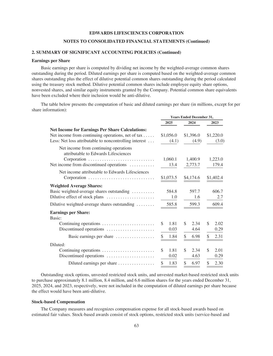 EDWARDS LIFESCIENCES CORPORATION NOTES TO CONSOLIDATED FINANCIAL STATEMENTS (Continued) 2. SUMMARY OF SIGNIFICANT ACCOUNTING POLICIES (Continued) Earnings per Share Basic earnings per share is computed by dividing net income by the weighted-average common shares outstanding during the period. Diluted earnings per share is computed based on the weighted-average common shares outstanding plus the effect of dilutive potential common shares outstanding during the period calculated using the treasury stock method. Dilutive potential common shares include employee equity share options, nonvested shares, and similar equity instruments granted by the Company. Potential common share equivalents have been excluded where their inclusion would be anti-dilutive. The table below presents the computation of basic and diluted earnings per share (in millions, except for per share information): Years Ended December 31, 2025 2024 2023 Net Income for Earnings Per Share Calculations: Net income from continuing operations, net of tax . . . . . $1,056.0 $1,396.0 $1,220.0 Less: Net loss attributable to noncontrolling interest . . . (4.1) (4.9) (3.0) Net income from continuing operations attributable to Edwards Lifesciences Corporation . . . . . . . . . . . . . . . . . . . . . . . . . . . . . 1,060.1 1,400.9 1,223.0 Net income from discontinued operations . . . . . . . . . . . 13.4 2,773.7 179.4 Net income attributable to Edwards Lifesciences Corporation . . . . . . . . . . . . . . . . . . . . . . . . . . . . . $1,073.5 $4,174.6 $1,402.4 Weighted Average Shares: Basic weighted-average shares outstanding . . . . . . . . . . 584.8 597.7 606.7 Dilutive effect of stock plans . . . . . . . . . . . . . . . . . . . . . 1.0 1.6 2.7 Dilutive weighted-average shares outstanding . . . . . . . . 585.8 599.3 609.4 Earnings per Share: Basic: Continuing operations . . . . . . . . . . . . . . . . . . . . . . . $ 1.81 $ 2.34 $ 2.02 Discontinued operations . . . . . . . . . . . . . . . . . . . . . 0.03 4.64 0.29 Basic earnings per share . . . . . . . . . . . . . . . . . $ 1.84 $ 6.98 $ 2.31 Diluted: Continuing operations . . . . . . . . . . . . . . . . . . . . . . . $ 1.81 $ 2.34 $ 2.01 Discontinued operations . . . . . . . . . . . . . . . . . . . . . 0.02 4.63 0.29 Diluted earnings per share . . . . . . . . . . . . . . . . $ 1.83 $ 6.97 $ 2.30 Outstanding stock options, unvested restricted stock units, and unvested market-based restricted stock units to purchase approximately 8.1 million, 8.4 million, and 6.6 million shares for the years ended December 31, 2025, 2024, and 2023, respectively, were not included in the computation of diluted earnings per share because the effect would have been anti-dilutive. Stock-based Compensation The Company measures and recognizes compensation expense for all stock-based awards based on estimated fair values. Stock-based awards consist of stock options, restricted stock units (service-based and 63