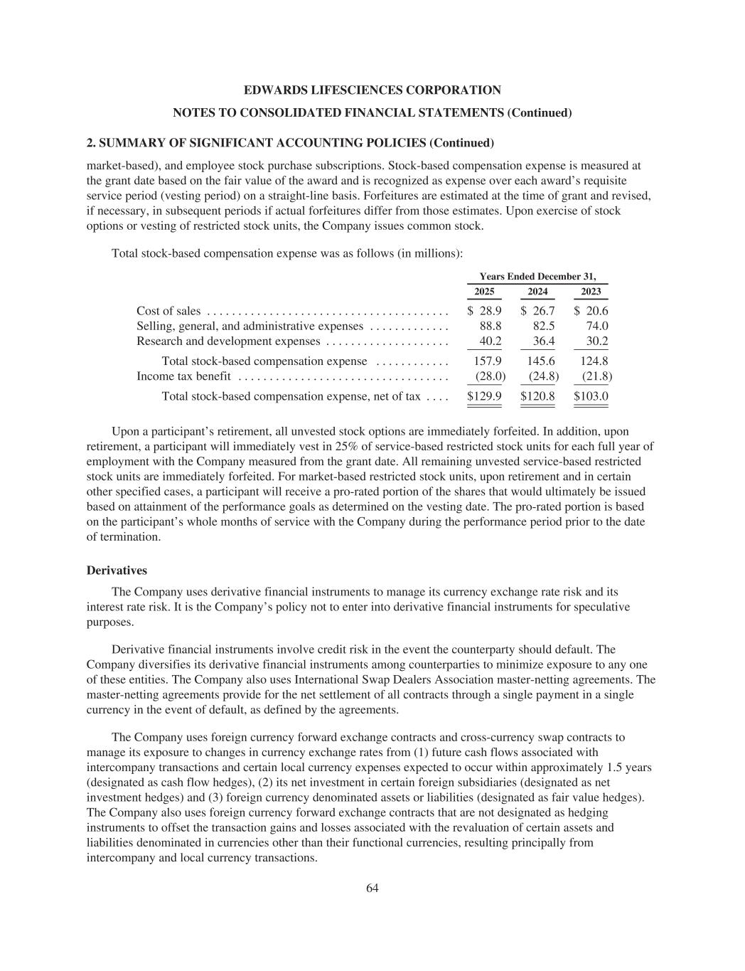 EDWARDS LIFESCIENCES CORPORATION NOTES TO CONSOLIDATED FINANCIAL STATEMENTS (Continued) 2. SUMMARY OF SIGNIFICANT ACCOUNTING POLICIES (Continued) market-based), and employee stock purchase subscriptions. Stock-based compensation expense is measured at the grant date based on the fair value of the award and is recognized as expense over each award’s requisite service period (vesting period) on a straight-line basis. Forfeitures are estimated at the time of grant and revised, if necessary, in subsequent periods if actual forfeitures differ from those estimates. Upon exercise of stock options or vesting of restricted stock units, the Company issues common stock. Total stock-based compensation expense was as follows (in millions): Years Ended December 31, 2025 2024 2023 Cost of sales . . . . . . . . . . . . . . . . . . . . . . . . . . . . . . . . . . . . . . . $ 28.9 $ 26.7 $ 20.6 Selling, general, and administrative expenses . . . . . . . . . . . . . 88.8 82.5 74.0 Research and development expenses . . . . . . . . . . . . . . . . . . . . 40.2 36.4 30.2 Total stock-based compensation expense . . . . . . . . . . . . 157.9 145.6 124.8 Income tax benefit . . . . . . . . . . . . . . . . . . . . . . . . . . . . . . . . . . (28.0) (24.8) (21.8) Total stock-based compensation expense, net of tax . . . . $129.9 $120.8 $103.0 Upon a participant’s retirement, all unvested stock options are immediately forfeited. In addition, upon retirement, a participant will immediately vest in 25% of service-based restricted stock units for each full year of employment with the Company measured from the grant date. All remaining unvested service-based restricted stock units are immediately forfeited. For market-based restricted stock units, upon retirement and in certain other specified cases, a participant will receive a pro-rated portion of the shares that would ultimately be issued based on attainment of the performance goals as determined on the vesting date. The pro-rated portion is based on the participant’s whole months of service with the Company during the performance period prior to the date of termination. Derivatives The Company uses derivative financial instruments to manage its currency exchange rate risk and its interest rate risk. It is the Company’s policy not to enter into derivative financial instruments for speculative purposes. Derivative financial instruments involve credit risk in the event the counterparty should default. The Company diversifies its derivative financial instruments among counterparties to minimize exposure to any one of these entities. The Company also uses International Swap Dealers Association master-netting agreements. The master-netting agreements provide for the net settlement of all contracts through a single payment in a single currency in the event of default, as defined by the agreements. The Company uses foreign currency forward exchange contracts and cross-currency swap contracts to manage its exposure to changes in currency exchange rates from (1) future cash flows associated with intercompany transactions and certain local currency expenses expected to occur within approximately 1.5 years (designated as cash flow hedges), (2) its net investment in certain foreign subsidiaries (designated as net investment hedges) and (3) foreign currency denominated assets or liabilities (designated as fair value hedges). The Company also uses foreign currency forward exchange contracts that are not designated as hedging instruments to offset the transaction gains and losses associated with the revaluation of certain assets and liabilities denominated in currencies other than their functional currencies, resulting principally from intercompany and local currency transactions. 64