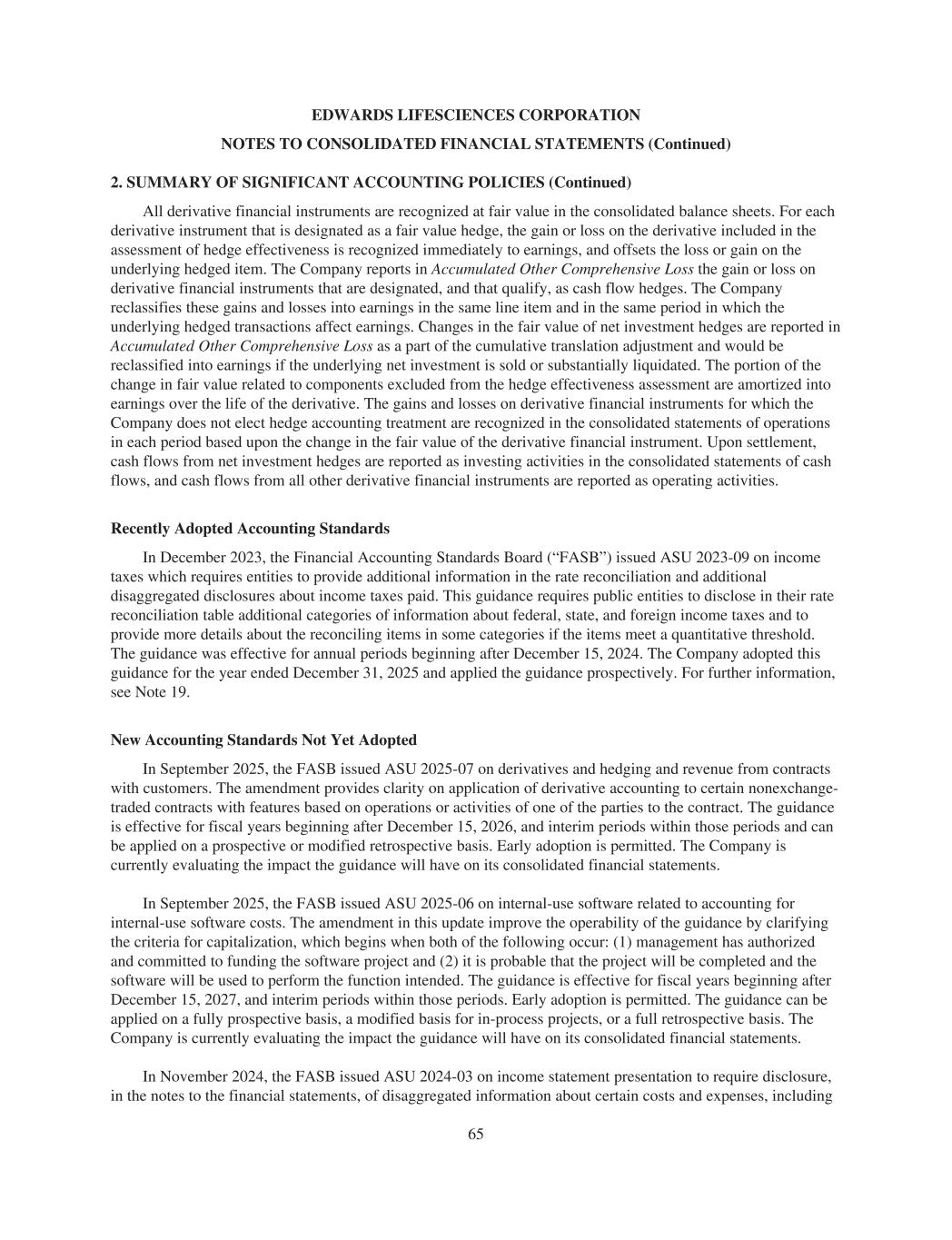 EDWARDS LIFESCIENCES CORPORATION NOTES TO CONSOLIDATED FINANCIAL STATEMENTS (Continued) 2. SUMMARY OF SIGNIFICANT ACCOUNTING POLICIES (Continued) All derivative financial instruments are recognized at fair value in the consolidated balance sheets. For each derivative instrument that is designated as a fair value hedge, the gain or loss on the derivative included in the assessment of hedge effectiveness is recognized immediately to earnings, and offsets the loss or gain on the underlying hedged item. The Company reports in Accumulated Other Comprehensive Loss the gain or loss on derivative financial instruments that are designated, and that qualify, as cash flow hedges. The Company reclassifies these gains and losses into earnings in the same line item and in the same period in which the underlying hedged transactions affect earnings. Changes in the fair value of net investment hedges are reported in Accumulated Other Comprehensive Loss as a part of the cumulative translation adjustment and would be reclassified into earnings if the underlying net investment is sold or substantially liquidated. The portion of the change in fair value related to components excluded from the hedge effectiveness assessment are amortized into earnings over the life of the derivative. The gains and losses on derivative financial instruments for which the Company does not elect hedge accounting treatment are recognized in the consolidated statements of operations in each period based upon the change in the fair value of the derivative financial instrument. Upon settlement, cash flows from net investment hedges are reported as investing activities in the consolidated statements of cash flows, and cash flows from all other derivative financial instruments are reported as operating activities. Recently Adopted Accounting Standards In December 2023, the Financial Accounting Standards Board (“FASB”) issued ASU 2023-09 on income taxes which requires entities to provide additional information in the rate reconciliation and additional disaggregated disclosures about income taxes paid. This guidance requires public entities to disclose in their rate reconciliation table additional categories of information about federal, state, and foreign income taxes and to provide more details about the reconciling items in some categories if the items meet a quantitative threshold. The guidance was effective for annual periods beginning after December 15, 2024. The Company adopted this guidance for the year ended December 31, 2025 and applied the guidance prospectively. For further information, see Note 19. New Accounting Standards Not Yet Adopted In September 2025, the FASB issued ASU 2025-07 on derivatives and hedging and revenue from contracts with customers. The amendment provides clarity on application of derivative accounting to certain nonexchange- traded contracts with features based on operations or activities of one of the parties to the contract. The guidance is effective for fiscal years beginning after December 15, 2026, and interim periods within those periods and can be applied on a prospective or modified retrospective basis. Early adoption is permitted. The Company is currently evaluating the impact the guidance will have on its consolidated financial statements. In September 2025, the FASB issued ASU 2025-06 on internal-use software related to accounting for internal-use software costs. The amendment in this update improve the operability of the guidance by clarifying the criteria for capitalization, which begins when both of the following occur: (1) management has authorized and committed to funding the software project and (2) it is probable that the project will be completed and the software will be used to perform the function intended. The guidance is effective for fiscal years beginning after December 15, 2027, and interim periods within those periods. Early adoption is permitted. The guidance can be applied on a fully prospective basis, a modified basis for in-process projects, or a full retrospective basis. The Company is currently evaluating the impact the guidance will have on its consolidated financial statements. In November 2024, the FASB issued ASU 2024-03 on income statement presentation to require disclosure, in the notes to the financial statements, of disaggregated information about certain costs and expenses, including 65