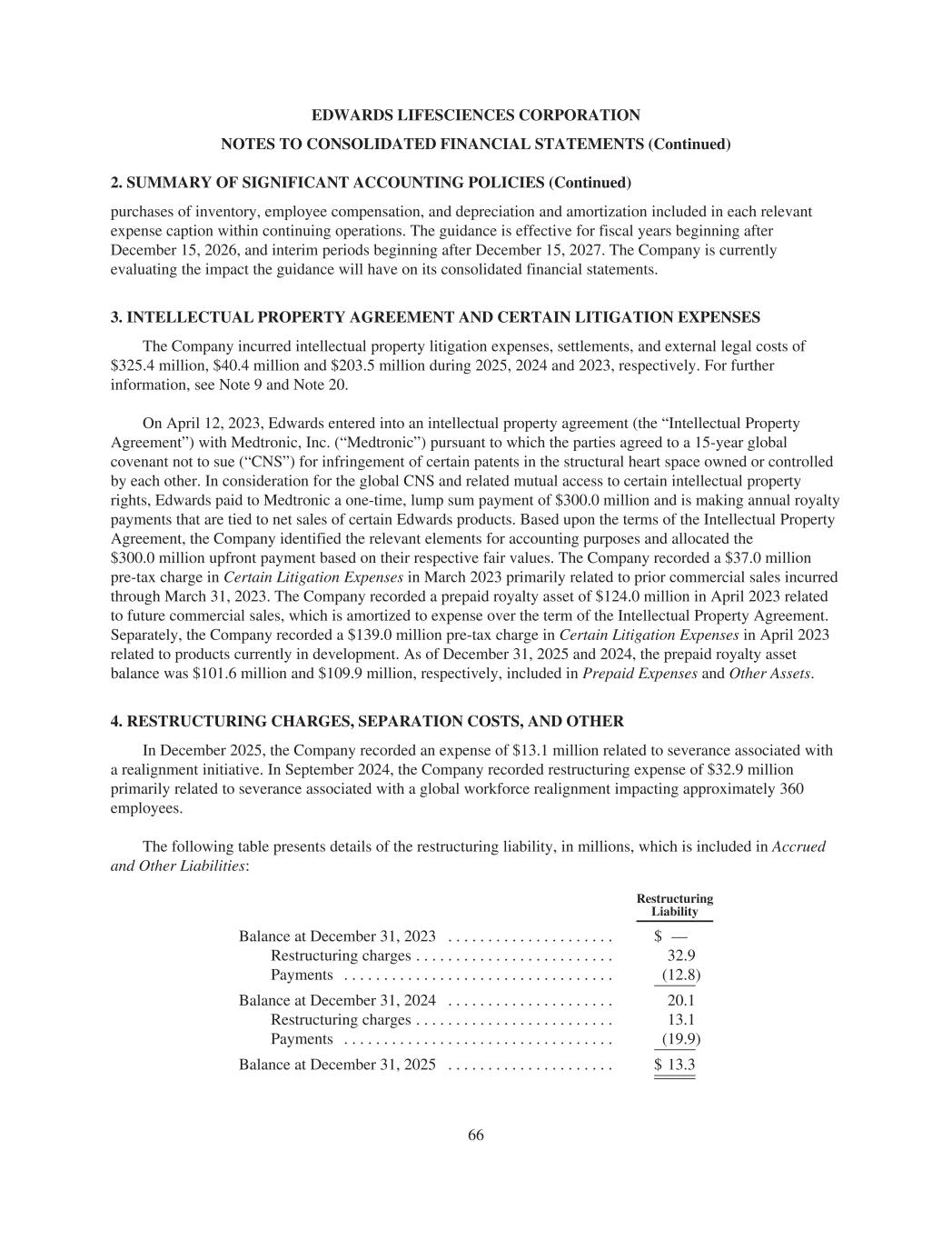 EDWARDS LIFESCIENCES CORPORATION NOTES TO CONSOLIDATED FINANCIAL STATEMENTS (Continued) 2. SUMMARY OF SIGNIFICANT ACCOUNTING POLICIES (Continued) purchases of inventory, employee compensation, and depreciation and amortization included in each relevant expense caption within continuing operations. The guidance is effective for fiscal years beginning after December 15, 2026, and interim periods beginning after December 15, 2027. The Company is currently evaluating the impact the guidance will have on its consolidated financial statements. 3. INTELLECTUAL PROPERTY AGREEMENT AND CERTAIN LITIGATION EXPENSES The Company incurred intellectual property litigation expenses, settlements, and external legal costs of $325.4 million, $40.4 million and $203.5 million during 2025, 2024 and 2023, respectively. For further information, see Note 9 and Note 20. On April 12, 2023, Edwards entered into an intellectual property agreement (the “Intellectual Property Agreement”) with Medtronic, Inc. (“Medtronic”) pursuant to which the parties agreed to a 15-year global covenant not to sue (“CNS”) for infringement of certain patents in the structural heart space owned or controlled by each other. In consideration for the global CNS and related mutual access to certain intellectual property rights, Edwards paid to Medtronic a one-time, lump sum payment of $300.0 million and is making annual royalty payments that are tied to net sales of certain Edwards products. Based upon the terms of the Intellectual Property Agreement, the Company identified the relevant elements for accounting purposes and allocated the $300.0 million upfront payment based on their respective fair values. The Company recorded a $37.0 million pre-tax charge in Certain Litigation Expenses in March 2023 primarily related to prior commercial sales incurred through March 31, 2023. The Company recorded a prepaid royalty asset of $124.0 million in April 2023 related to future commercial sales, which is amortized to expense over the term of the Intellectual Property Agreement. Separately, the Company recorded a $139.0 million pre-tax charge in Certain Litigation Expenses in April 2023 related to products currently in development. As of December 31, 2025 and 2024, the prepaid royalty asset balance was $101.6 million and $109.9 million, respectively, included in Prepaid Expenses and Other Assets. 4. RESTRUCTURING CHARGES, SEPARATION COSTS, AND OTHER In December 2025, the Company recorded an expense of $13.1 million related to severance associated with a realignment initiative. In September 2024, the Company recorded restructuring expense of $32.9 million primarily related to severance associated with a global workforce realignment impacting approximately 360 employees. The following table presents details of the restructuring liability, in millions, which is included in Accrued and Other Liabilities: Restructuring Liability Balance at December 31, 2023 . . . . . . . . . . . . . . . . . . . . . $ — Restructuring charges . . . . . . . . . . . . . . . . . . . . . . . . . 32.9 Payments . . . . . . . . . . . . . . . . . . . . . . . . . . . . . . . . . . (12.8) Balance at December 31, 2024 . . . . . . . . . . . . . . . . . . . . . 20.1 Restructuring charges . . . . . . . . . . . . . . . . . . . . . . . . . 13.1 Payments . . . . . . . . . . . . . . . . . . . . . . . . . . . . . . . . . . (19.9) Balance at December 31, 2025 . . . . . . . . . . . . . . . . . . . . . $ 13.3 66