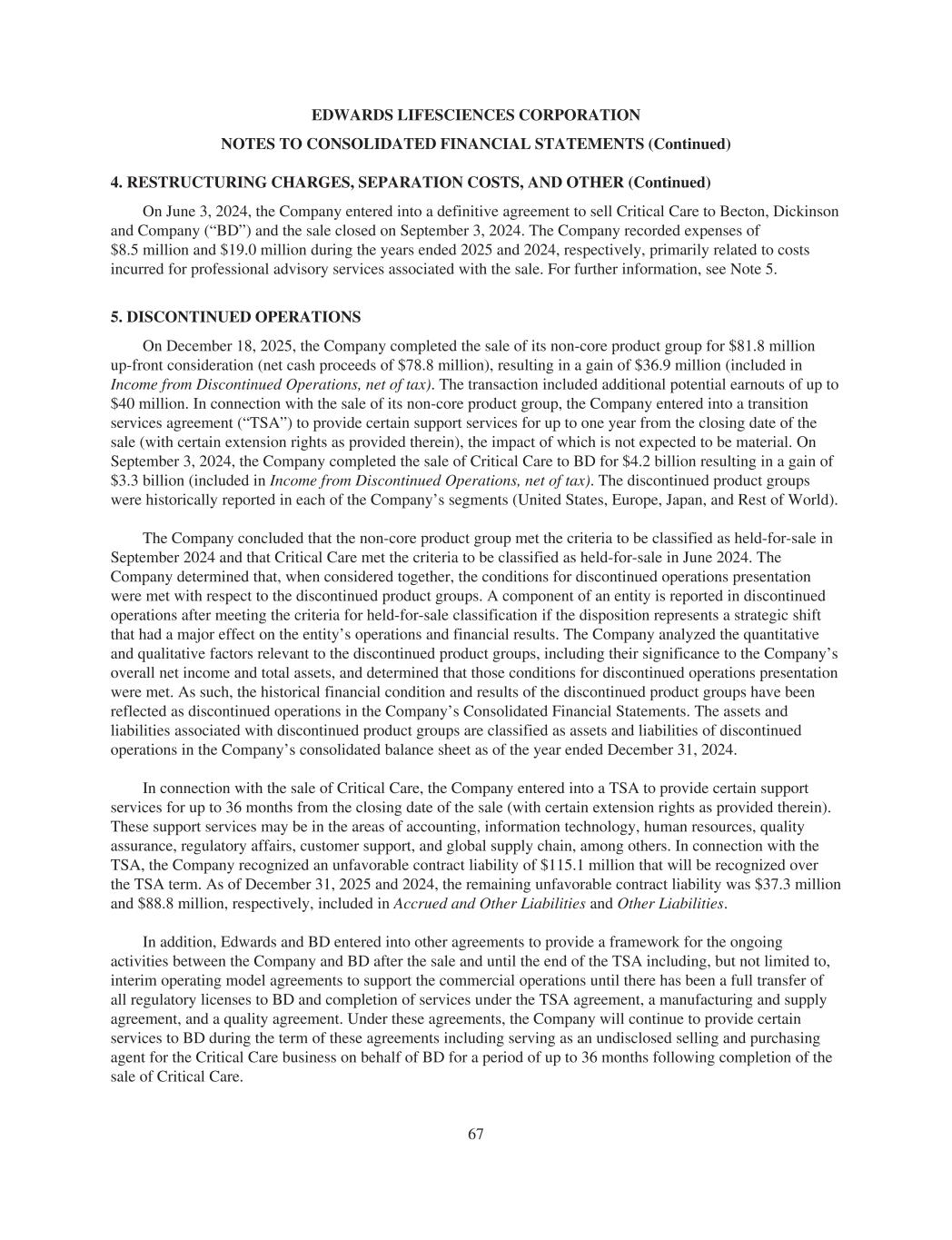EDWARDS LIFESCIENCES CORPORATION NOTES TO CONSOLIDATED FINANCIAL STATEMENTS (Continued) 4. RESTRUCTURING CHARGES, SEPARATION COSTS, AND OTHER (Continued) On June 3, 2024, the Company entered into a definitive agreement to sell Critical Care to Becton, Dickinson and Company (“BD”) and the sale closed on September 3, 2024. The Company recorded expenses of $8.5 million and $19.0 million during the years ended 2025 and 2024, respectively, primarily related to costs incurred for professional advisory services associated with the sale. For further information, see Note 5. 5. DISCONTINUED OPERATIONS On December 18, 2025, the Company completed the sale of its non-core product group for $81.8 million up-front consideration (net cash proceeds of $78.8 million), resulting in a gain of $36.9 million (included in Income from Discontinued Operations, net of tax). The transaction included additional potential earnouts of up to $40 million. In connection with the sale of its non-core product group, the Company entered into a transition services agreement (“TSA”) to provide certain support services for up to one year from the closing date of the sale (with certain extension rights as provided therein), the impact of which is not expected to be material. On September 3, 2024, the Company completed the sale of Critical Care to BD for $4.2 billion resulting in a gain of $3.3 billion (included in Income from Discontinued Operations, net of tax). The discontinued product groups were historically reported in each of the Company’s segments (United States, Europe, Japan, and Rest of World). The Company concluded that the non-core product group met the criteria to be classified as held-for-sale in September 2024 and that Critical Care met the criteria to be classified as held-for-sale in June 2024. The Company determined that, when considered together, the conditions for discontinued operations presentation were met with respect to the discontinued product groups. A component of an entity is reported in discontinued operations after meeting the criteria for held-for-sale classification if the disposition represents a strategic shift that had a major effect on the entity’s operations and financial results. The Company analyzed the quantitative and qualitative factors relevant to the discontinued product groups, including their significance to the Company’s overall net income and total assets, and determined that those conditions for discontinued operations presentation were met. As such, the historical financial condition and results of the discontinued product groups have been reflected as discontinued operations in the Company’s Consolidated Financial Statements. The assets and liabilities associated with discontinued product groups are classified as assets and liabilities of discontinued operations in the Company’s consolidated balance sheet as of the year ended December 31, 2024. In connection with the sale of Critical Care, the Company entered into a TSA to provide certain support services for up to 36 months from the closing date of the sale (with certain extension rights as provided therein). These support services may be in the areas of accounting, information technology, human resources, quality assurance, regulatory affairs, customer support, and global supply chain, among others. In connection with the TSA, the Company recognized an unfavorable contract liability of $115.1 million that will be recognized over the TSA term. As of December 31, 2025 and 2024, the remaining unfavorable contract liability was $37.3 million and $88.8 million, respectively, included in Accrued and Other Liabilities and Other Liabilities. In addition, Edwards and BD entered into other agreements to provide a framework for the ongoing activities between the Company and BD after the sale and until the end of the TSA including, but not limited to, interim operating model agreements to support the commercial operations until there has been a full transfer of all regulatory licenses to BD and completion of services under the TSA agreement, a manufacturing and supply agreement, and a quality agreement. Under these agreements, the Company will continue to provide certain services to BD during the term of these agreements including serving as an undisclosed selling and purchasing agent for the Critical Care business on behalf of BD for a period of up to 36 months following completion of the sale of Critical Care. 67