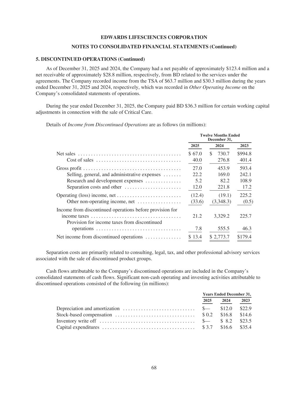 EDWARDS LIFESCIENCES CORPORATION NOTES TO CONSOLIDATED FINANCIAL STATEMENTS (Continued) 5. DISCONTINUED OPERATIONS (Continued) As of December 31, 2025 and 2024, the Company had a net payable of approximately $123.4 million and a net receivable of approximately $28.8 million, respectively, from BD related to the services under the agreements. The Company recorded income from the TSA of $63.7 million and $30.3 million during the years ended December 31, 2025 and 2024, respectively, which was recorded in Other Operating Income on the Company’s consolidated statements of operations. During the year ended December 31, 2025, the Company paid BD $36.3 million for certain working capital adjustments in connection with the sale of Critical Care. Details of Income from Discontinued Operations are as follows (in millions): Twelve Months Ended December 31, 2025 2024 2023 Net sales . . . . . . . . . . . . . . . . . . . . . . . . . . . . . . . . . . . . . . . . $ 67.0 $ 730.7 $994.8 Cost of sales . . . . . . . . . . . . . . . . . . . . . . . . . . . . . . . . . 40.0 276.8 401.4 Gross profit . . . . . . . . . . . . . . . . . . . . . . . . . . . . . . . . . . . . . . 27.0 453.9 593.4 Selling, general, and administrative expenses . . . . . . . 22.2 169.0 242.1 Research and development expenses . . . . . . . . . . . . . . 5.2 82.2 108.9 Separation costs and other . . . . . . . . . . . . . . . . . . . . . . 12.0 221.8 17.2 Operating (loss) income, net . . . . . . . . . . . . . . . . . . . . . . . . . (12.4) (19.1) 225.2 Other non-operating income, net . . . . . . . . . . . . . . . . . (33.6) (3,348.3) (0.5) Income from discontinued operations before provision for income taxes . . . . . . . . . . . . . . . . . . . . . . . . . . . . . . . . . . . 21.2 3,329.2 225.7 Provision for income taxes from discontinued operations . . . . . . . . . . . . . . . . . . . . . . . . . . . . . . . . . 7.8 555.5 46.3 Net income from discontinued operations . . . . . . . . . . . . . . $ 13.4 $ 2,773.7 $179.4 Separation costs are primarily related to consulting, legal, tax, and other professional advisory services associated with the sale of discontinued product groups. Cash flows attributable to the Company’s discontinued operations are included in the Company’s consolidated statements of cash flows. Significant non-cash operating and investing activities attributable to discontinued operations consisted of the following (in millions): Years Ended December 31, 2025 2024 2023 Depreciation and amortization . . . . . . . . . . . . . . . . . . . . . . . . . . . . $— $12.0 $22.9 Stock-based compensation . . . . . . . . . . . . . . . . . . . . . . . . . . . . . . . $ 0.2 $16.8 $14.6 Inventory write off . . . . . . . . . . . . . . . . . . . . . . . . . . . . . . . . . . . . . $— $ 8.2 $23.5 Capital expenditures . . . . . . . . . . . . . . . . . . . . . . . . . . . . . . . . . . . . $ 3.7 $16.6 $35.4 68
