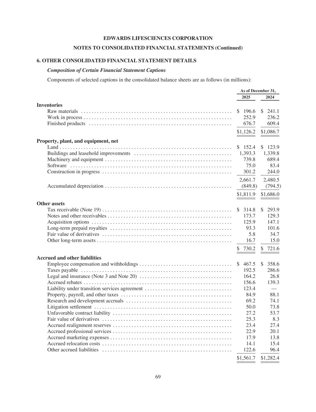 EDWARDS LIFESCIENCES CORPORATION NOTES TO CONSOLIDATED FINANCIAL STATEMENTS (Continued) 6. OTHER CONSOLIDATED FINANCIAL STATEMENT DETAILS Composition of Certain Financial Statement Captions Components of selected captions in the consolidated balance sheets are as follows (in millions): As of December 31, 2025 2024 Inventories Raw materials . . . . . . . . . . . . . . . . . . . . . . . . . . . . . . . . . . . . . . . . . . . . . . . . . . . . . . . . . $ 196.6 $ 241.1 Work in process . . . . . . . . . . . . . . . . . . . . . . . . . . . . . . . . . . . . . . . . . . . . . . . . . . . . . . . . 252.9 236.2 Finished products . . . . . . . . . . . . . . . . . . . . . . . . . . . . . . . . . . . . . . . . . . . . . . . . . . . . . . 676.7 609.4 $1,126.2 $1,086.7 Property, plant, and equipment, net Land . . . . . . . . . . . . . . . . . . . . . . . . . . . . . . . . . . . . . . . . . . . . . . . . . . . . . . . . . . . . . . . . . $ 152.4 $ 123.9 Buildings and leasehold improvements . . . . . . . . . . . . . . . . . . . . . . . . . . . . . . . . . . . . . 1,393.3 1,339.8 Machinery and equipment . . . . . . . . . . . . . . . . . . . . . . . . . . . . . . . . . . . . . . . . . . . . . . . . 739.8 689.4 Software . . . . . . . . . . . . . . . . . . . . . . . . . . . . . . . . . . . . . . . . . . . . . . . . . . . . . . . . . . . . . 75.0 83.4 Construction in progress . . . . . . . . . . . . . . . . . . . . . . . . . . . . . . . . . . . . . . . . . . . . . . . . . 301.2 244.0 2,661.7 2,480.5 Accumulated depreciation . . . . . . . . . . . . . . . . . . . . . . . . . . . . . . . . . . . . . . . . . . . . . . . . (849.8) (794.5) $1,811.9 $1,686.0 Other assets Tax receivable (Note 19) . . . . . . . . . . . . . . . . . . . . . . . . . . . . . . . . . . . . . . . . . . . . . . . . . $ 314.8 $ 293.9 Notes and other receivables . . . . . . . . . . . . . . . . . . . . . . . . . . . . . . . . . . . . . . . . . . . . . . . 173.7 129.3 Acquisition options . . . . . . . . . . . . . . . . . . . . . . . . . . . . . . . . . . . . . . . . . . . . . . . . . . . . . 125.9 147.1 Long-term prepaid royalties . . . . . . . . . . . . . . . . . . . . . . . . . . . . . . . . . . . . . . . . . . . . . . 93.3 101.6 Fair value of derivatives . . . . . . . . . . . . . . . . . . . . . . . . . . . . . . . . . . . . . . . . . . . . . . . . . 5.8 34.7 Other long-term assets . . . . . . . . . . . . . . . . . . . . . . . . . . . . . . . . . . . . . . . . . . . . . . . . . . . 16.7 15.0 $ 730.2 $ 721.6 Accrued and other liabilities Employee compensation and withholdings . . . . . . . . . . . . . . . . . . . . . . . . . . . . . . . . . . . $ 467.5 $ 358.6 Taxes payable . . . . . . . . . . . . . . . . . . . . . . . . . . . . . . . . . . . . . . . . . . . . . . . . . . . . . . . . . 192.5 286.6 Legal and insurance (Note 3 and Note 20) . . . . . . . . . . . . . . . . . . . . . . . . . . . . . . . . . . . 164.2 26.8 Accrued rebates . . . . . . . . . . . . . . . . . . . . . . . . . . . . . . . . . . . . . . . . . . . . . . . . . . . . . . . . 156.6 139.3 Liability under transition services agreement . . . . . . . . . . . . . . . . . . . . . . . . . . . . . . . . . 123.4 — Property, payroll, and other taxes . . . . . . . . . . . . . . . . . . . . . . . . . . . . . . . . . . . . . . . . . . 84.9 88.1 Research and development accruals . . . . . . . . . . . . . . . . . . . . . . . . . . . . . . . . . . . . . . . . 69.2 74.1 Litigation settlement . . . . . . . . . . . . . . . . . . . . . . . . . . . . . . . . . . . . . . . . . . . . . . . . . . . . 50.0 73.8 Unfavorable contract liability . . . . . . . . . . . . . . . . . . . . . . . . . . . . . . . . . . . . . . . . . . . . . 27.2 53.7 Fair value of derivatives . . . . . . . . . . . . . . . . . . . . . . . . . . . . . . . . . . . . . . . . . . . . . . . . . 25.3 8.3 Accrued realignment reserves . . . . . . . . . . . . . . . . . . . . . . . . . . . . . . . . . . . . . . . . . . . . . 23.4 27.4 Accrued professional services . . . . . . . . . . . . . . . . . . . . . . . . . . . . . . . . . . . . . . . . . . . . . 22.9 20.1 Accrued marketing expenses . . . . . . . . . . . . . . . . . . . . . . . . . . . . . . . . . . . . . . . . . . . . . . 17.9 13.8 Accrued relocation costs . . . . . . . . . . . . . . . . . . . . . . . . . . . . . . . . . . . . . . . . . . . . . . . . . 14.1 15.4 Other accrued liabilities . . . . . . . . . . . . . . . . . . . . . . . . . . . . . . . . . . . . . . . . . . . . . . . . . 122.6 96.4 $1,561.7 $1,282.4 69
