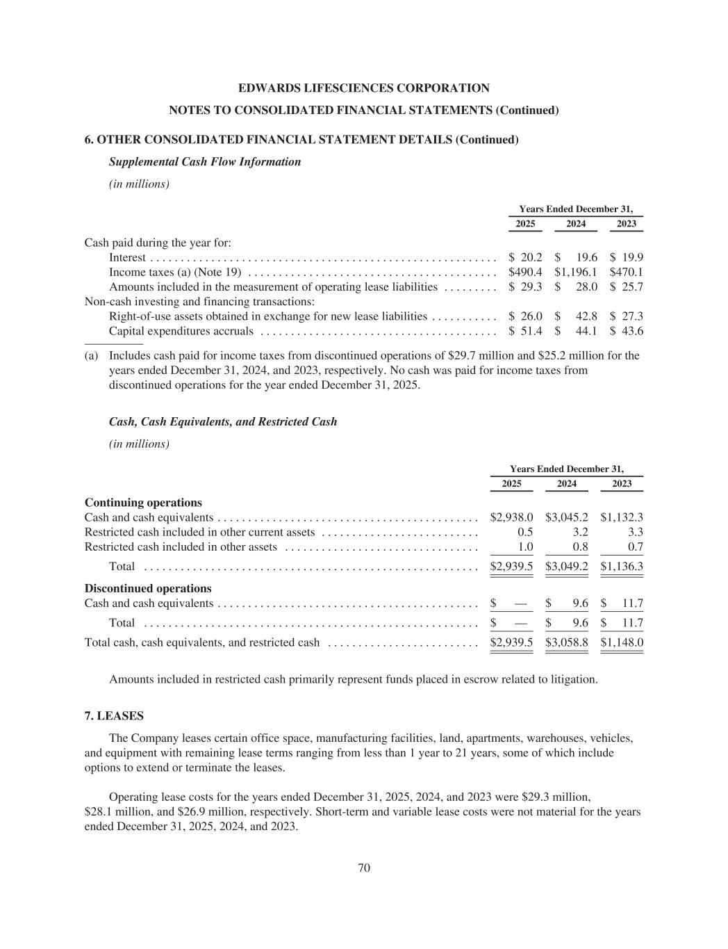 EDWARDS LIFESCIENCES CORPORATION NOTES TO CONSOLIDATED FINANCIAL STATEMENTS (Continued) 6. OTHER CONSOLIDATED FINANCIAL STATEMENT DETAILS (Continued) Supplemental Cash Flow Information (in millions) Years Ended December 31, 2025 2024 2023 Cash paid during the year for: Interest . . . . . . . . . . . . . . . . . . . . . . . . . . . . . . . . . . . . . . . . . . . . . . . . . . . . . . . . . $ 20.2 $ 19.6 $ 19.9 Income taxes (a) (Note 19) . . . . . . . . . . . . . . . . . . . . . . . . . . . . . . . . . . . . . . . . . $490.4 $1,196.1 $470.1 Amounts included in the measurement of operating lease liabilities . . . . . . . . . $ 29.3 $ 28.0 $ 25.7 Non-cash investing and financing transactions: Right-of-use assets obtained in exchange for new lease liabilities . . . . . . . . . . . $ 26.0 $ 42.8 $ 27.3 Capital expenditures accruals . . . . . . . . . . . . . . . . . . . . . . . . . . . . . . . . . . . . . . . $ 51.4 $ 44.1 $ 43.6 (a) Includes cash paid for income taxes from discontinued operations of $29.7 million and $25.2 million for the years ended December 31, 2024, and 2023, respectively. No cash was paid for income taxes from discontinued operations for the year ended December 31, 2025. Cash, Cash Equivalents, and Restricted Cash (in millions) Years Ended December 31, 2025 2024 2023 Continuing operations Cash and cash equivalents . . . . . . . . . . . . . . . . . . . . . . . . . . . . . . . . . . . . . . . . . . . $2,938.0 $3,045.2 $1,132.3 Restricted cash included in other current assets . . . . . . . . . . . . . . . . . . . . . . . . . . 0.5 3.2 3.3 Restricted cash included in other assets . . . . . . . . . . . . . . . . . . . . . . . . . . . . . . . . 1.0 0.8 0.7 Total . . . . . . . . . . . . . . . . . . . . . . . . . . . . . . . . . . . . . . . . . . . . . . . . . . . . . . . $2,939.5 $3,049.2 $1,136.3 Discontinued operations Cash and cash equivalents . . . . . . . . . . . . . . . . . . . . . . . . . . . . . . . . . . . . . . . . . . . $ — $ 9.6 $ 11.7 Total . . . . . . . . . . . . . . . . . . . . . . . . . . . . . . . . . . . . . . . . . . . . . . . . . . . . . . . $ — $ 9.6 $ 11.7 Total cash, cash equivalents, and restricted cash . . . . . . . . . . . . . . . . . . . . . . . . . $2,939.5 $3,058.8 $1,148.0 Amounts included in restricted cash primarily represent funds placed in escrow related to litigation. 7. LEASES The Company leases certain office space, manufacturing facilities, land, apartments, warehouses, vehicles, and equipment with remaining lease terms ranging from less than 1 year to 21 years, some of which include options to extend or terminate the leases. Operating lease costs for the years ended December 31, 2025, 2024, and 2023 were $29.3 million, $28.1 million, and $26.9 million, respectively. Short-term and variable lease costs were not material for the years ended December 31, 2025, 2024, and 2023. 70