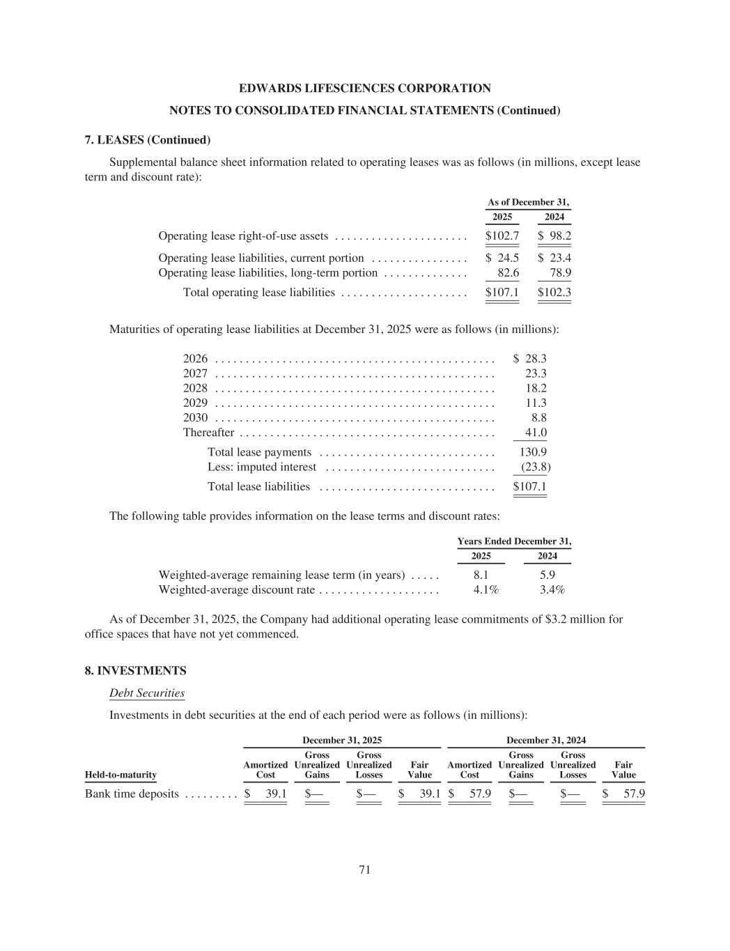 EDWARDS LIFESCIENCES CORPORATION NOTES TO CONSOLIDATED FINANCIAL STATEMENTS (Continued) 7. LEASES (Continued) Supplemental balance sheet information related to operating leases was as follows (in millions, except lease term and discount rate): As of December 31, 2025 2024 Operating lease right-of-use assets . . . . . . . . . . . . . . . . . . . . . . $102.7 $ 98.2 Operating lease liabilities, current portion . . . . . . . . . . . . . . . . $ 24.5 $ 23.4 Operating lease liabilities, long-term portion . . . . . . . . . . . . . . 82.6 78.9 Total operating lease liabilities . . . . . . . . . . . . . . . . . . . . . $107.1 $102.3 Maturities of operating lease liabilities at December 31, 2025 were as follows (in millions): 2026 . . . . . . . . . . . . . . . . . . . . . . . . . . . . . . . . . . . . . . . . . . . . . . $ 28.3 2027 . . . . . . . . . . . . . . . . . . . . . . . . . . . . . . . . . . . . . . . . . . . . . . 23.3 2028 . . . . . . . . . . . . . . . . . . . . . . . . . . . . . . . . . . . . . . . . . . . . . . 18.2 2029 . . . . . . . . . . . . . . . . . . . . . . . . . . . . . . . . . . . . . . . . . . . . . . 11.3 2030 . . . . . . . . . . . . . . . . . . . . . . . . . . . . . . . . . . . . . . . . . . . . . . 8.8 Thereafter . . . . . . . . . . . . . . . . . . . . . . . . . . . . . . . . . . . . . . . . . . 41.0 Total lease payments . . . . . . . . . . . . . . . . . . . . . . . . . . . . . 130.9 Less: imputed interest . . . . . . . . . . . . . . . . . . . . . . . . . . . . (23.8) Total lease liabilities . . . . . . . . . . . . . . . . . . . . . . . . . . . . . $107.1 The following table provides information on the lease terms and discount rates: Years Ended December 31, 2025 2024 Weighted-average remaining lease term (in years) . . . . . 8.1 5.9 Weighted-average discount rate . . . . . . . . . . . . . . . . . . . . 4.1% 3.4% As of December 31, 2025, the Company had additional operating lease commitments of $3.2 million for office spaces that have not yet commenced. 8. INVESTMENTS Debt Securities Investments in debt securities at the end of each period were as follows (in millions): December 31, 2025 December 31, 2024 Held-to-maturity Amortized Cost Gross Unrealized Gains Gross Unrealized Losses Fair Value Amortized Cost Gross Unrealized Gains Gross Unrealized Losses Fair Value Bank time deposits . . . . . . . . . $ 39.1 $— $— $ 39.1 $ 57.9 $— $— $ 57.9 71