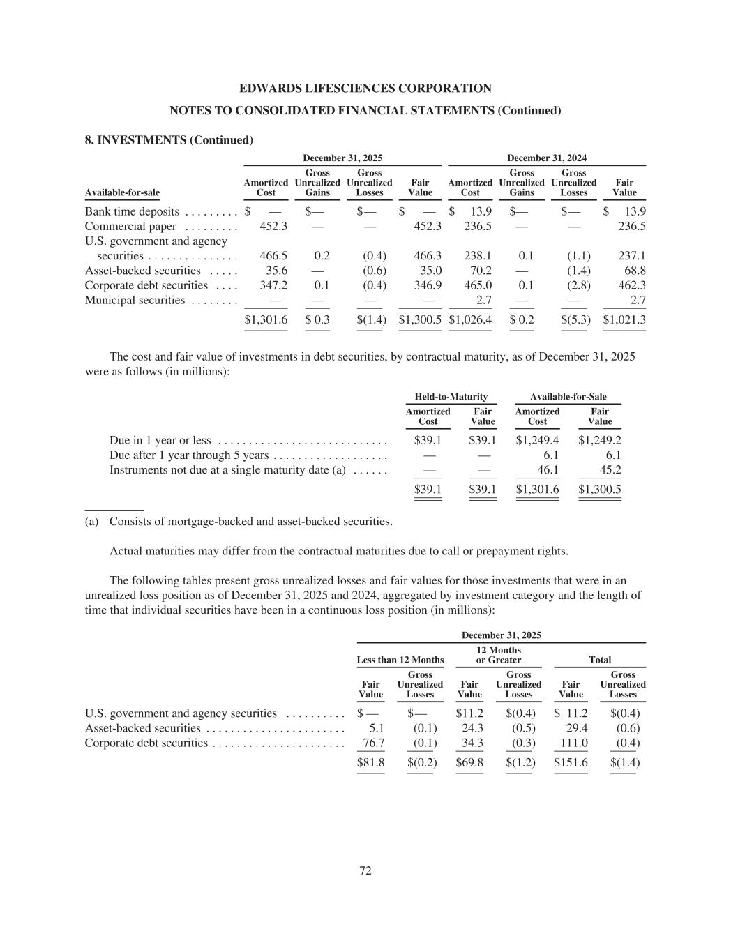 EDWARDS LIFESCIENCES CORPORATION NOTES TO CONSOLIDATED FINANCIAL STATEMENTS (Continued) 8. INVESTMENTS (Continued) December 31, 2025 December 31, 2024 Available-for-sale Amortized Cost Gross Unrealized Gains Gross Unrealized Losses Fair Value Amortized Cost Gross Unrealized Gains Gross Unrealized Losses Fair Value Bank time deposits . . . . . . . . . $ — $— $— $ — $ 13.9 $— $— $ 13.9 Commercial paper . . . . . . . . . 452.3 — — 452.3 236.5 — — 236.5 U.S. government and agency securities . . . . . . . . . . . . . . . 466.5 0.2 (0.4) 466.3 238.1 0.1 (1.1) 237.1 Asset-backed securities . . . . . 35.6 — (0.6) 35.0 70.2 — (1.4) 68.8 Corporate debt securities . . . . 347.2 0.1 (0.4) 346.9 465.0 0.1 (2.8) 462.3 Municipal securities . . . . . . . . — — — — 2.7 — — 2.7 $1,301.6 $ 0.3 $(1.4) $1,300.5 $1,026.4 $ 0.2 $(5.3) $1,021.3 The cost and fair value of investments in debt securities, by contractual maturity, as of December 31, 2025 were as follows (in millions): Held-to-Maturity Available-for-Sale Amortized Cost Fair Value Amortized Cost Fair Value Due in 1 year or less . . . . . . . . . . . . . . . . . . . . . . . . . . . . $39.1 $39.1 $1,249.4 $1,249.2 Due after 1 year through 5 years . . . . . . . . . . . . . . . . . . . — — 6.1 6.1 Instruments not due at a single maturity date (a) . . . . . . — — 46.1 45.2 $39.1 $39.1 $1,301.6 $1,300.5 (a) Consists of mortgage-backed and asset-backed securities. Actual maturities may differ from the contractual maturities due to call or prepayment rights. The following tables present gross unrealized losses and fair values for those investments that were in an unrealized loss position as of December 31, 2025 and 2024, aggregated by investment category and the length of time that individual securities have been in a continuous loss position (in millions): December 31, 2025 Less than 12 Months 12 Months or Greater Total Fair Value Gross Unrealized Losses Fair Value Gross Unrealized Losses Fair Value Gross Unrealized Losses U.S. government and agency securities . . . . . . . . . . $ — $— $11.2 $(0.4) $ 11.2 $(0.4) Asset-backed securities . . . . . . . . . . . . . . . . . . . . . . . 5.1 (0.1) 24.3 (0.5) 29.4 (0.6) Corporate debt securities . . . . . . . . . . . . . . . . . . . . . . 76.7 (0.1) 34.3 (0.3) 111.0 (0.4) $81.8 $(0.2) $69.8 $(1.2) $151.6 $(1.4) 72