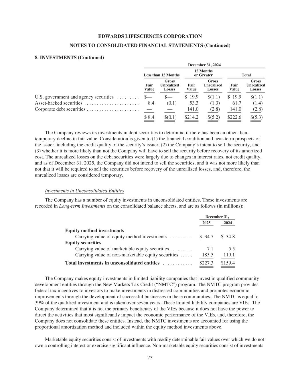 EDWARDS LIFESCIENCES CORPORATION NOTES TO CONSOLIDATED FINANCIAL STATEMENTS (Continued) 8. INVESTMENTS (Continued) December 31, 2024 Less than 12 Months 12 Months or Greater Total Fair Value Gross Unrealized Losses Fair Value Gross Unrealized Losses Fair Value Gross Unrealized Losses U.S. government and agency securities . . . . . . . . . $— $— $ 19.9 $(1.1) $ 19.9 $(1.1) Asset-backed securities . . . . . . . . . . . . . . . . . . . . . . 8.4 (0.1) 53.3 (1.3) 61.7 (1.4) Corporate debt securities . . . . . . . . . . . . . . . . . . . . . — — 141.0 (2.8) 141.0 (2.8) $ 8.4 $(0.1) $214.2 $(5.2) $222.6 $(5.3) The Company reviews its investments in debt securities to determine if there has been an other-than- temporary decline in fair value. Consideration is given to (1) the financial condition and near-term prospects of the issuer, including the credit quality of the security’s issuer, (2) the Company’s intent to sell the security, and (3) whether it is more likely than not the Company will have to sell the security before recovery of its amortized cost. The unrealized losses on the debt securities were largely due to changes in interest rates, not credit quality, and as of December 31, 2025, the Company did not intend to sell the securities, and it was not more likely than not that it will be required to sell the securities before recovery of the unrealized losses, and, therefore, the unrealized losses are considered temporary. Investments in Unconsolidated Entities The Company has a number of equity investments in unconsolidated entities. These investments are recorded in Long-term Investments on the consolidated balance sheets, and are as follows (in millions): December 31, 2025 2024 Equity method investments Carrying value of equity method investments . . . . . . . . . $ 34.7 $ 34.8 Equity securities Carrying value of marketable equity securities . . . . . . . . . 7.1 5.5 Carrying value of non-marketable equity securities . . . . . 185.5 119.1 Total investments in unconsolidated entities . . . . . . . . . . . . $227.3 $159.4 The Company makes equity investments in limited liability companies that invest in qualified community development entities through the New Markets Tax Credit (“NMTC”) program. The NMTC program provides federal tax incentives to investors to make investments in distressed communities and promotes economic improvements through the development of successful businesses in these communities. The NMTC is equal to 39% of the qualified investment and is taken over seven years. These limited liability companies are VIEs. The Company determined that it is not the primary beneficiary of the VIEs because it does not have the power to direct the activities that most significantly impact the economic performance of the VIEs, and, therefore, the Company does not consolidate these entities. Instead, the NMTC investments are accounted for using the proportional amortization method and included within the equity method investments above. Marketable equity securities consist of investments with readily determinable fair values over which we do not own a controlling interest or exercise significant influence. Non-marketable equity securities consist of investments 73