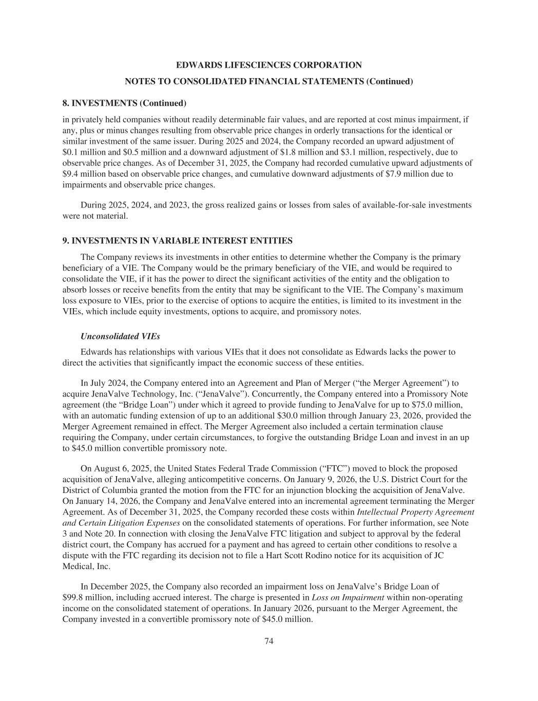 EDWARDS LIFESCIENCES CORPORATION NOTES TO CONSOLIDATED FINANCIAL STATEMENTS (Continued) 8. INVESTMENTS (Continued) in privately held companies without readily determinable fair values, and are reported at cost minus impairment, if any, plus or minus changes resulting from observable price changes in orderly transactions for the identical or similar investment of the same issuer. During 2025 and 2024, the Company recorded an upward adjustment of $0.1 million and $0.5 million and a downward adjustment of $1.8 million and $3.1 million, respectively, due to observable price changes. As of December 31, 2025, the Company had recorded cumulative upward adjustments of $9.4 million based on observable price changes, and cumulative downward adjustments of $7.9 million due to impairments and observable price changes. During 2025, 2024, and 2023, the gross realized gains or losses from sales of available-for-sale investments were not material. 9. INVESTMENTS IN VARIABLE INTEREST ENTITIES The Company reviews its investments in other entities to determine whether the Company is the primary beneficiary of a VIE. The Company would be the primary beneficiary of the VIE, and would be required to consolidate the VIE, if it has the power to direct the significant activities of the entity and the obligation to absorb losses or receive benefits from the entity that may be significant to the VIE. The Company’s maximum loss exposure to VIEs, prior to the exercise of options to acquire the entities, is limited to its investment in the VIEs, which include equity investments, options to acquire, and promissory notes. Unconsolidated VIEs Edwards has relationships with various VIEs that it does not consolidate as Edwards lacks the power to direct the activities that significantly impact the economic success of these entities. In July 2024, the Company entered into an Agreement and Plan of Merger (“the Merger Agreement”) to acquire JenaValve Technology, Inc. (“JenaValve”). Concurrently, the Company entered into a Promissory Note agreement (the “Bridge Loan”) under which it agreed to provide funding to JenaValve for up to $75.0 million, with an automatic funding extension of up to an additional $30.0 million through January 23, 2026, provided the Merger Agreement remained in effect. The Merger Agreement also included a certain termination clause requiring the Company, under certain circumstances, to forgive the outstanding Bridge Loan and invest in an up to $45.0 million convertible promissory note. On August 6, 2025, the United States Federal Trade Commission (“FTC”) moved to block the proposed acquisition of JenaValve, alleging anticompetitive concerns. On January 9, 2026, the U.S. District Court for the District of Columbia granted the motion from the FTC for an injunction blocking the acquisition of JenaValve. On January 14, 2026, the Company and JenaValve entered into an incremental agreement terminating the Merger Agreement. As of December 31, 2025, the Company recorded these costs within Intellectual Property Agreement and Certain Litigation Expenses on the consolidated statements of operations. For further information, see Note 3 and Note 20. In connection with closing the JenaValve FTC litigation and subject to approval by the federal district court, the Company has accrued for a payment and has agreed to certain other conditions to resolve a dispute with the FTC regarding its decision not to file a Hart Scott Rodino notice for its acquisition of JC Medical, Inc. In December 2025, the Company also recorded an impairment loss on JenaValve’s Bridge Loan of $99.8 million, including accrued interest. The charge is presented in Loss on Impairment within non-operating income on the consolidated statement of operations. In January 2026, pursuant to the Merger Agreement, the Company invested in a convertible promissory note of $45.0 million. 74