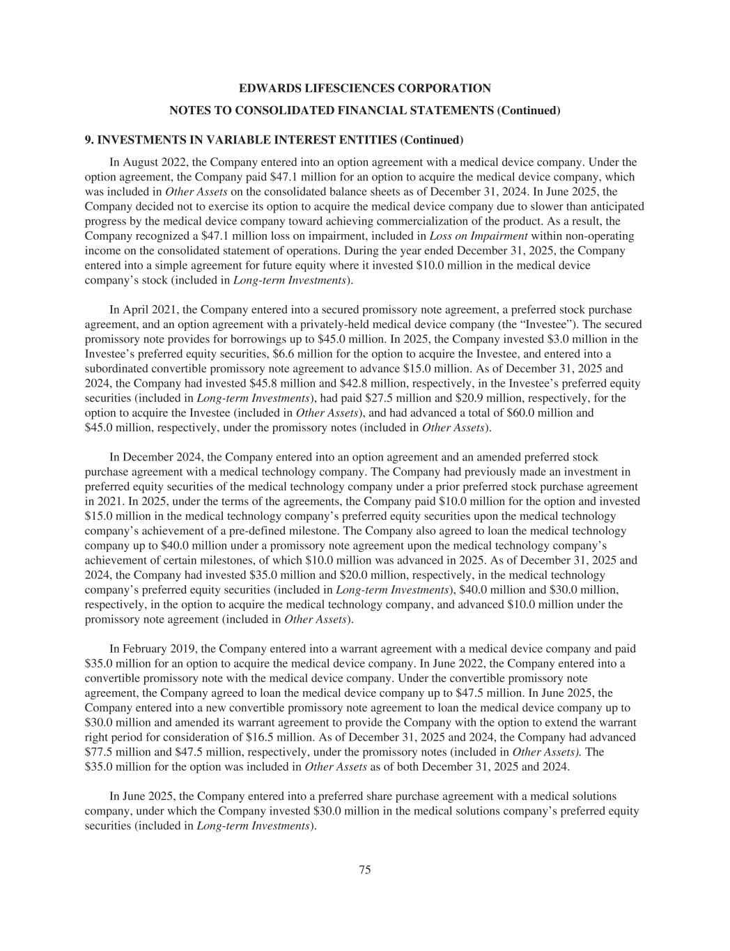 EDWARDS LIFESCIENCES CORPORATION NOTES TO CONSOLIDATED FINANCIAL STATEMENTS (Continued) 9. INVESTMENTS IN VARIABLE INTEREST ENTITIES (Continued) In August 2022, the Company entered into an option agreement with a medical device company. Under the option agreement, the Company paid $47.1 million for an option to acquire the medical device company, which was included in Other Assets on the consolidated balance sheets as of December 31, 2024. In June 2025, the Company decided not to exercise its option to acquire the medical device company due to slower than anticipated progress by the medical device company toward achieving commercialization of the product. As a result, the Company recognized a $47.1 million loss on impairment, included in Loss on Impairment within non-operating income on the consolidated statement of operations. During the year ended December 31, 2025, the Company entered into a simple agreement for future equity where it invested $10.0 million in the medical device company’s stock (included in Long-term Investments). In April 2021, the Company entered into a secured promissory note agreement, a preferred stock purchase agreement, and an option agreement with a privately-held medical device company (the “Investee”). The secured promissory note provides for borrowings up to $45.0 million. In 2025, the Company invested $3.0 million in the Investee’s preferred equity securities, $6.6 million for the option to acquire the Investee, and entered into a subordinated convertible promissory note agreement to advance $15.0 million. As of December 31, 2025 and 2024, the Company had invested $45.8 million and $42.8 million, respectively, in the Investee’s preferred equity securities (included in Long-term Investments), had paid $27.5 million and $20.9 million, respectively, for the option to acquire the Investee (included in Other Assets), and had advanced a total of $60.0 million and $45.0 million, respectively, under the promissory notes (included in Other Assets). In December 2024, the Company entered into an option agreement and an amended preferred stock purchase agreement with a medical technology company. The Company had previously made an investment in preferred equity securities of the medical technology company under a prior preferred stock purchase agreement in 2021. In 2025, under the terms of the agreements, the Company paid $10.0 million for the option and invested $15.0 million in the medical technology company’s preferred equity securities upon the medical technology company’s achievement of a pre-defined milestone. The Company also agreed to loan the medical technology company up to $40.0 million under a promissory note agreement upon the medical technology company’s achievement of certain milestones, of which $10.0 million was advanced in 2025. As of December 31, 2025 and 2024, the Company had invested $35.0 million and $20.0 million, respectively, in the medical technology company’s preferred equity securities (included in Long-term Investments), $40.0 million and $30.0 million, respectively, in the option to acquire the medical technology company, and advanced $10.0 million under the promissory note agreement (included in Other Assets). In February 2019, the Company entered into a warrant agreement with a medical device company and paid $35.0 million for an option to acquire the medical device company. In June 2022, the Company entered into a convertible promissory note with the medical device company. Under the convertible promissory note agreement, the Company agreed to loan the medical device company up to $47.5 million. In June 2025, the Company entered into a new convertible promissory note agreement to loan the medical device company up to $30.0 million and amended its warrant agreement to provide the Company with the option to extend the warrant right period for consideration of $16.5 million. As of December 31, 2025 and 2024, the Company had advanced $77.5 million and $47.5 million, respectively, under the promissory notes (included in Other Assets). The $35.0 million for the option was included in Other Assets as of both December 31, 2025 and 2024. In June 2025, the Company entered into a preferred share purchase agreement with a medical solutions company, under which the Company invested $30.0 million in the medical solutions company’s preferred equity securities (included in Long-term Investments). 75