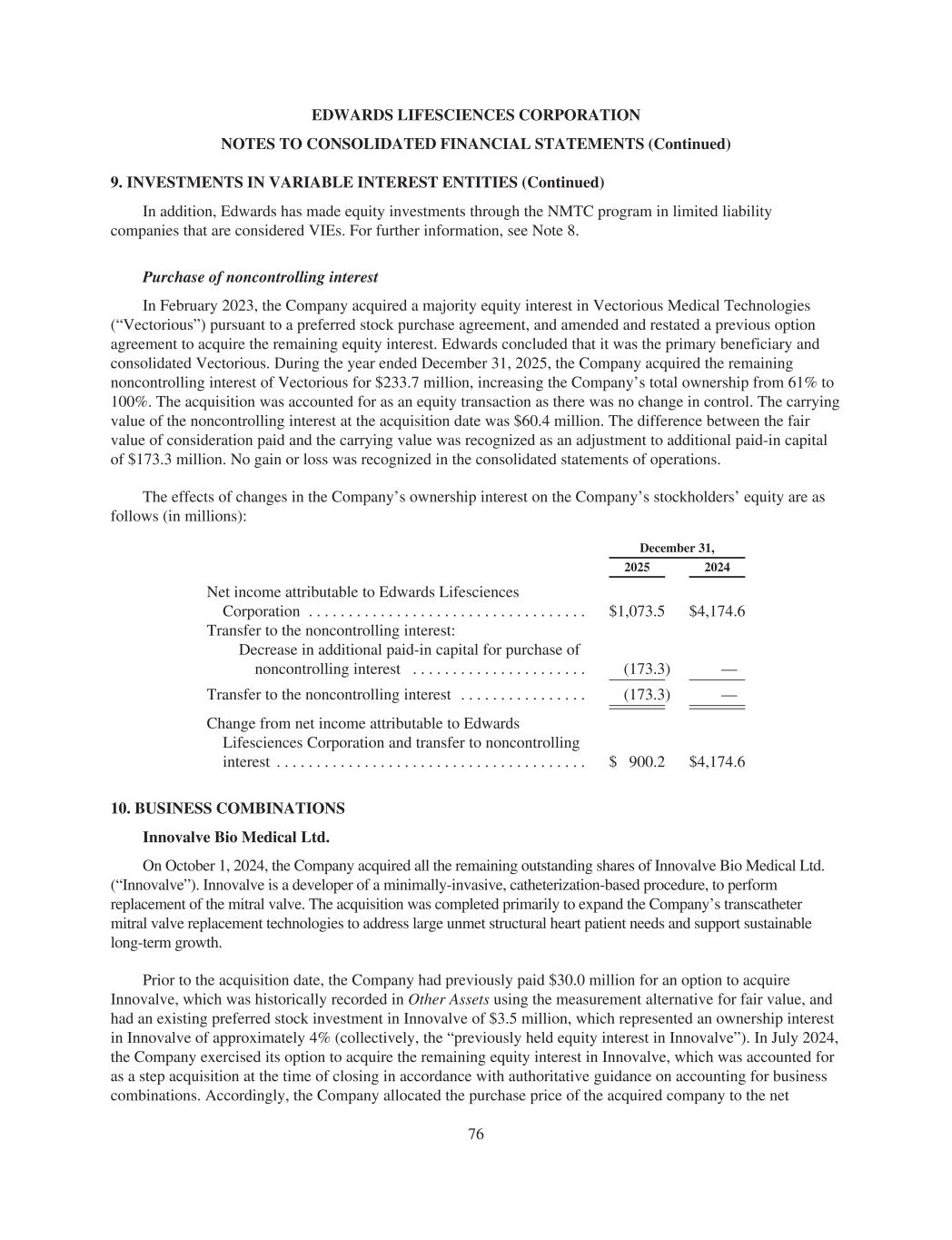 EDWARDS LIFESCIENCES CORPORATION NOTES TO CONSOLIDATED FINANCIAL STATEMENTS (Continued) 9. INVESTMENTS IN VARIABLE INTEREST ENTITIES (Continued) In addition, Edwards has made equity investments through the NMTC program in limited liability companies that are considered VIEs. For further information, see Note 8. Purchase of noncontrolling interest In February 2023, the Company acquired a majority equity interest in Vectorious Medical Technologies (“Vectorious”) pursuant to a preferred stock purchase agreement, and amended and restated a previous option agreement to acquire the remaining equity interest. Edwards concluded that it was the primary beneficiary and consolidated Vectorious. During the year ended December 31, 2025, the Company acquired the remaining noncontrolling interest of Vectorious for $233.7 million, increasing the Company’s total ownership from 61% to 100%. The acquisition was accounted for as an equity transaction as there was no change in control. The carrying value of the noncontrolling interest at the acquisition date was $60.4 million. The difference between the fair value of consideration paid and the carrying value was recognized as an adjustment to additional paid-in capital of $173.3 million. No gain or loss was recognized in the consolidated statements of operations. The effects of changes in the Company’s ownership interest on the Company’s stockholders’ equity are as follows (in millions): December 31, 2025 2024 Net income attributable to Edwards Lifesciences Corporation . . . . . . . . . . . . . . . . . . . . . . . . . . . . . . . . . . . $1,073.5 $4,174.6 Transfer to the noncontrolling interest: Decrease in additional paid-in capital for purchase of noncontrolling interest . . . . . . . . . . . . . . . . . . . . . . (173.3) — Transfer to the noncontrolling interest . . . . . . . . . . . . . . . . (173.3) — Change from net income attributable to Edwards Lifesciences Corporation and transfer to noncontrolling interest . . . . . . . . . . . . . . . . . . . . . . . . . . . . . . . . . . . . . . . $ 900.2 $4,174.6 10. BUSINESS COMBINATIONS Innovalve Bio Medical Ltd. On October 1, 2024, the Company acquired all the remaining outstanding shares of Innovalve Bio Medical Ltd. (“Innovalve”). Innovalve is a developer of a minimally-invasive, catheterization-based procedure, to perform replacement of the mitral valve. The acquisition was completed primarily to expand the Company’s transcatheter mitral valve replacement technologies to address large unmet structural heart patient needs and support sustainable long-term growth. Prior to the acquisition date, the Company had previously paid $30.0 million for an option to acquire Innovalve, which was historically recorded in Other Assets using the measurement alternative for fair value, and had an existing preferred stock investment in Innovalve of $3.5 million, which represented an ownership interest in Innovalve of approximately 4% (collectively, the “previously held equity interest in Innovalve”). In July 2024, the Company exercised its option to acquire the remaining equity interest in Innovalve, which was accounted for as a step acquisition at the time of closing in accordance with authoritative guidance on accounting for business combinations. Accordingly, the Company allocated the purchase price of the acquired company to the net 76