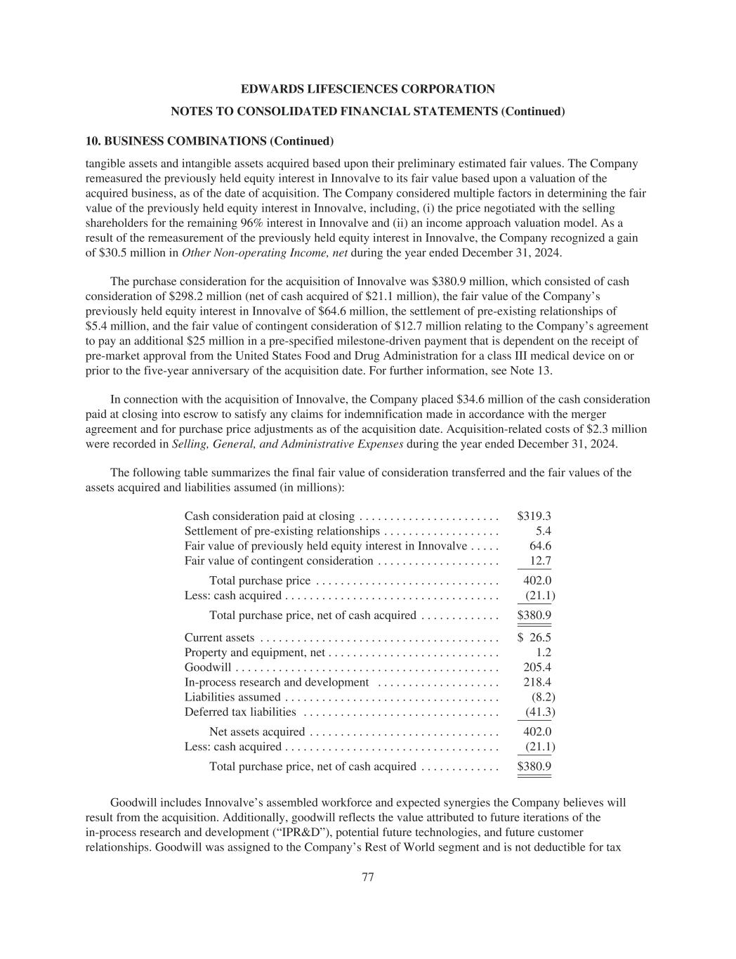 EDWARDS LIFESCIENCES CORPORATION NOTES TO CONSOLIDATED FINANCIAL STATEMENTS (Continued) 10. BUSINESS COMBINATIONS (Continued) tangible assets and intangible assets acquired based upon their preliminary estimated fair values. The Company remeasured the previously held equity interest in Innovalve to its fair value based upon a valuation of the acquired business, as of the date of acquisition. The Company considered multiple factors in determining the fair value of the previously held equity interest in Innovalve, including, (i) the price negotiated with the selling shareholders for the remaining 96% interest in Innovalve and (ii) an income approach valuation model. As a result of the remeasurement of the previously held equity interest in Innovalve, the Company recognized a gain of $30.5 million in Other Non-operating Income, net during the year ended December 31, 2024. The purchase consideration for the acquisition of Innovalve was $380.9 million, which consisted of cash consideration of $298.2 million (net of cash acquired of $21.1 million), the fair value of the Company’s previously held equity interest in Innovalve of $64.6 million, the settlement of pre-existing relationships of $5.4 million, and the fair value of contingent consideration of $12.7 million relating to the Company’s agreement to pay an additional $25 million in a pre-specified milestone-driven payment that is dependent on the receipt of pre-market approval from the United States Food and Drug Administration for a class III medical device on or prior to the five-year anniversary of the acquisition date. For further information, see Note 13. In connection with the acquisition of Innovalve, the Company placed $34.6 million of the cash consideration paid at closing into escrow to satisfy any claims for indemnification made in accordance with the merger agreement and for purchase price adjustments as of the acquisition date. Acquisition-related costs of $2.3 million were recorded in Selling, General, and Administrative Expenses during the year ended December 31, 2024. The following table summarizes the final fair value of consideration transferred and the fair values of the assets acquired and liabilities assumed (in millions): Cash consideration paid at closing . . . . . . . . . . . . . . . . . . . . . . . $319.3 Settlement of pre-existing relationships . . . . . . . . . . . . . . . . . . . 5.4 Fair value of previously held equity interest in Innovalve . . . . . 64.6 Fair value of contingent consideration . . . . . . . . . . . . . . . . . . . . 12.7 Total purchase price . . . . . . . . . . . . . . . . . . . . . . . . . . . . . . 402.0 Less: cash acquired . . . . . . . . . . . . . . . . . . . . . . . . . . . . . . . . . . . (21.1) Total purchase price, net of cash acquired . . . . . . . . . . . . . $380.9 Current assets . . . . . . . . . . . . . . . . . . . . . . . . . . . . . . . . . . . . . . . $ 26.5 Property and equipment, net . . . . . . . . . . . . . . . . . . . . . . . . . . . . 1.2 Goodwill . . . . . . . . . . . . . . . . . . . . . . . . . . . . . . . . . . . . . . . . . . . 205.4 In-process research and development . . . . . . . . . . . . . . . . . . . . 218.4 Liabilities assumed . . . . . . . . . . . . . . . . . . . . . . . . . . . . . . . . . . . (8.2) Deferred tax liabilities . . . . . . . . . . . . . . . . . . . . . . . . . . . . . . . . (41.3) Net assets acquired . . . . . . . . . . . . . . . . . . . . . . . . . . . . . . . 402.0 Less: cash acquired . . . . . . . . . . . . . . . . . . . . . . . . . . . . . . . . . . . (21.1) Total purchase price, net of cash acquired . . . . . . . . . . . . . $380.9 Goodwill includes Innovalve’s assembled workforce and expected synergies the Company believes will result from the acquisition. Additionally, goodwill reflects the value attributed to future iterations of the in-process research and development (“IPR&D”), potential future technologies, and future customer relationships. Goodwill was assigned to the Company’s Rest of World segment and is not deductible for tax 77