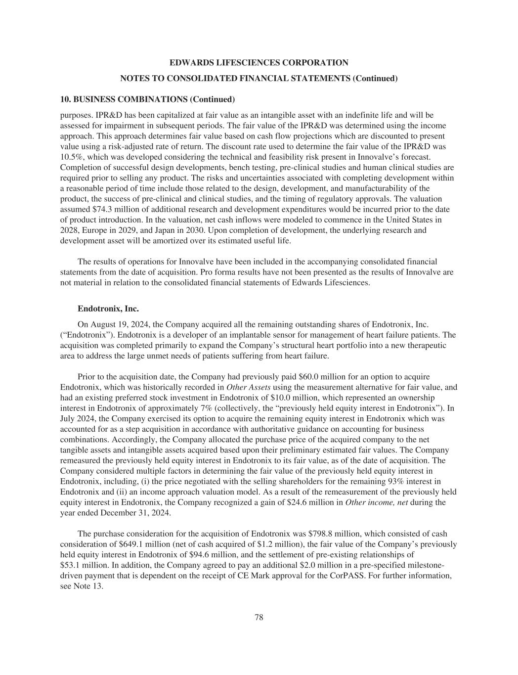 EDWARDS LIFESCIENCES CORPORATION NOTES TO CONSOLIDATED FINANCIAL STATEMENTS (Continued) 10. BUSINESS COMBINATIONS (Continued) purposes. IPR&D has been capitalized at fair value as an intangible asset with an indefinite life and will be assessed for impairment in subsequent periods. The fair value of the IPR&D was determined using the income approach. This approach determines fair value based on cash flow projections which are discounted to present value using a risk-adjusted rate of return. The discount rate used to determine the fair value of the IPR&D was 10.5%, which was developed considering the technical and feasibility risk present in Innovalve’s forecast. Completion of successful design developments, bench testing, pre-clinical studies and human clinical studies are required prior to selling any product. The risks and uncertainties associated with completing development within a reasonable period of time include those related to the design, development, and manufacturability of the product, the success of pre-clinical and clinical studies, and the timing of regulatory approvals. The valuation assumed $74.3 million of additional research and development expenditures would be incurred prior to the date of product introduction. In the valuation, net cash inflows were modeled to commence in the United States in 2028, Europe in 2029, and Japan in 2030. Upon completion of development, the underlying research and development asset will be amortized over its estimated useful life. The results of operations for Innovalve have been included in the accompanying consolidated financial statements from the date of acquisition. Pro forma results have not been presented as the results of Innovalve are not material in relation to the consolidated financial statements of Edwards Lifesciences. Endotronix, Inc. On August 19, 2024, the Company acquired all the remaining outstanding shares of Endotronix, Inc. (“Endotronix”). Endotronix is a developer of an implantable sensor for management of heart failure patients. The acquisition was completed primarily to expand the Company’s structural heart portfolio into a new therapeutic area to address the large unmet needs of patients suffering from heart failure. Prior to the acquisition date, the Company had previously paid $60.0 million for an option to acquire Endotronix, which was historically recorded in Other Assets using the measurement alternative for fair value, and had an existing preferred stock investment in Endotronix of $10.0 million, which represented an ownership interest in Endotronix of approximately 7% (collectively, the “previously held equity interest in Endotronix”). In July 2024, the Company exercised its option to acquire the remaining equity interest in Endotronix which was accounted for as a step acquisition in accordance with authoritative guidance on accounting for business combinations. Accordingly, the Company allocated the purchase price of the acquired company to the net tangible assets and intangible assets acquired based upon their preliminary estimated fair values. The Company remeasured the previously held equity interest in Endotronix to its fair value, as of the date of acquisition. The Company considered multiple factors in determining the fair value of the previously held equity interest in Endotronix, including, (i) the price negotiated with the selling shareholders for the remaining 93% interest in Endotronix and (ii) an income approach valuation model. As a result of the remeasurement of the previously held equity interest in Endotronix, the Company recognized a gain of $24.6 million in Other income, net during the year ended December 31, 2024. The purchase consideration for the acquisition of Endotronix was $798.8 million, which consisted of cash consideration of $649.1 million (net of cash acquired of $1.2 million), the fair value of the Company’s previously held equity interest in Endotronix of $94.6 million, and the settlement of pre-existing relationships of $53.1 million. In addition, the Company agreed to pay an additional $2.0 million in a pre-specified milestone- driven payment that is dependent on the receipt of CE Mark approval for the CorPASS. For further information, see Note 13. 78