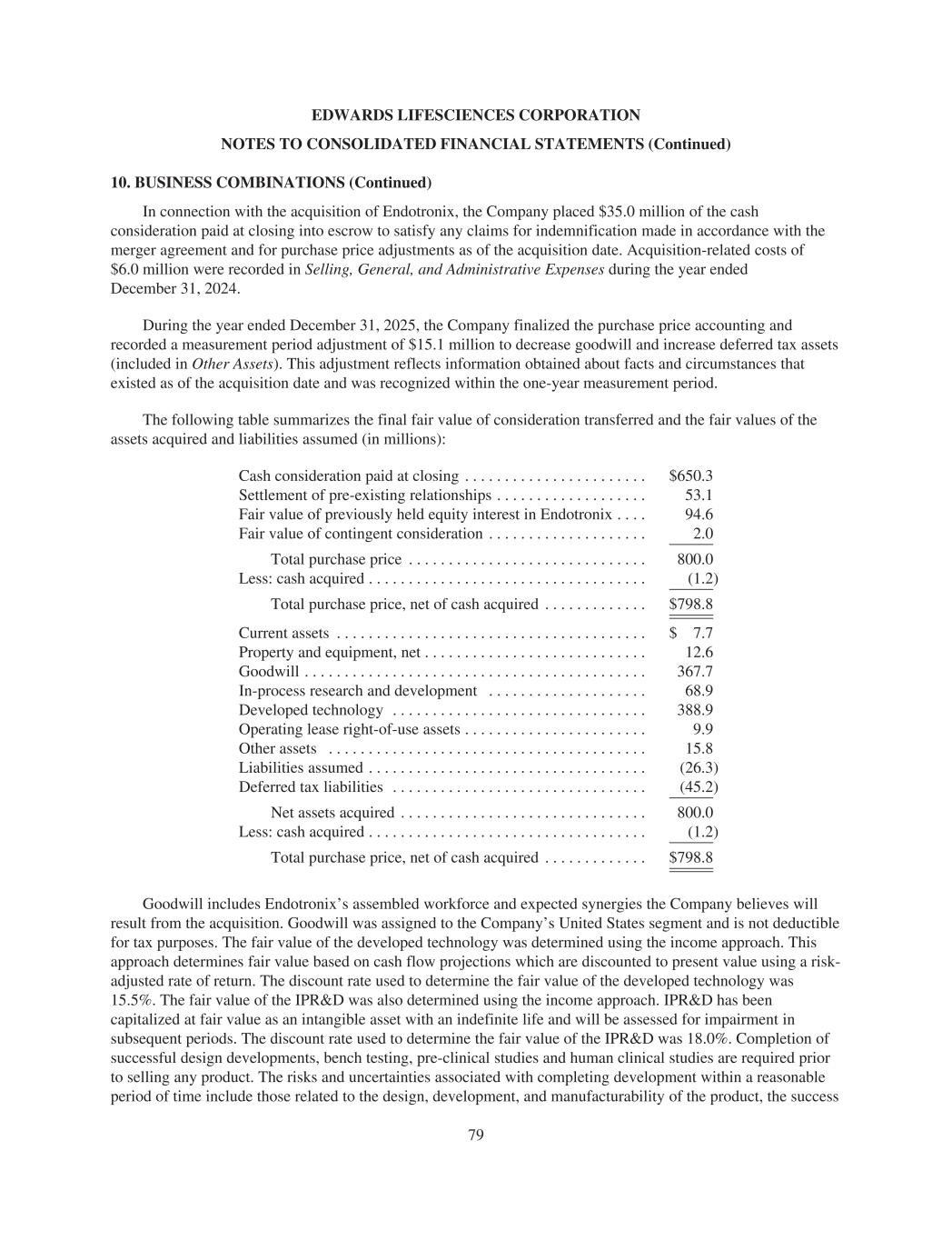 EDWARDS LIFESCIENCES CORPORATION NOTES TO CONSOLIDATED FINANCIAL STATEMENTS (Continued) 10. BUSINESS COMBINATIONS (Continued) In connection with the acquisition of Endotronix, the Company placed $35.0 million of the cash consideration paid at closing into escrow to satisfy any claims for indemnification made in accordance with the merger agreement and for purchase price adjustments as of the acquisition date. Acquisition-related costs of $6.0 million were recorded in Selling, General, and Administrative Expenses during the year ended December 31, 2024. During the year ended December 31, 2025, the Company finalized the purchase price accounting and recorded a measurement period adjustment of $15.1 million to decrease goodwill and increase deferred tax assets (included in Other Assets). This adjustment reflects information obtained about facts and circumstances that existed as of the acquisition date and was recognized within the one-year measurement period. The following table summarizes the final fair value of consideration transferred and the fair values of the assets acquired and liabilities assumed (in millions): Cash consideration paid at closing . . . . . . . . . . . . . . . . . . . . . . . $650.3 Settlement of pre-existing relationships . . . . . . . . . . . . . . . . . . . 53.1 Fair value of previously held equity interest in Endotronix . . . . 94.6 Fair value of contingent consideration . . . . . . . . . . . . . . . . . . . . 2.0 Total purchase price . . . . . . . . . . . . . . . . . . . . . . . . . . . . . . 800.0 Less: cash acquired . . . . . . . . . . . . . . . . . . . . . . . . . . . . . . . . . . . (1.2) Total purchase price, net of cash acquired . . . . . . . . . . . . . $798.8 Current assets . . . . . . . . . . . . . . . . . . . . . . . . . . . . . . . . . . . . . . . $ 7.7 Property and equipment, net . . . . . . . . . . . . . . . . . . . . . . . . . . . . 12.6 Goodwill . . . . . . . . . . . . . . . . . . . . . . . . . . . . . . . . . . . . . . . . . . . 367.7 In-process research and development . . . . . . . . . . . . . . . . . . . . 68.9 Developed technology . . . . . . . . . . . . . . . . . . . . . . . . . . . . . . . . 388.9 Operating lease right-of-use assets . . . . . . . . . . . . . . . . . . . . . . . 9.9 Other assets . . . . . . . . . . . . . . . . . . . . . . . . . . . . . . . . . . . . . . . . 15.8 Liabilities assumed . . . . . . . . . . . . . . . . . . . . . . . . . . . . . . . . . . . (26.3) Deferred tax liabilities . . . . . . . . . . . . . . . . . . . . . . . . . . . . . . . . (45.2) Net assets acquired . . . . . . . . . . . . . . . . . . . . . . . . . . . . . . . 800.0 Less: cash acquired . . . . . . . . . . . . . . . . . . . . . . . . . . . . . . . . . . . (1.2) Total purchase price, net of cash acquired . . . . . . . . . . . . . $798.8 Goodwill includes Endotronix’s assembled workforce and expected synergies the Company believes will result from the acquisition. Goodwill was assigned to the Company’s United States segment and is not deductible for tax purposes. The fair value of the developed technology was determined using the income approach. This approach determines fair value based on cash flow projections which are discounted to present value using a risk- adjusted rate of return. The discount rate used to determine the fair value of the developed technology was 15.5%. The fair value of the IPR&D was also determined using the income approach. IPR&D has been capitalized at fair value as an intangible asset with an indefinite life and will be assessed for impairment in subsequent periods. The discount rate used to determine the fair value of the IPR&D was 18.0%. Completion of successful design developments, bench testing, pre-clinical studies and human clinical studies are required prior to selling any product. The risks and uncertainties associated with completing development within a reasonable period of time include those related to the design, development, and manufacturability of the product, the success 79