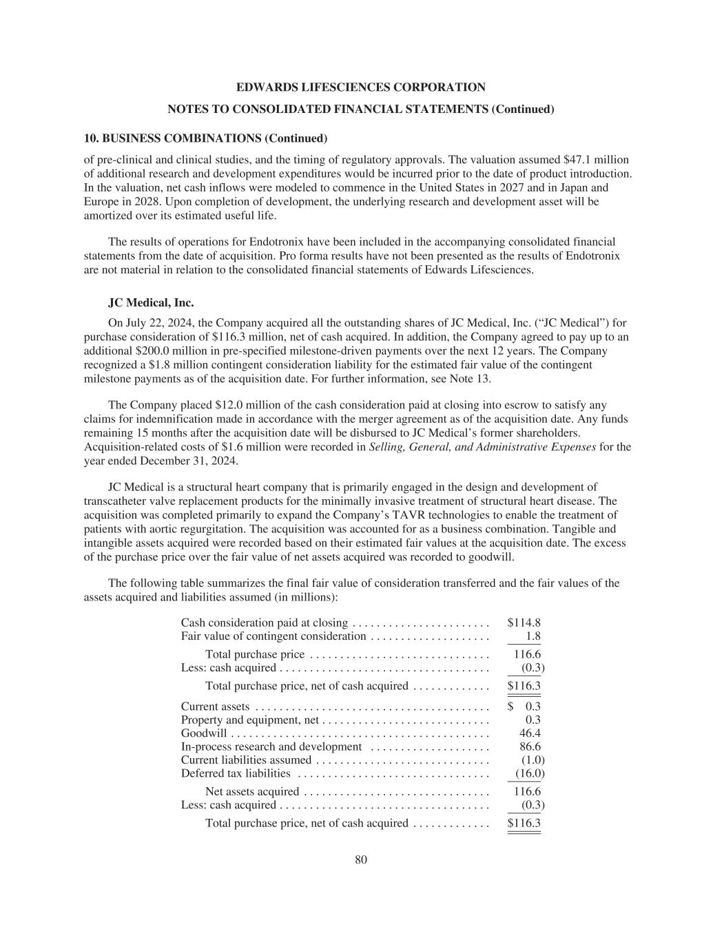 EDWARDS LIFESCIENCES CORPORATION NOTES TO CONSOLIDATED FINANCIAL STATEMENTS (Continued) 10. BUSINESS COMBINATIONS (Continued) of pre-clinical and clinical studies, and the timing of regulatory approvals. The valuation assumed $47.1 million of additional research and development expenditures would be incurred prior to the date of product introduction. In the valuation, net cash inflows were modeled to commence in the United States in 2027 and in Japan and Europe in 2028. Upon completion of development, the underlying research and development asset will be amortized over its estimated useful life. The results of operations for Endotronix have been included in the accompanying consolidated financial statements from the date of acquisition. Pro forma results have not been presented as the results of Endotronix are not material in relation to the consolidated financial statements of Edwards Lifesciences. JC Medical, Inc. On July 22, 2024, the Company acquired all the outstanding shares of JC Medical, Inc. (“JC Medical”) for purchase consideration of $116.3 million, net of cash acquired. In addition, the Company agreed to pay up to an additional $200.0 million in pre-specified milestone-driven payments over the next 12 years. The Company recognized a $1.8 million contingent consideration liability for the estimated fair value of the contingent milestone payments as of the acquisition date. For further information, see Note 13. The Company placed $12.0 million of the cash consideration paid at closing into escrow to satisfy any claims for indemnification made in accordance with the merger agreement as of the acquisition date. Any funds remaining 15 months after the acquisition date will be disbursed to JC Medical’s former shareholders. Acquisition-related costs of $1.6 million were recorded in Selling, General, and Administrative Expenses for the year ended December 31, 2024. JC Medical is a structural heart company that is primarily engaged in the design and development of transcatheter valve replacement products for the minimally invasive treatment of structural heart disease. The acquisition was completed primarily to expand the Company’s TAVR technologies to enable the treatment of patients with aortic regurgitation. The acquisition was accounted for as a business combination. Tangible and intangible assets acquired were recorded based on their estimated fair values at the acquisition date. The excess of the purchase price over the fair value of net assets acquired was recorded to goodwill. The following table summarizes the final fair value of consideration transferred and the fair values of the assets acquired and liabilities assumed (in millions): Cash consideration paid at closing . . . . . . . . . . . . . . . . . . . . . . . $114.8 Fair value of contingent consideration . . . . . . . . . . . . . . . . . . . . 1.8 Total purchase price . . . . . . . . . . . . . . . . . . . . . . . . . . . . . . 116.6 Less: cash acquired . . . . . . . . . . . . . . . . . . . . . . . . . . . . . . . . . . . (0.3) Total purchase price, net of cash acquired . . . . . . . . . . . . . $116.3 Current assets . . . . . . . . . . . . . . . . . . . . . . . . . . . . . . . . . . . . . . . $ 0.3 Property and equipment, net . . . . . . . . . . . . . . . . . . . . . . . . . . . . 0.3 Goodwill . . . . . . . . . . . . . . . . . . . . . . . . . . . . . . . . . . . . . . . . . . . 46.4 In-process research and development . . . . . . . . . . . . . . . . . . . . 86.6 Current liabilities assumed . . . . . . . . . . . . . . . . . . . . . . . . . . . . . (1.0) Deferred tax liabilities . . . . . . . . . . . . . . . . . . . . . . . . . . . . . . . . (16.0) Net assets acquired . . . . . . . . . . . . . . . . . . . . . . . . . . . . . . . 116.6 Less: cash acquired . . . . . . . . . . . . . . . . . . . . . . . . . . . . . . . . . . . (0.3) Total purchase price, net of cash acquired . . . . . . . . . . . . . $116.3 80