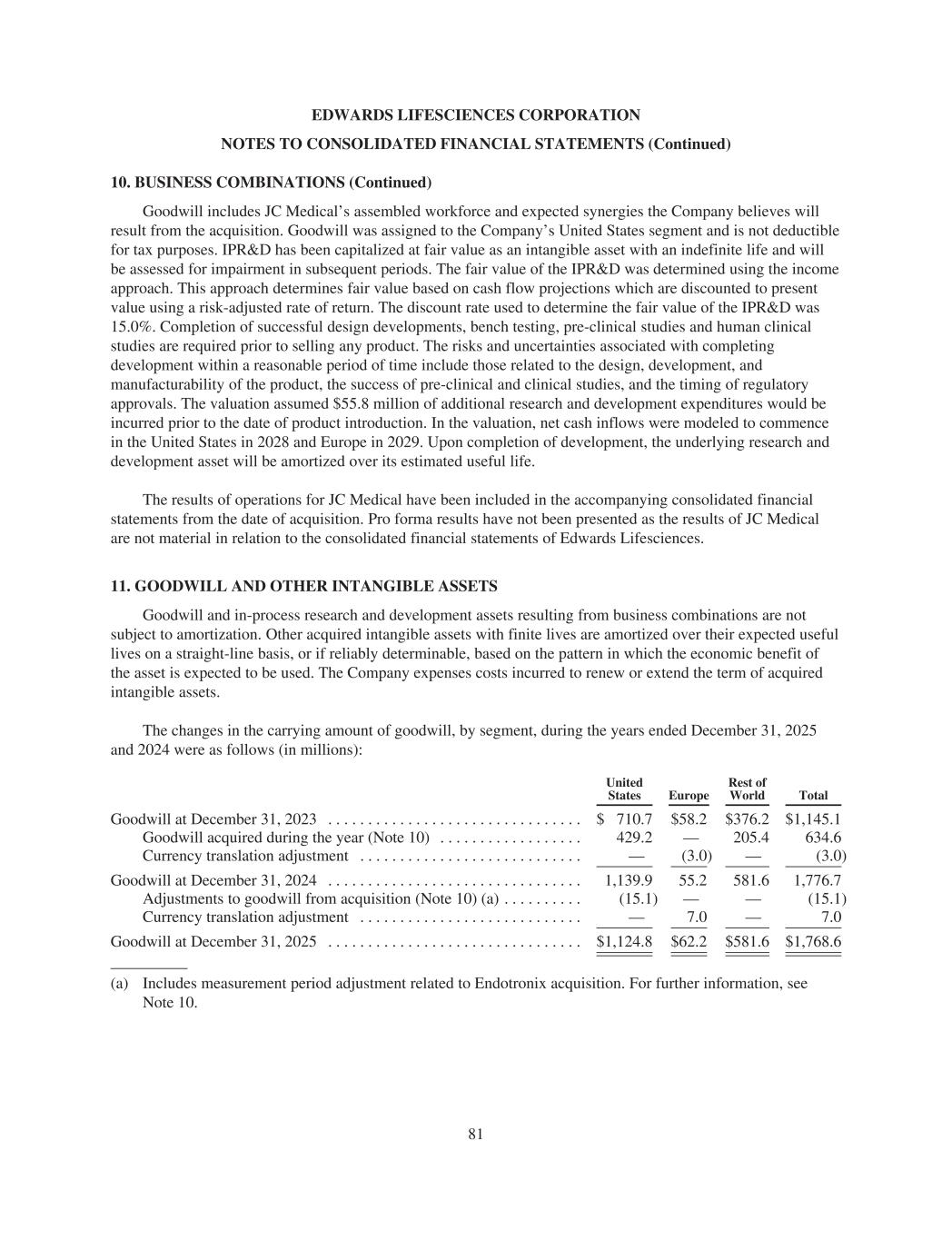 EDWARDS LIFESCIENCES CORPORATION NOTES TO CONSOLIDATED FINANCIAL STATEMENTS (Continued) 10. BUSINESS COMBINATIONS (Continued) Goodwill includes JC Medical’s assembled workforce and expected synergies the Company believes will result from the acquisition. Goodwill was assigned to the Company’s United States segment and is not deductible for tax purposes. IPR&D has been capitalized at fair value as an intangible asset with an indefinite life and will be assessed for impairment in subsequent periods. The fair value of the IPR&D was determined using the income approach. This approach determines fair value based on cash flow projections which are discounted to present value using a risk-adjusted rate of return. The discount rate used to determine the fair value of the IPR&D was 15.0%. Completion of successful design developments, bench testing, pre-clinical studies and human clinical studies are required prior to selling any product. The risks and uncertainties associated with completing development within a reasonable period of time include those related to the design, development, and manufacturability of the product, the success of pre-clinical and clinical studies, and the timing of regulatory approvals. The valuation assumed $55.8 million of additional research and development expenditures would be incurred prior to the date of product introduction. In the valuation, net cash inflows were modeled to commence in the United States in 2028 and Europe in 2029. Upon completion of development, the underlying research and development asset will be amortized over its estimated useful life. The results of operations for JC Medical have been included in the accompanying consolidated financial statements from the date of acquisition. Pro forma results have not been presented as the results of JC Medical are not material in relation to the consolidated financial statements of Edwards Lifesciences. 11. GOODWILL AND OTHER INTANGIBLE ASSETS Goodwill and in-process research and development assets resulting from business combinations are not subject to amortization. Other acquired intangible assets with finite lives are amortized over their expected useful lives on a straight-line basis, or if reliably determinable, based on the pattern in which the economic benefit of the asset is expected to be used. The Company expenses costs incurred to renew or extend the term of acquired intangible assets. The changes in the carrying amount of goodwill, by segment, during the years ended December 31, 2025 and 2024 were as follows (in millions): United States Europe Rest of World Total Goodwill at December 31, 2023 . . . . . . . . . . . . . . . . . . . . . . . . . . . . . . . . $ 710.7 $58.2 $376.2 $1,145.1 Goodwill acquired during the year (Note 10) . . . . . . . . . . . . . . . . . . 429.2 — 205.4 634.6 Currency translation adjustment . . . . . . . . . . . . . . . . . . . . . . . . . . . . — (3.0) — (3.0) Goodwill at December 31, 2024 . . . . . . . . . . . . . . . . . . . . . . . . . . . . . . . . 1,139.9 55.2 581.6 1,776.7 Adjustments to goodwill from acquisition (Note 10) (a) . . . . . . . . . . (15.1) — — (15.1) Currency translation adjustment . . . . . . . . . . . . . . . . . . . . . . . . . . . . — 7.0 — 7.0 Goodwill at December 31, 2025 . . . . . . . . . . . . . . . . . . . . . . . . . . . . . . . . $1,124.8 $62.2 $581.6 $1,768.6 (a) Includes measurement period adjustment related to Endotronix acquisition. For further information, see Note 10. 81