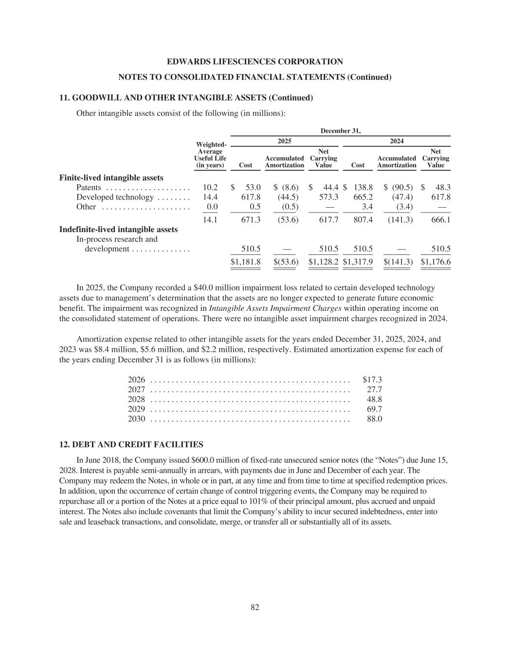 EDWARDS LIFESCIENCES CORPORATION NOTES TO CONSOLIDATED FINANCIAL STATEMENTS (Continued) 11. GOODWILL AND OTHER INTANGIBLE ASSETS (Continued) Other intangible assets consist of the following (in millions): December 31, Weighted- Average Useful Life (in years) 2025 2024 Cost Accumulated Amortization Net Carrying Value Cost Accumulated Amortization Net Carrying Value Finite-lived intangible assets Patents . . . . . . . . . . . . . . . . . . . . 10.2 $ 53.0 $ (8.6) $ 44.4 $ 138.8 $ (90.5) $ 48.3 Developed technology . . . . . . . . 14.4 617.8 (44.5) 573.3 665.2 (47.4) 617.8 Other . . . . . . . . . . . . . . . . . . . . . 0.0 0.5 (0.5) — 3.4 (3.4) — 14.1 671.3 (53.6) 617.7 807.4 (141.3) 666.1 Indefinite-lived intangible assets In-process research and development . . . . . . . . . . . . . . 510.5 — 510.5 510.5 — 510.5 $1,181.8 $(53.6) $1,128.2 $1,317.9 $(141.3) $1,176.6 In 2025, the Company recorded a $40.0 million impairment loss related to certain developed technology assets due to management’s determination that the assets are no longer expected to generate future economic benefit. The impairment was recognized in Intangible Assets Impairment Charges within operating income on the consolidated statement of operations. There were no intangible asset impairment charges recognized in 2024. Amortization expense related to other intangible assets for the years ended December 31, 2025, 2024, and 2023 was $8.4 million, $5.6 million, and $2.2 million, respectively. Estimated amortization expense for each of the years ending December 31 is as follows (in millions): 2026 . . . . . . . . . . . . . . . . . . . . . . . . . . . . . . . . . . . . . . . . . . . . . . . $17.3 2027 . . . . . . . . . . . . . . . . . . . . . . . . . . . . . . . . . . . . . . . . . . . . . . . 27.7 2028 . . . . . . . . . . . . . . . . . . . . . . . . . . . . . . . . . . . . . . . . . . . . . . . 48.8 2029 . . . . . . . . . . . . . . . . . . . . . . . . . . . . . . . . . . . . . . . . . . . . . . . 69.7 2030 . . . . . . . . . . . . . . . . . . . . . . . . . . . . . . . . . . . . . . . . . . . . . . . 88.0 12. DEBT AND CREDIT FACILITIES In June 2018, the Company issued $600.0 million of fixed-rate unsecured senior notes (the “Notes”) due June 15, 2028. Interest is payable semi-annually in arrears, with payments due in June and December of each year. The Company may redeem the Notes, in whole or in part, at any time and from time to time at specified redemption prices. In addition, upon the occurrence of certain change of control triggering events, the Company may be required to repurchase all or a portion of the Notes at a price equal to 101% of their principal amount, plus accrued and unpaid interest. The Notes also include covenants that limit the Company’s ability to incur secured indebtedness, enter into sale and leaseback transactions, and consolidate, merge, or transfer all or substantially all of its assets. 82