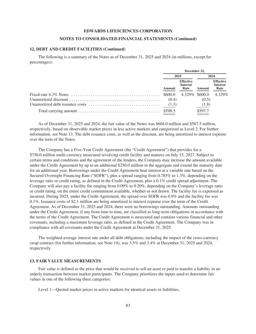 EDWARDS LIFESCIENCES CORPORATION NOTES TO CONSOLIDATED FINANCIAL STATEMENTS (Continued) 12. DEBT AND CREDIT FACILITIES (Continued) The following is a summary of the Notes as of December 31, 2025 and 2024 (in millions, except for percentages): December 31, 2025 2024 Amount Effective Interest Rate Amount Effective Interest Rate Fixed-rate 4.3% Notes . . . . . . . . . . . . . . . . . . . . . . . . . . . . . . . . . . . . . . . . . $600.0 4.329% $600.0 4.329% Unamortized discount . . . . . . . . . . . . . . . . . . . . . . . . . . . . . . . . . . . . . . . . . . (0.4) (0.5) Unamortized debt issuance costs . . . . . . . . . . . . . . . . . . . . . . . . . . . . . . . . . (1.3) (1.8) Total carrying amount . . . . . . . . . . . . . . . . . . . . . . . . . . . . . . . . . . . . . . $598.3 $597.7 As of December 31, 2025 and 2024, the fair value of the Notes was $604.0 million and $587.5 million, respectively, based on observable market prices in less active markets and categorized as Level 2. For further information, see Note 13. The debt issuance costs, as well as the discount, are being amortized to interest expense over the term of the Notes. The Company has a Five-Year Credit Agreement (the “Credit Agreement”) that provides for a $750.0 million multi-currency unsecured revolving credit facility and matures on July 15, 2027. Subject to certain terms and conditions and the agreement of the lenders, the Company may increase the amount available under the Credit Agreement by up to an additional $250.0 million in the aggregate and extend the maturity date for an additional year. Borrowings under the Credit Agreement bear interest at a variable rate based on the Secured Overnight Financing Rate (“SOFR”), plus a spread ranging from 0.785% to 1.3%, depending on the leverage ratio or credit rating, as defined in the Credit Agreement, plus a 0.1% credit spread adjustment. The Company will also pay a facility fee ranging from 0.09% to 0.20%, depending on the Company’s leverage ratio or credit rating, on the entire credit commitment available, whether or not drawn. The facility fee is expensed as incurred. During 2025, under the Credit Agreement, the spread over SOFR was 0.9% and the facility fee was 0.1%. Issuance costs of $2.1 million are being amortized to interest expense over the term of the Credit Agreement. As of December 31, 2025 and 2024, there were no borrowings outstanding. Amounts outstanding under the Credit Agreement, if any from time to time, are classified as long-term obligations in accordance with the terms of the Credit Agreement. The Credit Agreement is unsecured and contains various financial and other covenants, including a maximum leverage ratio, as defined in the Credit Agreement. The Company was in compliance with all covenants under the Credit Agreement at December 31, 2025. The weighted-average interest rate under all debt obligations, including the impact of the cross-currency swap contract (for further information, see Note 14), was 3.5% and 3.4% at December 31, 2025 and 2024, respectively. 13. FAIR VALUE MEASUREMENTS Fair value is defined as the price that would be received to sell an asset or paid to transfer a liability in an orderly transaction between market participants. The Company prioritizes the inputs used to determine fair values in one of the following three categories: Level 1—Quoted market prices in active markets for identical assets or liabilities. 83