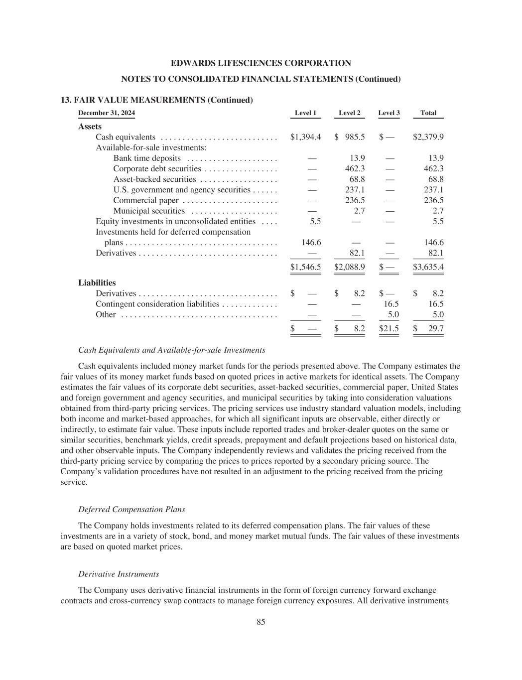 EDWARDS LIFESCIENCES CORPORATION NOTES TO CONSOLIDATED FINANCIAL STATEMENTS (Continued) 13. FAIR VALUE MEASUREMENTS (Continued) December 31, 2024 Level 1 Level 2 Level 3 Total Assets Cash equivalents . . . . . . . . . . . . . . . . . . . . . . . . . . . $1,394.4 $ 985.5 $ — $2,379.9 Available-for-sale investments: Bank time deposits . . . . . . . . . . . . . . . . . . . . . — 13.9 — 13.9 Corporate debt securities . . . . . . . . . . . . . . . . . — 462.3 — 462.3 Asset-backed securities . . . . . . . . . . . . . . . . . . — 68.8 — 68.8 U.S. government and agency securities . . . . . . — 237.1 — 237.1 Commercial paper . . . . . . . . . . . . . . . . . . . . . . — 236.5 — 236.5 Municipal securities . . . . . . . . . . . . . . . . . . . . — 2.7 — 2.7 Equity investments in unconsolidated entities . . . . 5.5 — — 5.5 Investments held for deferred compensation plans . . . . . . . . . . . . . . . . . . . . . . . . . . . . . . . . . . . 146.6 — — 146.6 Derivatives . . . . . . . . . . . . . . . . . . . . . . . . . . . . . . . . — 82.1 — 82.1 $1,546.5 $2,088.9 $ — $3,635.4 Liabilities Derivatives . . . . . . . . . . . . . . . . . . . . . . . . . . . . . . . . $ — $ 8.2 $ — $ 8.2 Contingent consideration liabilities . . . . . . . . . . . . . — — 16.5 16.5 Other . . . . . . . . . . . . . . . . . . . . . . . . . . . . . . . . . . . . — — 5.0 5.0 $ — $ 8.2 $21.5 $ 29.7 Cash Equivalents and Available-for-sale Investments Cash equivalents included money market funds for the periods presented above. The Company estimates the fair values of its money market funds based on quoted prices in active markets for identical assets. The Company estimates the fair values of its corporate debt securities, asset-backed securities, commercial paper, United States and foreign government and agency securities, and municipal securities by taking into consideration valuations obtained from third-party pricing services. The pricing services use industry standard valuation models, including both income and market-based approaches, for which all significant inputs are observable, either directly or indirectly, to estimate fair value. These inputs include reported trades and broker-dealer quotes on the same or similar securities, benchmark yields, credit spreads, prepayment and default projections based on historical data, and other observable inputs. The Company independently reviews and validates the pricing received from the third-party pricing service by comparing the prices to prices reported by a secondary pricing source. The Company’s validation procedures have not resulted in an adjustment to the pricing received from the pricing service. Deferred Compensation Plans The Company holds investments related to its deferred compensation plans. The fair values of these investments are in a variety of stock, bond, and money market mutual funds. The fair values of these investments are based on quoted market prices. Derivative Instruments The Company uses derivative financial instruments in the form of foreign currency forward exchange contracts and cross-currency swap contracts to manage foreign currency exposures. All derivative instruments 85