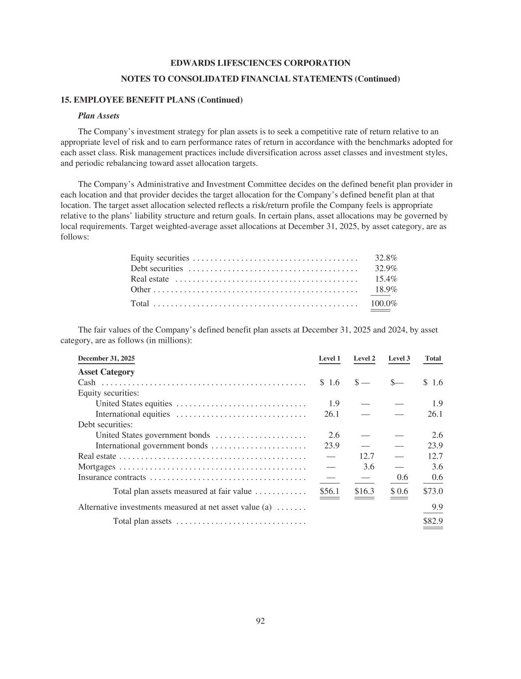 EDWARDS LIFESCIENCES CORPORATION NOTES TO CONSOLIDATED FINANCIAL STATEMENTS (Continued) 15. EMPLOYEE BENEFIT PLANS (Continued) Plan Assets The Company’s investment strategy for plan assets is to seek a competitive rate of return relative to an appropriate level of risk and to earn performance rates of return in accordance with the benchmarks adopted for each asset class. Risk management practices include diversification across asset classes and investment styles, and periodic rebalancing toward asset allocation targets. The Company’s Administrative and Investment Committee decides on the defined benefit plan provider in each location and that provider decides the target allocation for the Company’s defined benefit plan at that location. The target asset allocation selected reflects a risk/return profile the Company feels is appropriate relative to the plans’ liability structure and return goals. In certain plans, asset allocations may be governed by local requirements. Target weighted-average asset allocations at December 31, 2025, by asset category, are as follows: Equity securities . . . . . . . . . . . . . . . . . . . . . . . . . . . . . . . . . . . . . . 32.8% Debt securities . . . . . . . . . . . . . . . . . . . . . . . . . . . . . . . . . . . . . . . 32.9% Real estate . . . . . . . . . . . . . . . . . . . . . . . . . . . . . . . . . . . . . . . . . . 15.4% Other . . . . . . . . . . . . . . . . . . . . . . . . . . . . . . . . . . . . . . . . . . . . . . . 18.9% Total . . . . . . . . . . . . . . . . . . . . . . . . . . . . . . . . . . . . . . . . . . . . . . . 100.0% The fair values of the Company’s defined benefit plan assets at December 31, 2025 and 2024, by asset category, are as follows (in millions): December 31, 2025 Level 1 Level 2 Level 3 Total Asset Category Cash . . . . . . . . . . . . . . . . . . . . . . . . . . . . . . . . . . . . . . . . . . . . . . . $ 1.6 $ — $— $ 1.6 Equity securities: United States equities . . . . . . . . . . . . . . . . . . . . . . . . . . . . . . 1.9 — — 1.9 International equities . . . . . . . . . . . . . . . . . . . . . . . . . . . . . . 26.1 — — 26.1 Debt securities: United States government bonds . . . . . . . . . . . . . . . . . . . . . 2.6 — — 2.6 International government bonds . . . . . . . . . . . . . . . . . . . . . . 23.9 — — 23.9 Real estate . . . . . . . . . . . . . . . . . . . . . . . . . . . . . . . . . . . . . . . . . . . — 12.7 — 12.7 Mortgages . . . . . . . . . . . . . . . . . . . . . . . . . . . . . . . . . . . . . . . . . . . — 3.6 — 3.6 Insurance contracts . . . . . . . . . . . . . . . . . . . . . . . . . . . . . . . . . . . . — — 0.6 0.6 Total plan assets measured at fair value . . . . . . . . . . . . $56.1 $16.3 $ 0.6 $73.0 Alternative investments measured at net asset value (a) . . . . . . . 9.9 Total plan assets . . . . . . . . . . . . . . . . . . . . . . . . . . . . . . $82.9 92