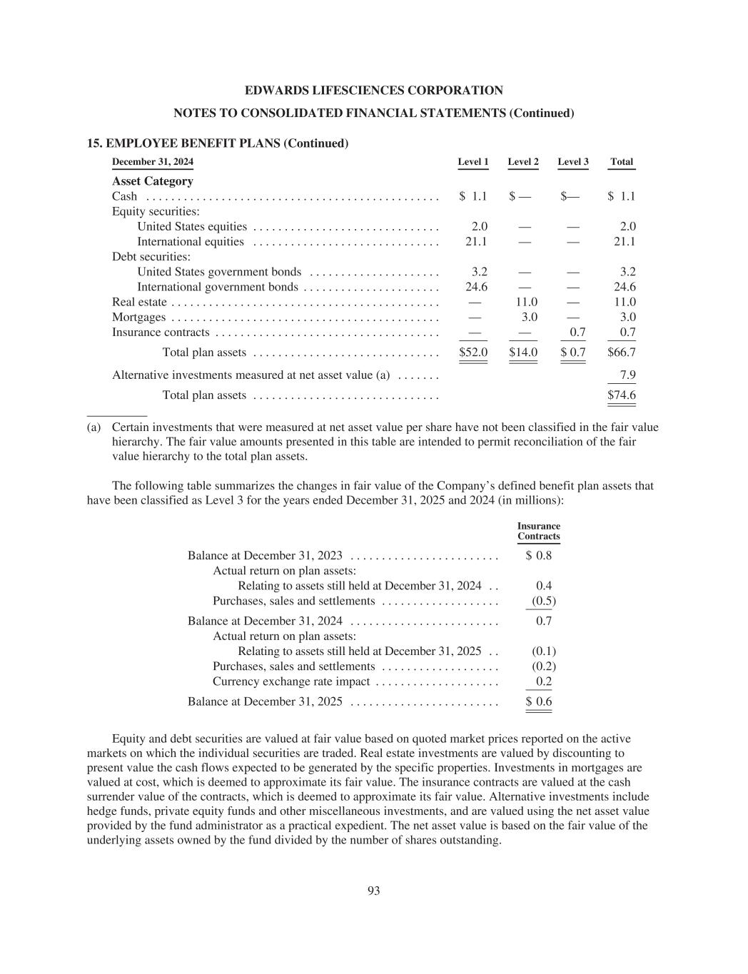 EDWARDS LIFESCIENCES CORPORATION NOTES TO CONSOLIDATED FINANCIAL STATEMENTS (Continued) 15. EMPLOYEE BENEFIT PLANS (Continued) December 31, 2024 Level 1 Level 2 Level 3 Total Asset Category Cash . . . . . . . . . . . . . . . . . . . . . . . . . . . . . . . . . . . . . . . . . . . . . . . $ 1.1 $ — $— $ 1.1 Equity securities: United States equities . . . . . . . . . . . . . . . . . . . . . . . . . . . . . . 2.0 — — 2.0 International equities . . . . . . . . . . . . . . . . . . . . . . . . . . . . . . 21.1 — — 21.1 Debt securities: United States government bonds . . . . . . . . . . . . . . . . . . . . . 3.2 — — 3.2 International government bonds . . . . . . . . . . . . . . . . . . . . . . 24.6 — — 24.6 Real estate . . . . . . . . . . . . . . . . . . . . . . . . . . . . . . . . . . . . . . . . . . . — 11.0 — 11.0 Mortgages . . . . . . . . . . . . . . . . . . . . . . . . . . . . . . . . . . . . . . . . . . . — 3.0 — 3.0 Insurance contracts . . . . . . . . . . . . . . . . . . . . . . . . . . . . . . . . . . . . — — 0.7 0.7 Total plan assets . . . . . . . . . . . . . . . . . . . . . . . . . . . . . . $52.0 $14.0 $ 0.7 $66.7 Alternative investments measured at net asset value (a) . . . . . . . 7.9 Total plan assets . . . . . . . . . . . . . . . . . . . . . . . . . . . . . . $74.6 (a) Certain investments that were measured at net asset value per share have not been classified in the fair value hierarchy. The fair value amounts presented in this table are intended to permit reconciliation of the fair value hierarchy to the total plan assets. The following table summarizes the changes in fair value of the Company’s defined benefit plan assets that have been classified as Level 3 for the years ended December 31, 2025 and 2024 (in millions): Insurance Contracts Balance at December 31, 2023 . . . . . . . . . . . . . . . . . . . . . . . . $ 0.8 Actual return on plan assets: Relating to assets still held at December 31, 2024 . . 0.4 Purchases, sales and settlements . . . . . . . . . . . . . . . . . . . (0.5) Balance at December 31, 2024 . . . . . . . . . . . . . . . . . . . . . . . . 0.7 Actual return on plan assets: Relating to assets still held at December 31, 2025 . . (0.1) Purchases, sales and settlements . . . . . . . . . . . . . . . . . . . (0.2) Currency exchange rate impact . . . . . . . . . . . . . . . . . . . . 0.2 Balance at December 31, 2025 . . . . . . . . . . . . . . . . . . . . . . . . $ 0.6 Equity and debt securities are valued at fair value based on quoted market prices reported on the active markets on which the individual securities are traded. Real estate investments are valued by discounting to present value the cash flows expected to be generated by the specific properties. Investments in mortgages are valued at cost, which is deemed to approximate its fair value. The insurance contracts are valued at the cash surrender value of the contracts, which is deemed to approximate its fair value. Alternative investments include hedge funds, private equity funds and other miscellaneous investments, and are valued using the net asset value provided by the fund administrator as a practical expedient. The net asset value is based on the fair value of the underlying assets owned by the fund divided by the number of shares outstanding. 93