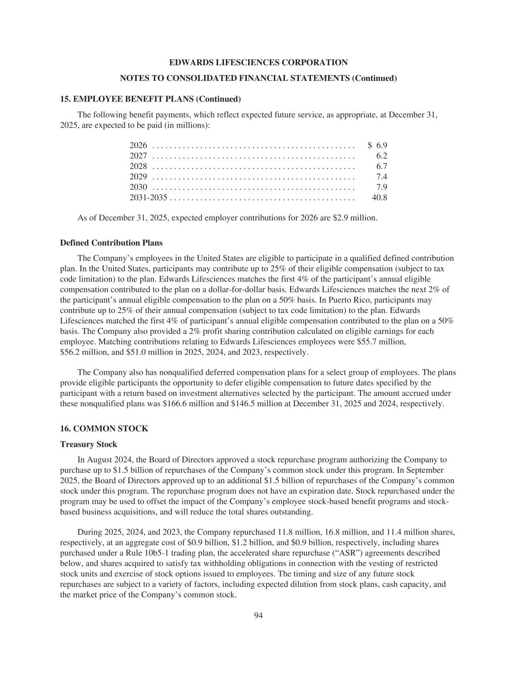 EDWARDS LIFESCIENCES CORPORATION NOTES TO CONSOLIDATED FINANCIAL STATEMENTS (Continued) 15. EMPLOYEE BENEFIT PLANS (Continued) The following benefit payments, which reflect expected future service, as appropriate, at December 31, 2025, are expected to be paid (in millions): 2026 . . . . . . . . . . . . . . . . . . . . . . . . . . . . . . . . . . . . . . . . . . . . . . . $ 6.9 2027 . . . . . . . . . . . . . . . . . . . . . . . . . . . . . . . . . . . . . . . . . . . . . . . 6.2 2028 . . . . . . . . . . . . . . . . . . . . . . . . . . . . . . . . . . . . . . . . . . . . . . . 6.7 2029 . . . . . . . . . . . . . . . . . . . . . . . . . . . . . . . . . . . . . . . . . . . . . . . 7.4 2030 . . . . . . . . . . . . . . . . . . . . . . . . . . . . . . . . . . . . . . . . . . . . . . . 7.9 2031-2035 . . . . . . . . . . . . . . . . . . . . . . . . . . . . . . . . . . . . . . . . . . . 40.8 As of December 31, 2025, expected employer contributions for 2026 are $2.9 million. Defined Contribution Plans The Company’s employees in the United States are eligible to participate in a qualified defined contribution plan. In the United States, participants may contribute up to 25% of their eligible compensation (subject to tax code limitation) to the plan. Edwards Lifesciences matches the first 4% of the participant’s annual eligible compensation contributed to the plan on a dollar-for-dollar basis. Edwards Lifesciences matches the next 2% of the participant’s annual eligible compensation to the plan on a 50% basis. In Puerto Rico, participants may contribute up to 25% of their annual compensation (subject to tax code limitation) to the plan. Edwards Lifesciences matched the first 4% of participant’s annual eligible compensation contributed to the plan on a 50% basis. The Company also provided a 2% profit sharing contribution calculated on eligible earnings for each employee. Matching contributions relating to Edwards Lifesciences employees were $55.7 million, $56.2 million, and $51.0 million in 2025, 2024, and 2023, respectively. The Company also has nonqualified deferred compensation plans for a select group of employees. The plans provide eligible participants the opportunity to defer eligible compensation to future dates specified by the participant with a return based on investment alternatives selected by the participant. The amount accrued under these nonqualified plans was $166.6 million and $146.5 million at December 31, 2025 and 2024, respectively. 16. COMMON STOCK Treasury Stock In August 2024, the Board of Directors approved a stock repurchase program authorizing the Company to purchase up to $1.5 billion of repurchases of the Company’s common stock under this program. In September 2025, the Board of Directors approved up to an additional $1.5 billion of repurchases of the Company’s common stock under this program. The repurchase program does not have an expiration date. Stock repurchased under the program may be used to offset the impact of the Company’s employee stock-based benefit programs and stock- based business acquisitions, and will reduce the total shares outstanding. During 2025, 2024, and 2023, the Company repurchased 11.8 million, 16.8 million, and 11.4 million shares, respectively, at an aggregate cost of $0.9 billion, $1.2 billion, and $0.9 billion, respectively, including shares purchased under a Rule 10b5-1 trading plan, the accelerated share repurchase (“ASR”) agreements described below, and shares acquired to satisfy tax withholding obligations in connection with the vesting of restricted stock units and exercise of stock options issued to employees. The timing and size of any future stock repurchases are subject to a variety of factors, including expected dilution from stock plans, cash capacity, and the market price of the Company’s common stock. 94
