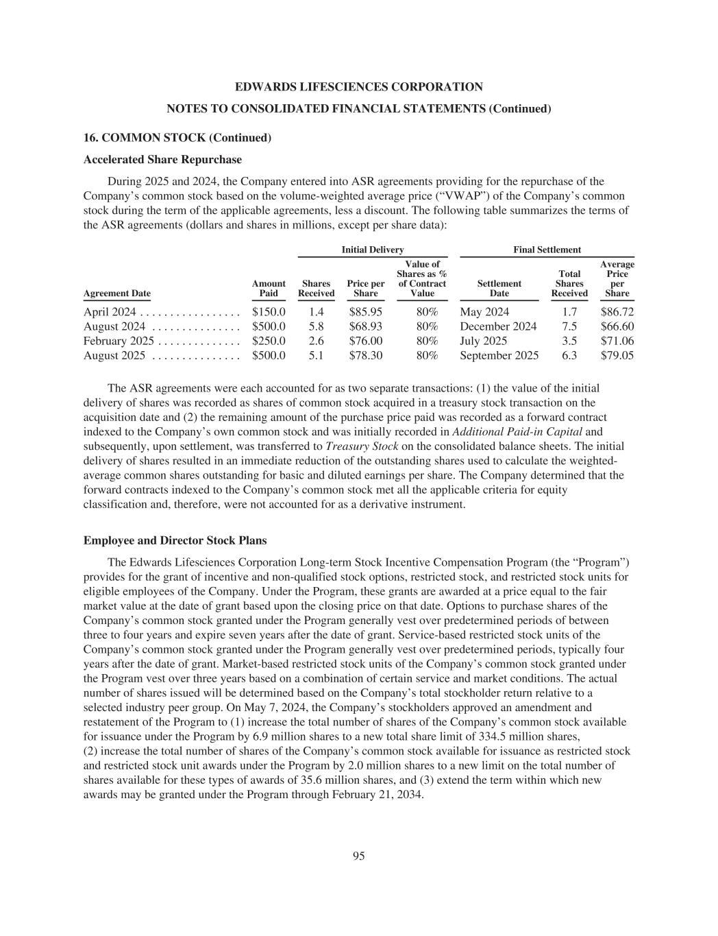 EDWARDS LIFESCIENCES CORPORATION NOTES TO CONSOLIDATED FINANCIAL STATEMENTS (Continued) 16. COMMON STOCK (Continued) Accelerated Share Repurchase During 2025 and 2024, the Company entered into ASR agreements providing for the repurchase of the Company’s common stock based on the volume-weighted average price (“VWAP”) of the Company’s common stock during the term of the applicable agreements, less a discount. The following table summarizes the terms of the ASR agreements (dollars and shares in millions, except per share data): Initial Delivery Final Settlement Agreement Date Amount Paid Shares Received Price per Share Value of Shares as % of Contract Value Settlement Date Total Shares Received Average Price per Share April 2024 . . . . . . . . . . . . . . . . . $150.0 1.4 $85.95 80% May 2024 1.7 $86.72 August 2024 . . . . . . . . . . . . . . . $500.0 5.8 $68.93 80% December 2024 7.5 $66.60 February 2025 . . . . . . . . . . . . . . $250.0 2.6 $76.00 80% July 2025 3.5 $71.06 August 2025 . . . . . . . . . . . . . . . $500.0 5.1 $78.30 80% September 2025 6.3 $79.05 The ASR agreements were each accounted for as two separate transactions: (1) the value of the initial delivery of shares was recorded as shares of common stock acquired in a treasury stock transaction on the acquisition date and (2) the remaining amount of the purchase price paid was recorded as a forward contract indexed to the Company’s own common stock and was initially recorded in Additional Paid-in Capital and subsequently, upon settlement, was transferred to Treasury Stock on the consolidated balance sheets. The initial delivery of shares resulted in an immediate reduction of the outstanding shares used to calculate the weighted- average common shares outstanding for basic and diluted earnings per share. The Company determined that the forward contracts indexed to the Company’s common stock met all the applicable criteria for equity classification and, therefore, were not accounted for as a derivative instrument. Employee and Director Stock Plans The Edwards Lifesciences Corporation Long-term Stock Incentive Compensation Program (the “Program”) provides for the grant of incentive and non-qualified stock options, restricted stock, and restricted stock units for eligible employees of the Company. Under the Program, these grants are awarded at a price equal to the fair market value at the date of grant based upon the closing price on that date. Options to purchase shares of the Company’s common stock granted under the Program generally vest over predetermined periods of between three to four years and expire seven years after the date of grant. Service-based restricted stock units of the Company’s common stock granted under the Program generally vest over predetermined periods, typically four years after the date of grant. Market-based restricted stock units of the Company’s common stock granted under the Program vest over three years based on a combination of certain service and market conditions. The actual number of shares issued will be determined based on the Company’s total stockholder return relative to a selected industry peer group. On May 7, 2024, the Company’s stockholders approved an amendment and restatement of the Program to (1) increase the total number of shares of the Company’s common stock available for issuance under the Program by 6.9 million shares to a new total share limit of 334.5 million shares, (2) increase the total number of shares of the Company’s common stock available for issuance as restricted stock and restricted stock unit awards under the Program by 2.0 million shares to a new limit on the total number of shares available for these types of awards of 35.6 million shares, and (3) extend the term within which new awards may be granted under the Program through February 21, 2034. 95