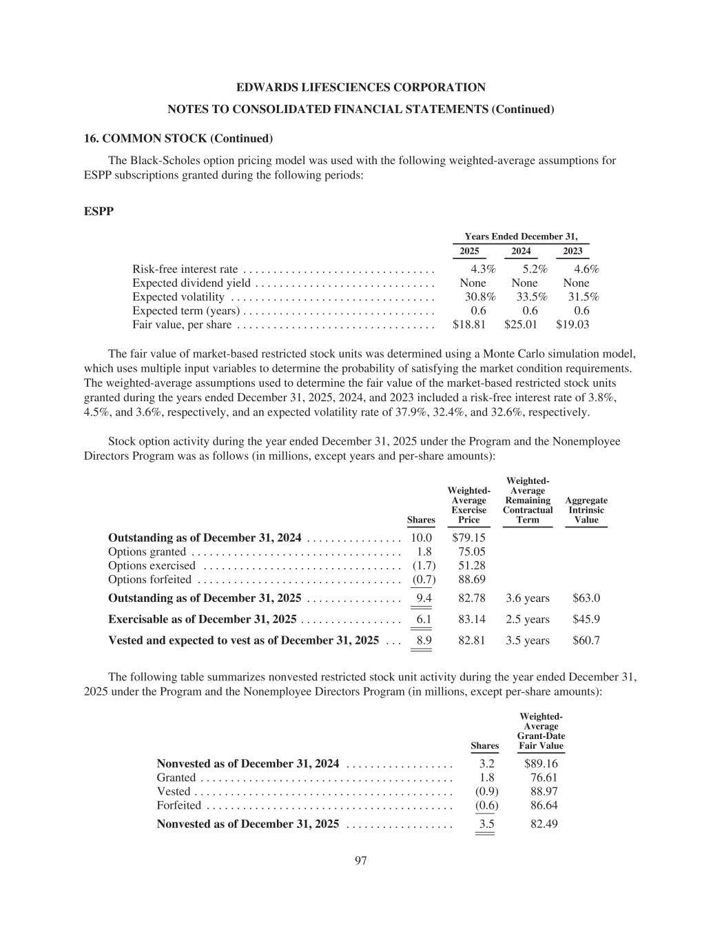 EDWARDS LIFESCIENCES CORPORATION NOTES TO CONSOLIDATED FINANCIAL STATEMENTS (Continued) 16. COMMON STOCK (Continued) The Black-Scholes option pricing model was used with the following weighted-average assumptions for ESPP subscriptions granted during the following periods: ESPP Years Ended December 31, 2025 2024 2023 Risk-free interest rate . . . . . . . . . . . . . . . . . . . . . . . . . . . . . . . . 4.3% 5.2% 4.6% Expected dividend yield . . . . . . . . . . . . . . . . . . . . . . . . . . . . . . None None None Expected volatility . . . . . . . . . . . . . . . . . . . . . . . . . . . . . . . . . . 30.8% 33.5% 31.5% Expected term (years) . . . . . . . . . . . . . . . . . . . . . . . . . . . . . . . . 0.6 0.6 0.6 Fair value, per share . . . . . . . . . . . . . . . . . . . . . . . . . . . . . . . . . $18.81 $25.01 $19.03 The fair value of market-based restricted stock units was determined using a Monte Carlo simulation model, which uses multiple input variables to determine the probability of satisfying the market condition requirements. The weighted-average assumptions used to determine the fair value of the market-based restricted stock units granted during the years ended December 31, 2025, 2024, and 2023 included a risk-free interest rate of 3.8%, 4.5%, and 3.6%, respectively, and an expected volatility rate of 37.9%, 32.4%, and 32.6%, respectively. Stock option activity during the year ended December 31, 2025 under the Program and the Nonemployee Directors Program was as follows (in millions, except years and per-share amounts): Shares Weighted- Average Exercise Price Weighted- Average Remaining Contractual Term Aggregate Intrinsic Value Outstanding as of December 31, 2024 . . . . . . . . . . . . . . . . 10.0 $79.15 Options granted . . . . . . . . . . . . . . . . . . . . . . . . . . . . . . . . . . . 1.8 75.05 Options exercised . . . . . . . . . . . . . . . . . . . . . . . . . . . . . . . . . (1.7) 51.28 Options forfeited . . . . . . . . . . . . . . . . . . . . . . . . . . . . . . . . . . (0.7) 88.69 Outstanding as of December 31, 2025 . . . . . . . . . . . . . . . . 9.4 82.78 3.6 years $63.0 Exercisable as of December 31, 2025 . . . . . . . . . . . . . . . . . 6.1 83.14 2.5 years $45.9 Vested and expected to vest as of December 31, 2025 . . . 8.9 82.81 3.5 years $60.7 The following table summarizes nonvested restricted stock unit activity during the year ended December 31, 2025 under the Program and the Nonemployee Directors Program (in millions, except per-share amounts): Shares Weighted- Average Grant-Date Fair Value Nonvested as of December 31, 2024 . . . . . . . . . . . . . . . . . . 3.2 $89.16 Granted . . . . . . . . . . . . . . . . . . . . . . . . . . . . . . . . . . . . . . . . . . 1.8 76.61 Vested . . . . . . . . . . . . . . . . . . . . . . . . . . . . . . . . . . . . . . . . . . . (0.9) 88.97 Forfeited . . . . . . . . . . . . . . . . . . . . . . . . . . . . . . . . . . . . . . . . . (0.6) 86.64 Nonvested as of December 31, 2025 . . . . . . . . . . . . . . . . . . 3.5 82.49 97