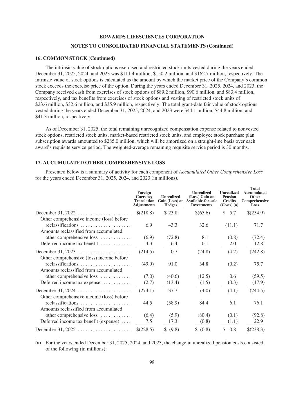 EDWARDS LIFESCIENCES CORPORATION NOTES TO CONSOLIDATED FINANCIAL STATEMENTS (Continued) 16. COMMON STOCK (Continued) The intrinsic value of stock options exercised and restricted stock units vested during the years ended December 31, 2025, 2024, and 2023 was $111.4 million, $150.2 million, and $162.7 million, respectively. The intrinsic value of stock options is calculated as the amount by which the market price of the Company’s common stock exceeds the exercise price of the option. During the years ended December 31, 2025, 2024, and 2023, the Company received cash from exercises of stock options of $89.2 million, $90.6 million, and $83.4 million, respectively, and tax benefits from exercises of stock options and vesting of restricted stock units of $23.6 million, $32.6 million, and $35.9 million, respectively. The total grant-date fair value of stock options vested during the years ended December 31, 2025, 2024, and 2023 were $44.1 million, $44.8 million, and $41.3 million, respectively. As of December 31, 2025, the total remaining unrecognized compensation expense related to nonvested stock options, restricted stock units, market-based restricted stock units, and employee stock purchase plan subscription awards amounted to $285.0 million, which will be amortized on a straight-line basis over each award’s requisite service period. The weighted-average remaining requisite service period is 30 months. 17. ACCUMULATED OTHER COMPREHENSIVE LOSS Presented below is a summary of activity for each component of Accumulated Other Comprehensive Loss for the years ended December 31, 2025, 2024, and 2023 (in millions). Foreign Currency Translation Adjustments Unrealized Gain (Loss) on Hedges Unrealized (Loss) Gain on Available-for-sale Investments Unrealized Pension Credits (Costs) (a) Total Accumulated Other Comprehensive Loss December 31, 2022 . . . . . . . . . . . . . . . . . . . . . $(218.8) $ 23.8 $(65.6) $ 5.7 $(254.9) Other comprehensive income (loss) before reclassifications . . . . . . . . . . . . . . . . . . . . 6.9 43.3 32.6 (11.1) 71.7 Amounts reclassified from accumulated other comprehensive loss . . . . . . . . . . . . (6.9) (72.8) 8.1 (0.8) (72.4) Deferred income tax benefit . . . . . . . . . . . . 4.3 6.4 0.1 2.0 12.8 December 31, 2023 . . . . . . . . . . . . . . . . . . . . . (214.5) 0.7 (24.8) (4.2) (242.8) Other comprehensive (loss) income before reclassifications . . . . . . . . . . . . . . . . . . . . (49.9) 91.0 34.8 (0.2) 75.7 Amounts reclassified from accumulated other comprehensive loss . . . . . . . . . . . . (7.0) (40.6) (12.5) 0.6 (59.5) Deferred income tax expense . . . . . . . . . . . (2.7) (13.4) (1.5) (0.3) (17.9) December 31, 2024 . . . . . . . . . . . . . . . . . . . . . (274.1) 37.7 (4.0) (4.1) (244.5) Other comprehensive income (loss) before reclassifications . . . . . . . . . . . . . . . . . . . . 44.5 (58.9) 84.4 6.1 76.1 Amounts reclassified from accumulated other comprehensive loss . . . . . . . . . . . . (6.4) (5.9) (80.4) (0.1) (92.8) Deferred income tax benefit (expense) . . . . 7.5 17.3 (0.8) (1.1) 22.9 December 31, 2025 . . . . . . . . . . . . . . . . . . . . . $(228.5) $ (9.8) $ (0.8) $ 0.8 $(238.3) (a) For the years ended December 31, 2025, 2024, and 2023, the change in unrealized pension costs consisted of the following (in millions): 98