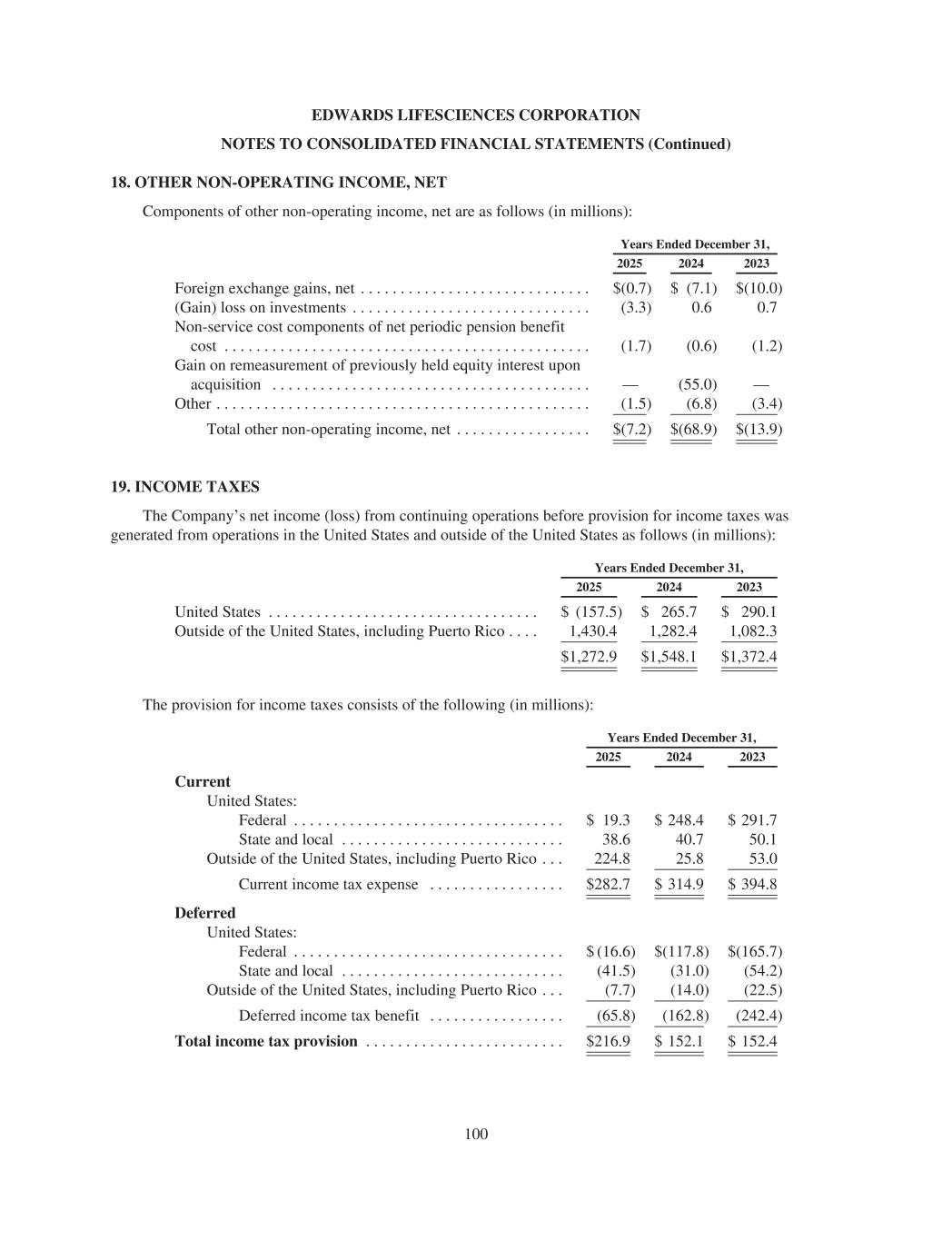 EDWARDS LIFESCIENCES CORPORATION NOTES TO CONSOLIDATED FINANCIAL STATEMENTS (Continued) 18. OTHER NON-OPERATING INCOME, NET Components of other non-operating income, net are as follows (in millions): Years Ended December 31, 2025 2024 2023 Foreign exchange gains, net . . . . . . . . . . . . . . . . . . . . . . . . . . . . . $(0.7) $ (7.1) $(10.0) (Gain) loss on investments . . . . . . . . . . . . . . . . . . . . . . . . . . . . . . (3.3) 0.6 0.7 Non-service cost components of net periodic pension benefit cost . . . . . . . . . . . . . . . . . . . . . . . . . . . . . . . . . . . . . . . . . . . . . . (1.7) (0.6) (1.2) Gain on remeasurement of previously held equity interest upon acquisition . . . . . . . . . . . . . . . . . . . . . . . . . . . . . . . . . . . . . . . . — (55.0) — Other . . . . . . . . . . . . . . . . . . . . . . . . . . . . . . . . . . . . . . . . . . . . . . . (1.5) (6.8) (3.4) Total other non-operating income, net . . . . . . . . . . . . . . . . . $(7.2) $(68.9) $(13.9) 19. INCOME TAXES The Company’s net income (loss) from continuing operations before provision for income taxes was generated from operations in the United States and outside of the United States as follows (in millions): Years Ended December 31, 2025 2024 2023 United States . . . . . . . . . . . . . . . . . . . . . . . . . . . . . . . . . . $ (157.5) $ 265.7 $ 290.1 Outside of the United States, including Puerto Rico . . . . 1,430.4 1,282.4 1,082.3 $1,272.9 $1,548.1 $1,372.4 The provision for income taxes consists of the following (in millions): Years Ended December 31, 2025 2024 2023 Current United States: Federal . . . . . . . . . . . . . . . . . . . . . . . . . . . . . . . . . . $ 19.3 $ 248.4 $ 291.7 State and local . . . . . . . . . . . . . . . . . . . . . . . . . . . . 38.6 40.7 50.1 Outside of the United States, including Puerto Rico . . . 224.8 25.8 53.0 Current income tax expense . . . . . . . . . . . . . . . . . $282.7 $ 314.9 $ 394.8 Deferred United States: Federal . . . . . . . . . . . . . . . . . . . . . . . . . . . . . . . . . . $ (16.6) $(117.8) $(165.7) State and local . . . . . . . . . . . . . . . . . . . . . . . . . . . . (41.5) (31.0) (54.2) Outside of the United States, including Puerto Rico . . . (7.7) (14.0) (22.5) Deferred income tax benefit . . . . . . . . . . . . . . . . . (65.8) (162.8) (242.4) Total income tax provision . . . . . . . . . . . . . . . . . . . . . . . . . $216.9 $ 152.1 $ 152.4 100