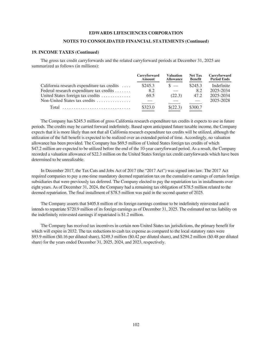EDWARDS LIFESCIENCES CORPORATION NOTES TO CONSOLIDATED FINANCIAL STATEMENTS (Continued) 19. INCOME TAXES (Continued) The gross tax credit carryforwards and the related carryforward periods at December 31, 2025 are summarized as follows (in millions): Carryforward Amount Valuation Allowance Net Tax Benefit Carryforward Period Ends California research expenditure tax credits . . . . $245.3 $ — $245.3 Indefinite Federal research expenditure tax credits . . . . . . . 8.2 — 8.2 2025-2034 United States foreign tax credits . . . . . . . . . . . . . 69.5 (22.3) 47.2 2025-2034 Non-United States tax credits . . . . . . . . . . . . . . . — — — 2025-2028 Total . . . . . . . . . . . . . . . . . . . . . . . . . . . . . . $323.0 $(22.3) $300.7 The Company has $245.3 million of gross California research expenditure tax credits it expects to use in future periods. The credits may be carried forward indefinitely. Based upon anticipated future taxable income, the Company expects that it is more likely than not that all California research expenditure tax credits will be utilized, although the utilization of the full benefit is expected to be realized over an extended period of time. Accordingly, no valuation allowance has been provided. The Company has $69.5 million of United States foreign tax credits of which $47.2 million are expected to be utilized before the end of the 10-year carryforward period. As a result, the Company recorded a valuation allowance of $22.3 million on the United States foreign tax credit carryforwards which have been determined to be unrealizable. In December 2017, the Tax Cuts and Jobs Act of 2017 (the “2017 Act”) was signed into law. The 2017 Act required companies to pay a one-time mandatory deemed repatriation tax on the cumulative earnings of certain foreign subsidiaries that were previously tax deferred. The Company elected to pay the repatriation tax in installments over eight years. As of December 31, 2024, the Company had a remaining tax obligation of $78.5 million related to the deemed repatriation. The final installment of $78.5 million was paid in the second quarter of 2025. The Company asserts that $405.8 million of its foreign earnings continue to be indefinitely reinvested and it intends to repatriate $720.9 million of its foreign earnings as of December 31, 2025. The estimated net tax liability on the indefinitely reinvested earnings if repatriated is $1.2 million. The Company has received tax incentives in certain non-United States tax jurisdictions, the primary benefit for which will expire in 2032. The tax reductions to cash tax expense as compared to the local statutory rates were $93.9 million ($0.16 per diluted share), $249.3 million ($0.42 per diluted share), and $294.2 million ($0.48 per diluted share) for the years ended December 31, 2025, 2024, and 2023, respectively. 102