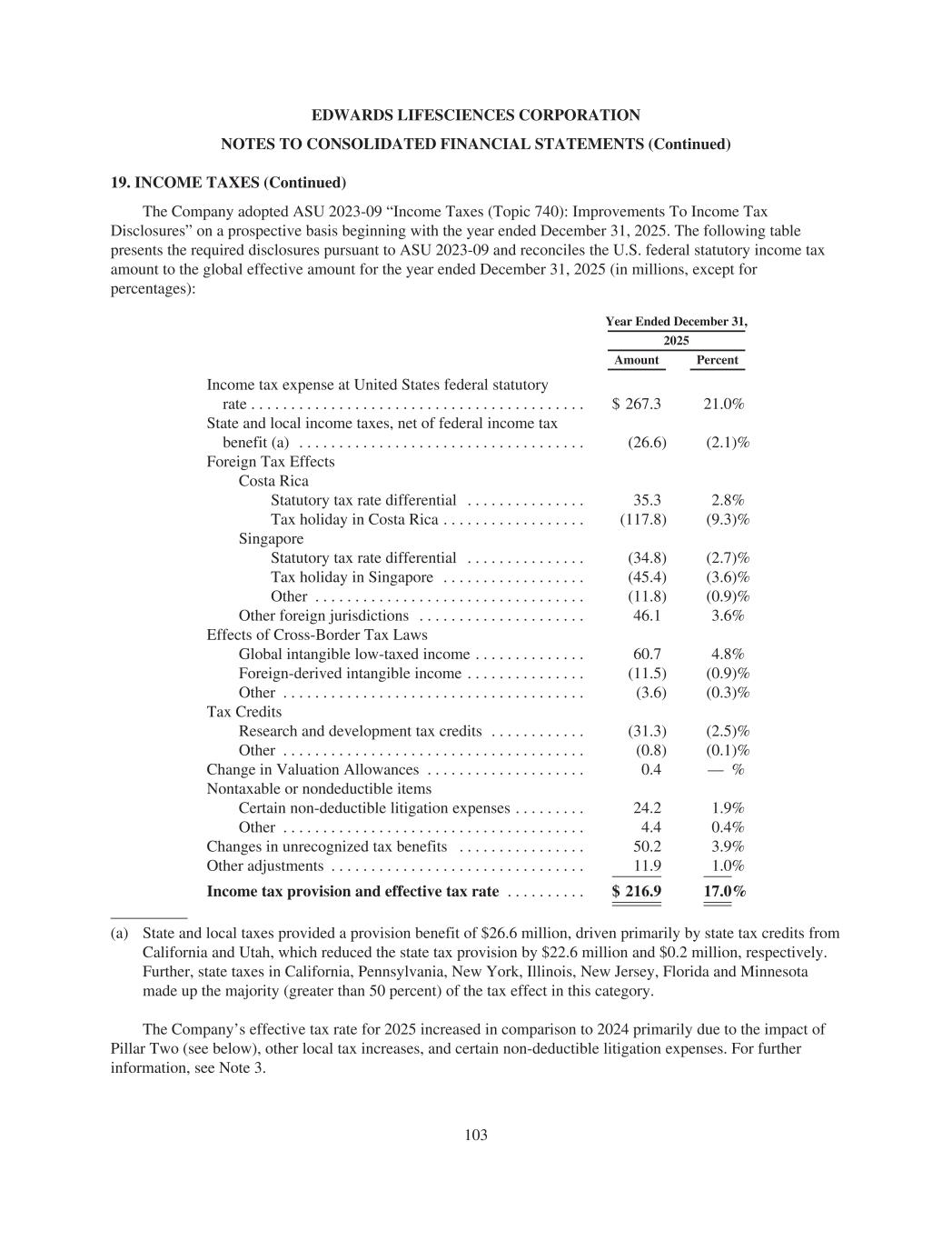 EDWARDS LIFESCIENCES CORPORATION NOTES TO CONSOLIDATED FINANCIAL STATEMENTS (Continued) 19. INCOME TAXES (Continued) The Company adopted ASU 2023-09 “Income Taxes (Topic 740): Improvements To Income Tax Disclosures” on a prospective basis beginning with the year ended December 31, 2025. The following table presents the required disclosures pursuant to ASU 2023-09 and reconciles the U.S. federal statutory income tax amount to the global effective amount for the year ended December 31, 2025 (in millions, except for percentages): Year Ended December 31, 2025 Amount Percent Income tax expense at United States federal statutory rate . . . . . . . . . . . . . . . . . . . . . . . . . . . . . . . . . . . . . . . . . . $ 267.3 21.0% State and local income taxes, net of federal income tax benefit (a) . . . . . . . . . . . . . . . . . . . . . . . . . . . . . . . . . . . . (26.6) (2.1)% Foreign Tax Effects Costa Rica Statutory tax rate differential . . . . . . . . . . . . . . . 35.3 2.8% Tax holiday in Costa Rica . . . . . . . . . . . . . . . . . . (117.8) (9.3)% Singapore Statutory tax rate differential . . . . . . . . . . . . . . . (34.8) (2.7)% Tax holiday in Singapore . . . . . . . . . . . . . . . . . . (45.4) (3.6)% Other . . . . . . . . . . . . . . . . . . . . . . . . . . . . . . . . . . (11.8) (0.9)% Other foreign jurisdictions . . . . . . . . . . . . . . . . . . . . . 46.1 3.6% Effects of Cross-Border Tax Laws Global intangible low-taxed income . . . . . . . . . . . . . . 60.7 4.8% Foreign-derived intangible income . . . . . . . . . . . . . . . (11.5) (0.9)% Other . . . . . . . . . . . . . . . . . . . . . . . . . . . . . . . . . . . . . . (3.6) (0.3)% Tax Credits Research and development tax credits . . . . . . . . . . . . (31.3) (2.5)% Other . . . . . . . . . . . . . . . . . . . . . . . . . . . . . . . . . . . . . . (0.8) (0.1)% Change in Valuation Allowances . . . . . . . . . . . . . . . . . . . . 0.4 — % Nontaxable or nondeductible items Certain non-deductible litigation expenses . . . . . . . . . 24.2 1.9% Other . . . . . . . . . . . . . . . . . . . . . . . . . . . . . . . . . . . . . . 4.4 0.4% Changes in unrecognized tax benefits . . . . . . . . . . . . . . . . 50.2 3.9% Other adjustments . . . . . . . . . . . . . . . . . . . . . . . . . . . . . . . . 11.9 1.0% Income tax provision and effective tax rate . . . . . . . . . . $ 216.9 17.0% (a) State and local taxes provided a provision benefit of $26.6 million, driven primarily by state tax credits from California and Utah, which reduced the state tax provision by $22.6 million and $0.2 million, respectively. Further, state taxes in California, Pennsylvania, New York, Illinois, New Jersey, Florida and Minnesota made up the majority (greater than 50 percent) of the tax effect in this category. The Company’s effective tax rate for 2025 increased in comparison to 2024 primarily due to the impact of Pillar Two (see below), other local tax increases, and certain non-deductible litigation expenses. For further information, see Note 3. 103