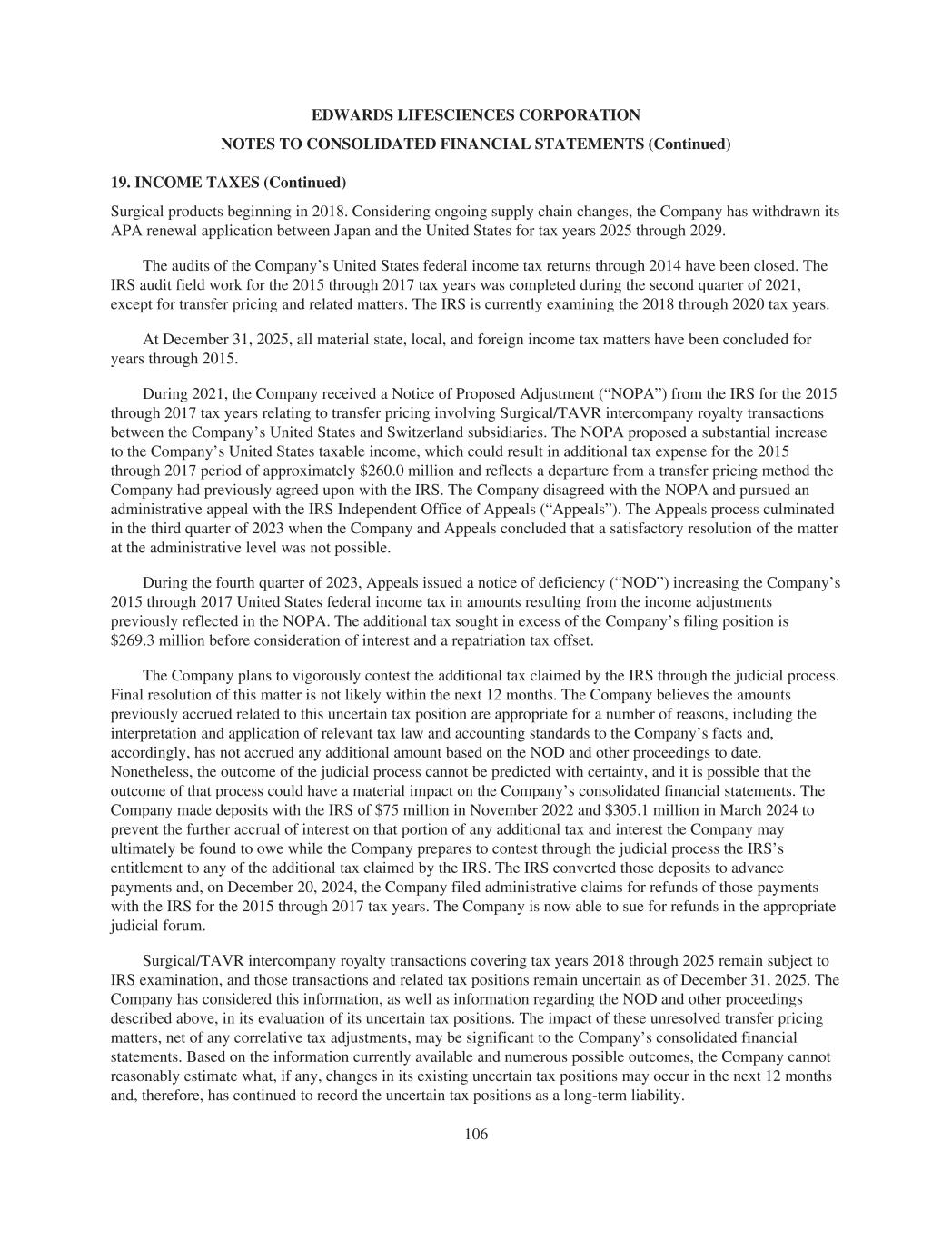 EDWARDS LIFESCIENCES CORPORATION NOTES TO CONSOLIDATED FINANCIAL STATEMENTS (Continued) 19. INCOME TAXES (Continued) Surgical products beginning in 2018. Considering ongoing supply chain changes, the Company has withdrawn its APA renewal application between Japan and the United States for tax years 2025 through 2029. The audits of the Company’s United States federal income tax returns through 2014 have been closed. The IRS audit field work for the 2015 through 2017 tax years was completed during the second quarter of 2021, except for transfer pricing and related matters. The IRS is currently examining the 2018 through 2020 tax years. At December 31, 2025, all material state, local, and foreign income tax matters have been concluded for years through 2015. During 2021, the Company received a Notice of Proposed Adjustment (“NOPA”) from the IRS for the 2015 through 2017 tax years relating to transfer pricing involving Surgical/TAVR intercompany royalty transactions between the Company’s United States and Switzerland subsidiaries. The NOPA proposed a substantial increase to the Company’s United States taxable income, which could result in additional tax expense for the 2015 through 2017 period of approximately $260.0 million and reflects a departure from a transfer pricing method the Company had previously agreed upon with the IRS. The Company disagreed with the NOPA and pursued an administrative appeal with the IRS Independent Office of Appeals (“Appeals”). The Appeals process culminated in the third quarter of 2023 when the Company and Appeals concluded that a satisfactory resolution of the matter at the administrative level was not possible. During the fourth quarter of 2023, Appeals issued a notice of deficiency (“NOD”) increasing the Company’s 2015 through 2017 United States federal income tax in amounts resulting from the income adjustments previously reflected in the NOPA. The additional tax sought in excess of the Company’s filing position is $269.3 million before consideration of interest and a repatriation tax offset. The Company plans to vigorously contest the additional tax claimed by the IRS through the judicial process. Final resolution of this matter is not likely within the next 12 months. The Company believes the amounts previously accrued related to this uncertain tax position are appropriate for a number of reasons, including the interpretation and application of relevant tax law and accounting standards to the Company’s facts and, accordingly, has not accrued any additional amount based on the NOD and other proceedings to date. Nonetheless, the outcome of the judicial process cannot be predicted with certainty, and it is possible that the outcome of that process could have a material impact on the Company’s consolidated financial statements. The Company made deposits with the IRS of $75 million in November 2022 and $305.1 million in March 2024 to prevent the further accrual of interest on that portion of any additional tax and interest the Company may ultimately be found to owe while the Company prepares to contest through the judicial process the IRS’s entitlement to any of the additional tax claimed by the IRS. The IRS converted those deposits to advance payments and, on December 20, 2024, the Company filed administrative claims for refunds of those payments with the IRS for the 2015 through 2017 tax years. The Company is now able to sue for refunds in the appropriate judicial forum. Surgical/TAVR intercompany royalty transactions covering tax years 2018 through 2025 remain subject to IRS examination, and those transactions and related tax positions remain uncertain as of December 31, 2025. The Company has considered this information, as well as information regarding the NOD and other proceedings described above, in its evaluation of its uncertain tax positions. The impact of these unresolved transfer pricing matters, net of any correlative tax adjustments, may be significant to the Company’s consolidated financial statements. Based on the information currently available and numerous possible outcomes, the Company cannot reasonably estimate what, if any, changes in its existing uncertain tax positions may occur in the next 12 months and, therefore, has continued to record the uncertain tax positions as a long-term liability. 106